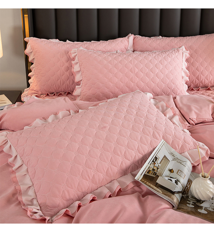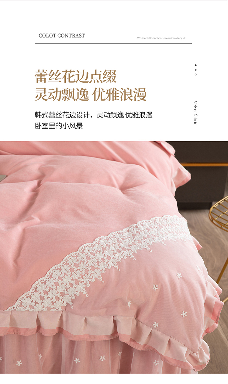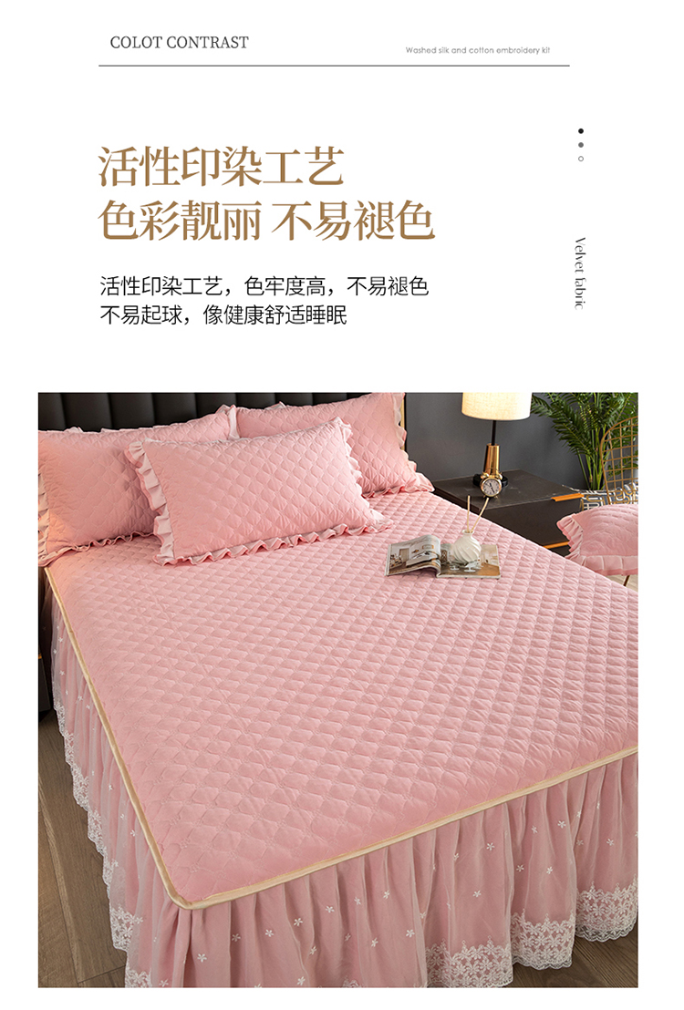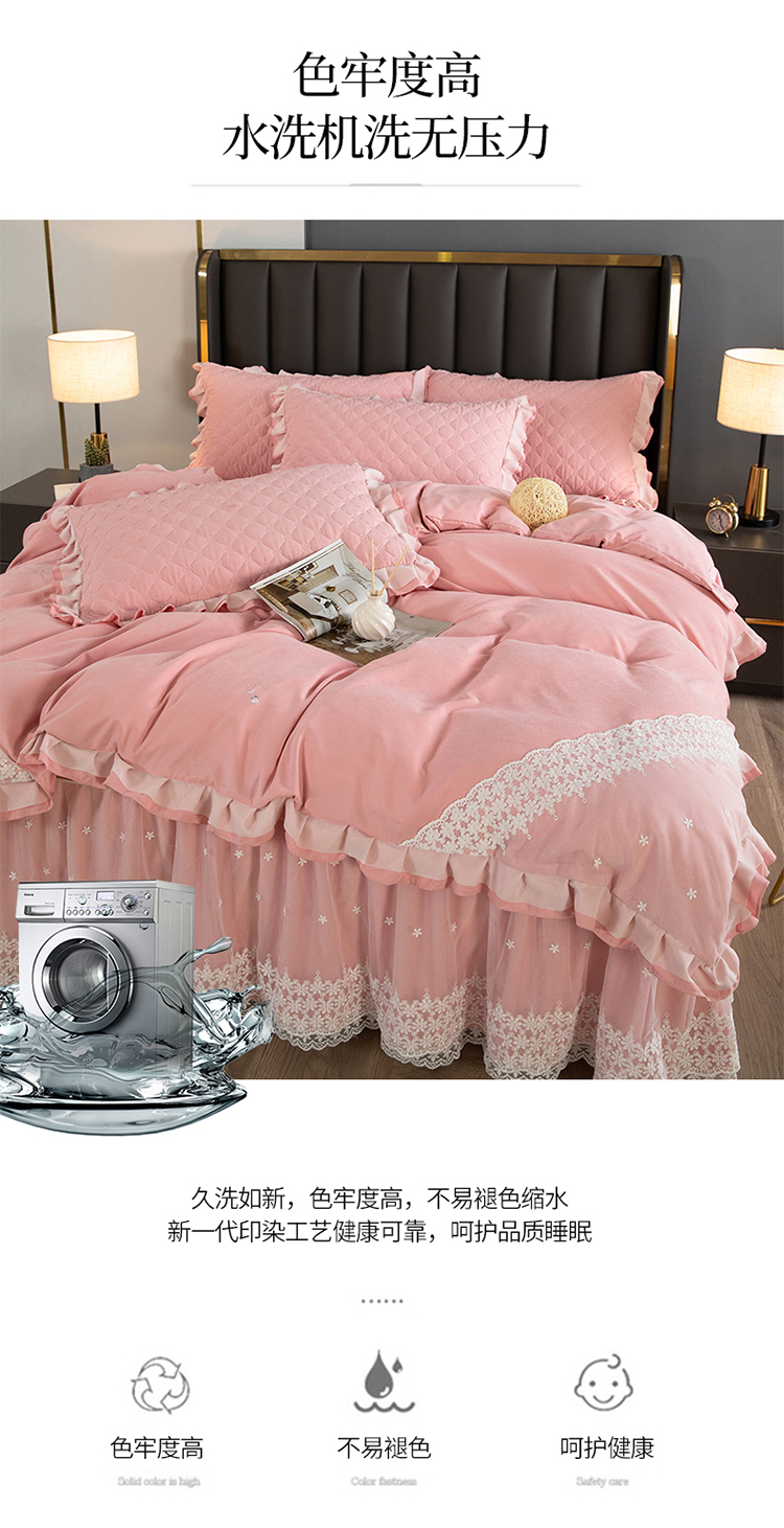 (总)2025新款纯色雕花全消光牛奶绒蕾丝绣花被套夹棉床裙 床盖款四件套(控价268),粉玉,米咖,天蓝,香芋紫,淡紫,豆纱色