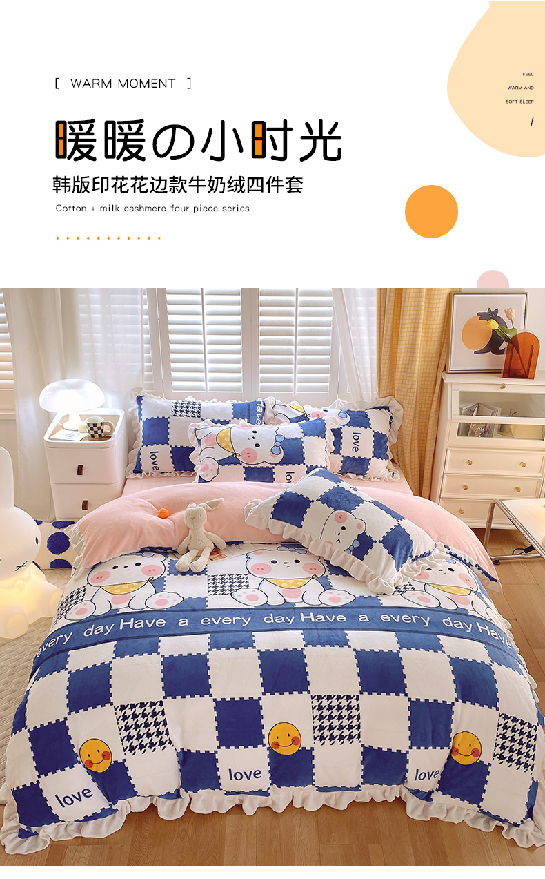 宜家坊 2023新款直播韩版印花花边款牛奶绒四件套 比格熊