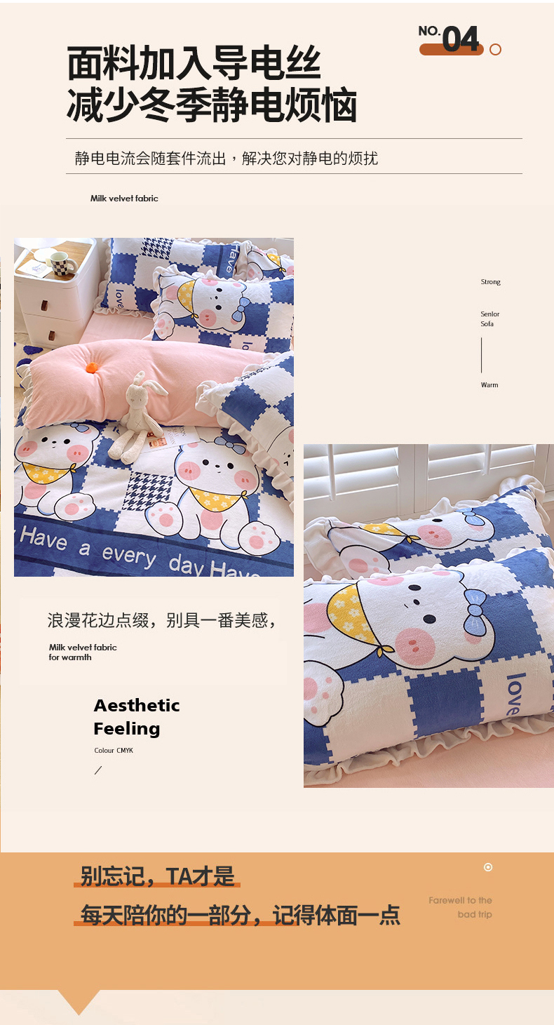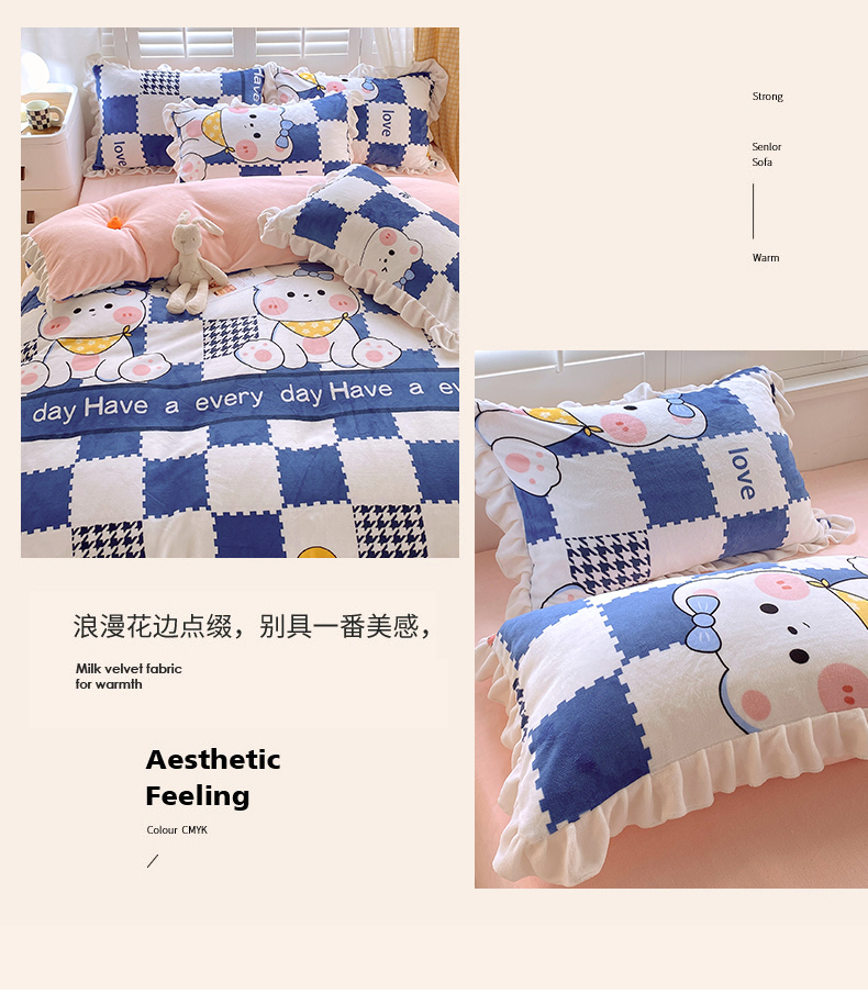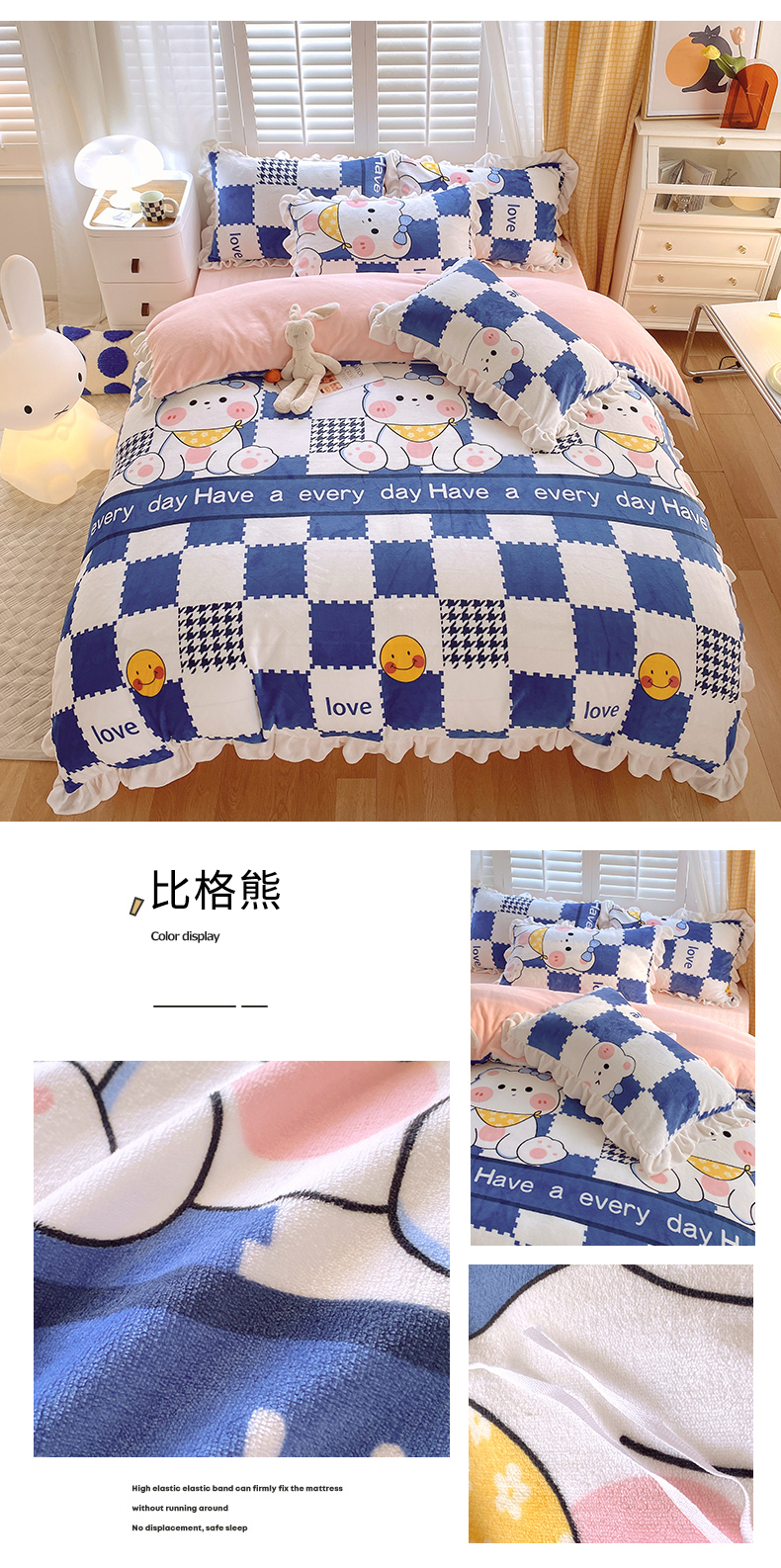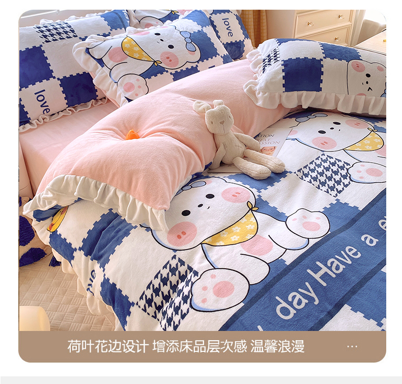 商品名称:宜家坊 2023新款直播韩版印花花边款牛奶绒四件套 比格熊