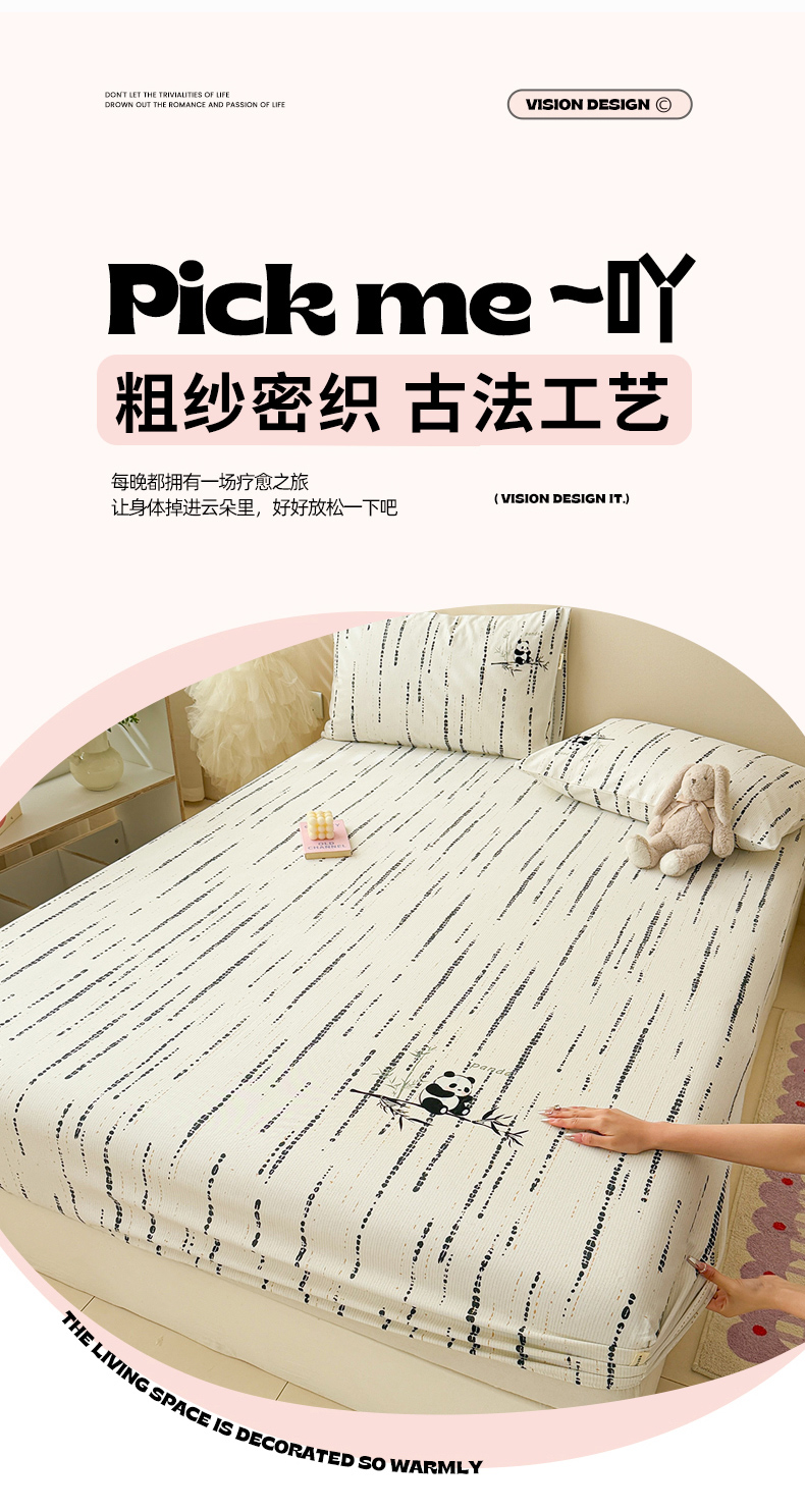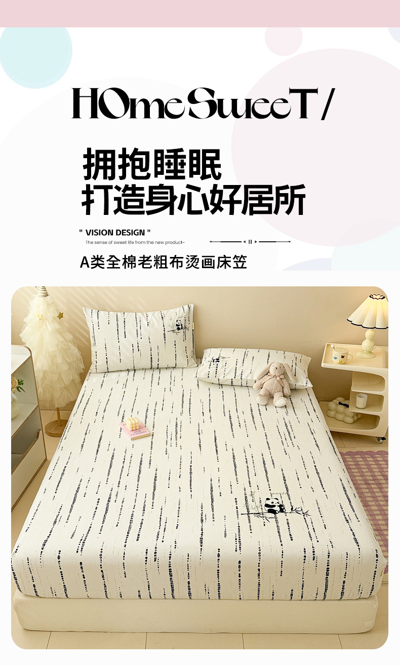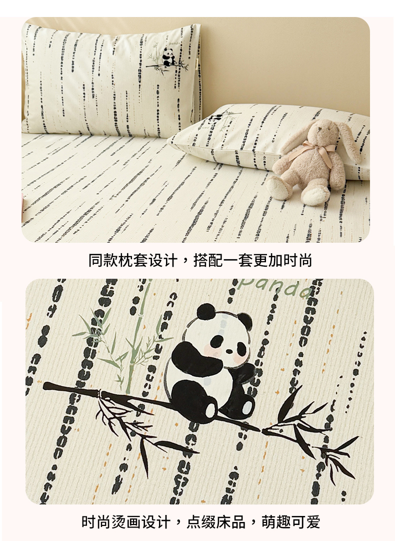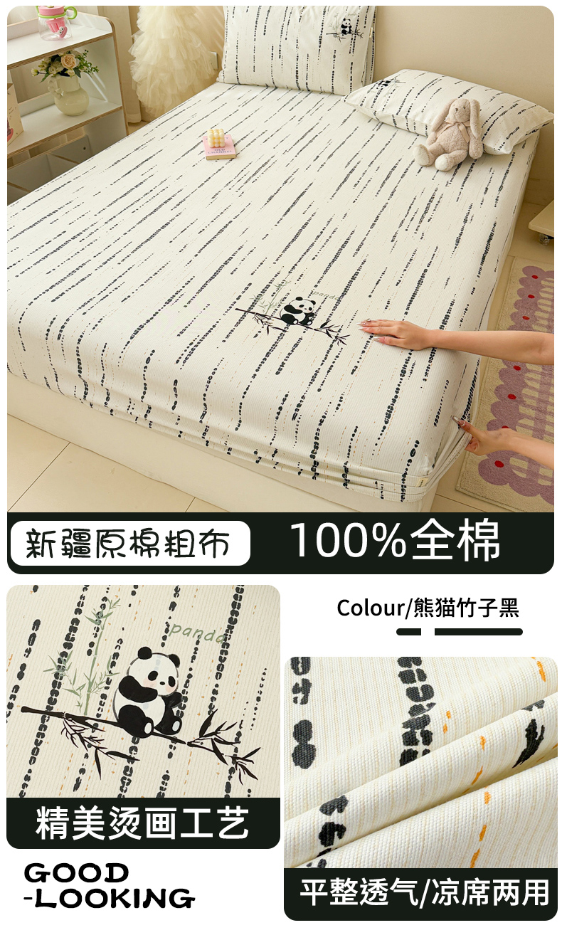 • 91家纺网 家纺一手货源 找家纺 沐辰 2025春夏新款A类全棉纯棉老粗布烫画单品床笠 床笠单件 熊猫竹子-黑