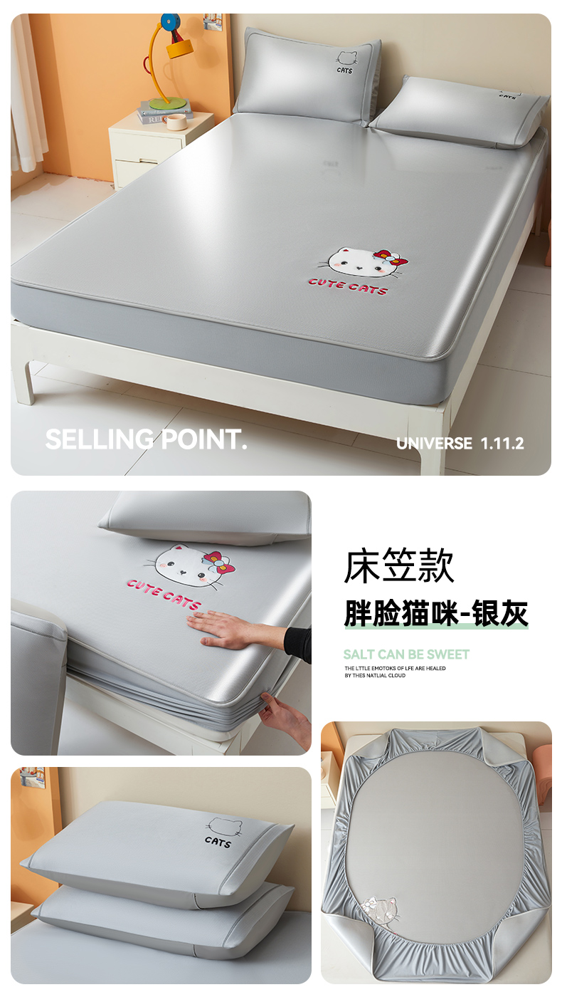 当前位置: 91家纺网 > 商品网购 > 床上用品 > 凉席 > 冰丝席 > 全季家居 2025新款5A抗菌碳光卡通贴布系列冰丝席 床笠款-胖脸猫咪-银灰