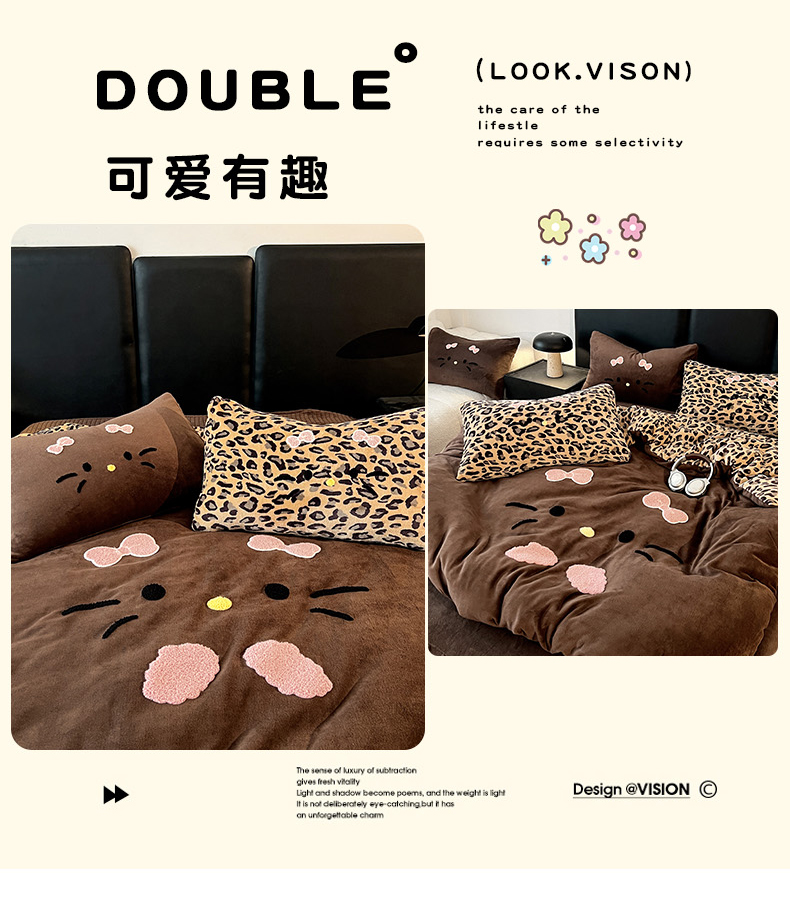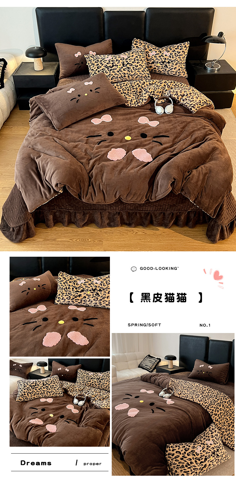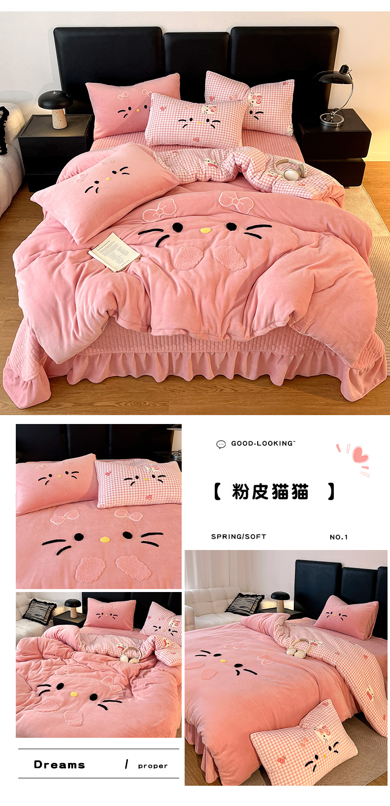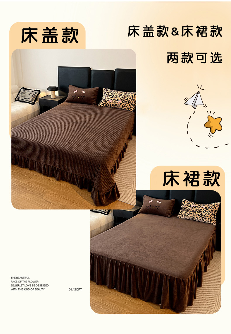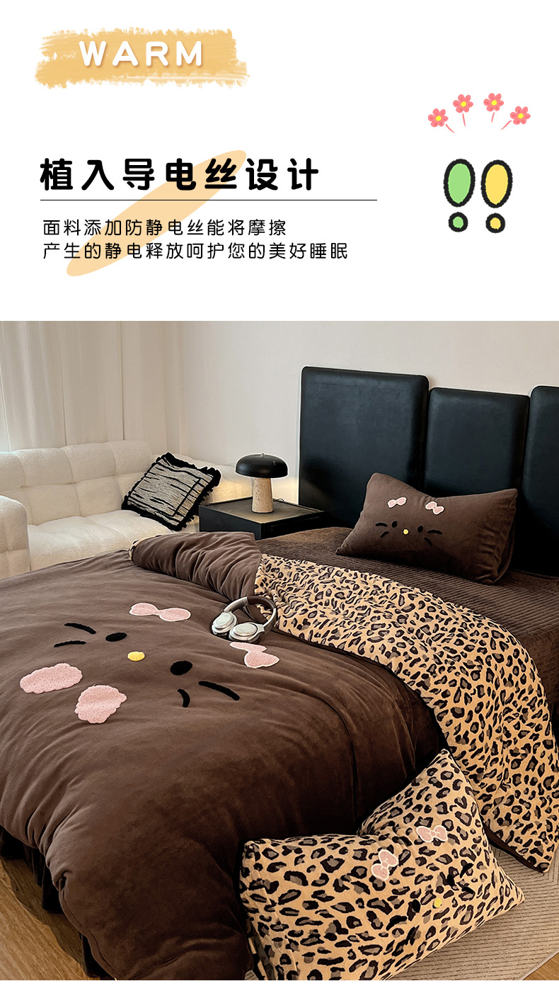 商品名称:富米莱(原臻工厂) 2025新款牛奶绒猫咪毛巾绣床盖床裙四件套 紫皮猫猫