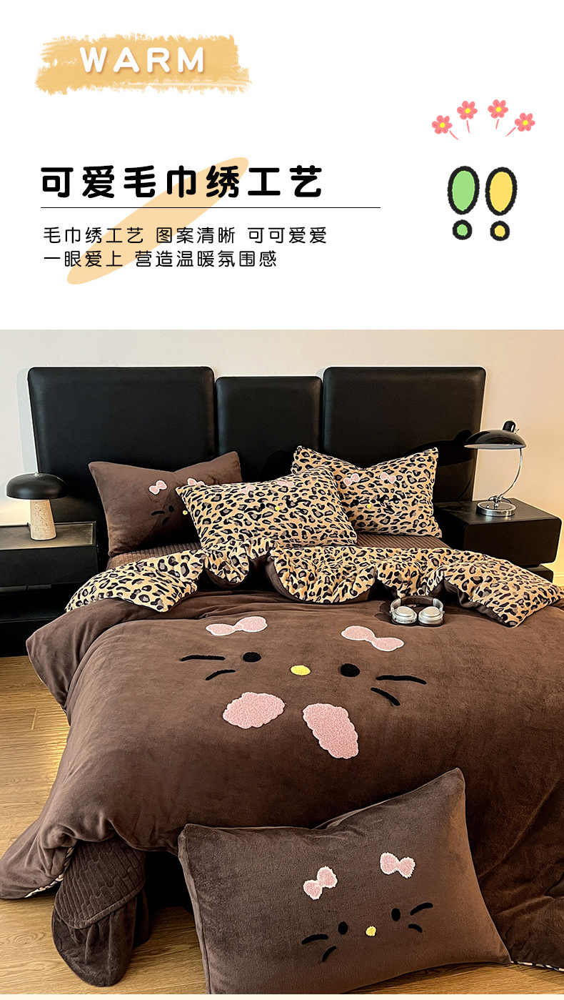 富米莱(原臻工厂) 2025新款牛奶绒猫咪毛巾绣床盖床裙四件套 紫皮猫猫