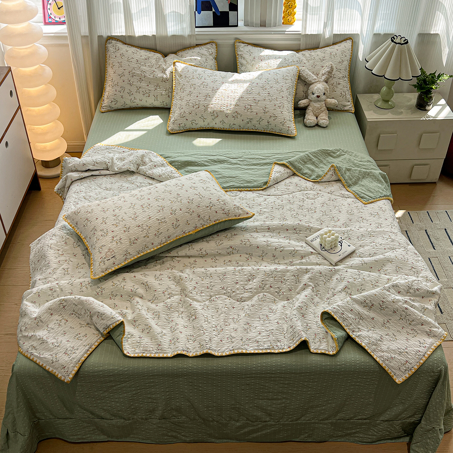 (总)仟网汇 2026新款贝壳边泡泡纱三角针夏被四件套--纯色系列,薄荷绿,抹茶绿,奶油粉,奶油黄,杏仁白,燕麦咖,芋泥紫,组合图仅供展示-不可下单