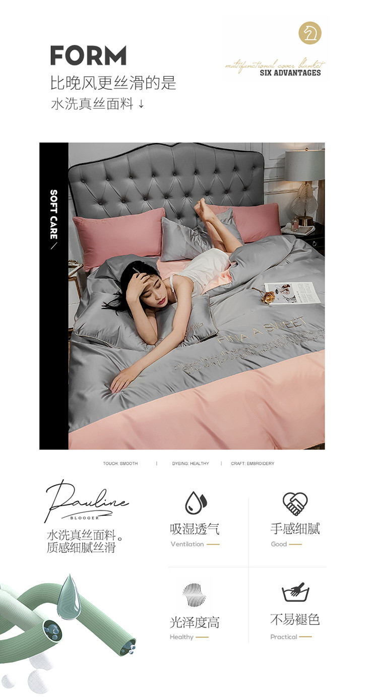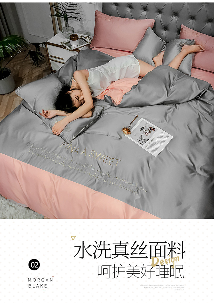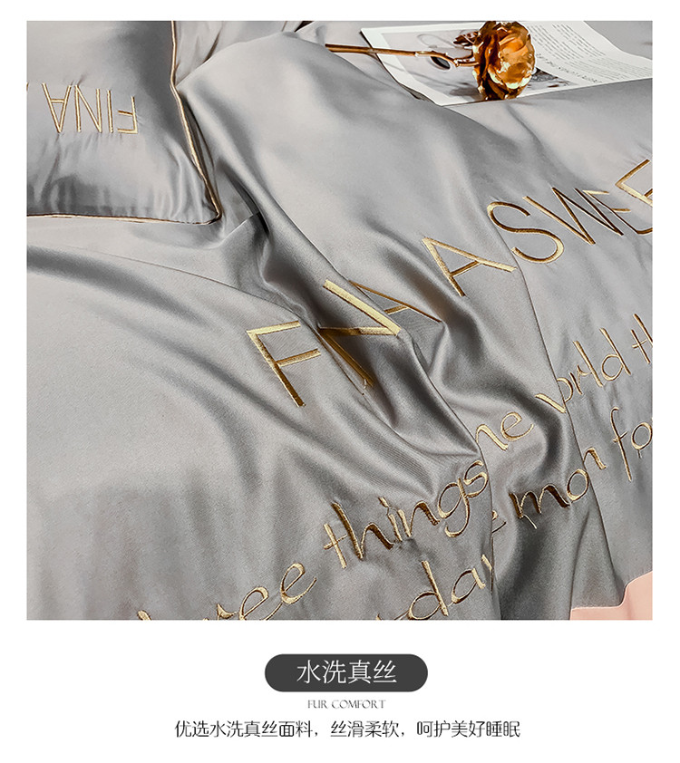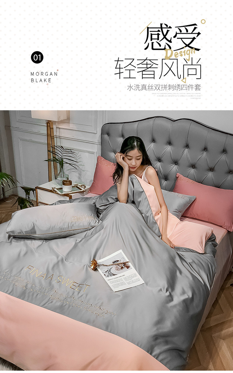 润缦 2020新款水洗真丝四件套双拼系列 浅灰+玫瑰粉