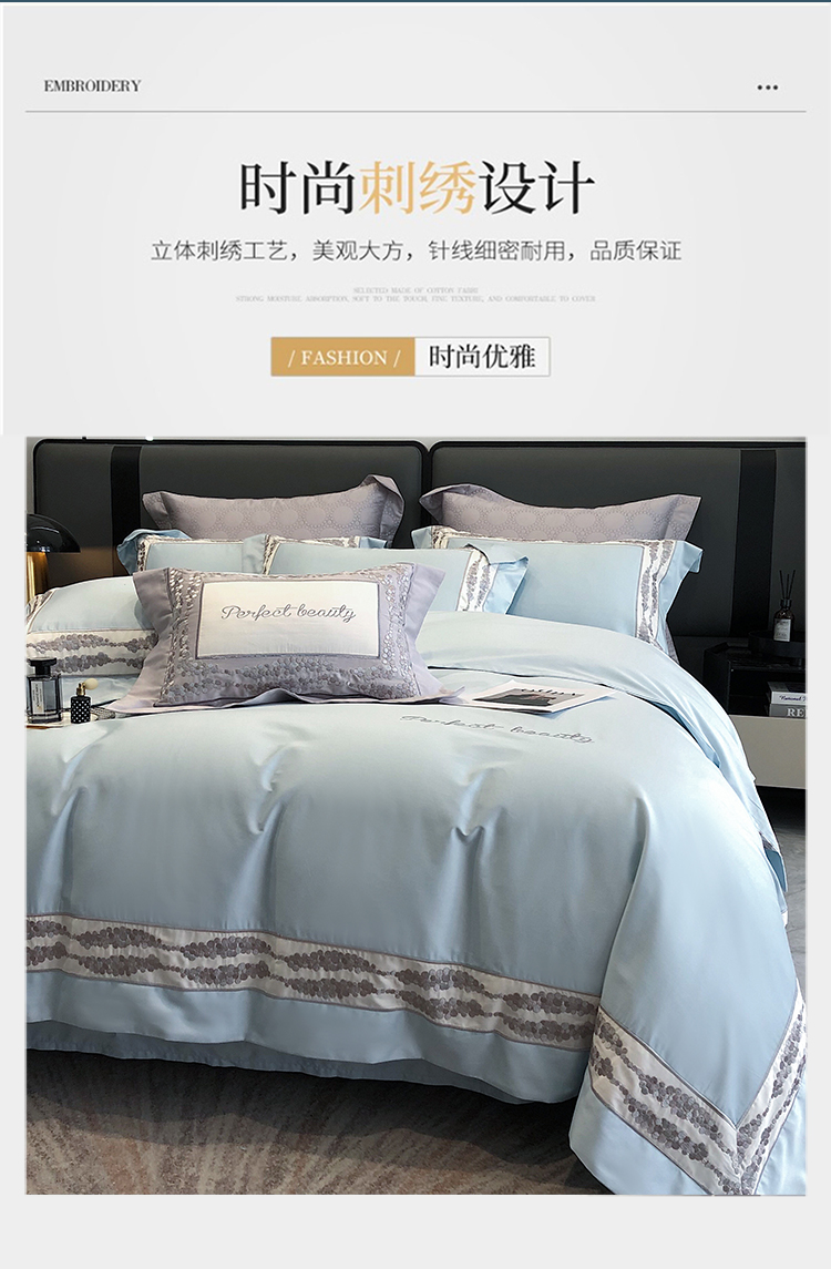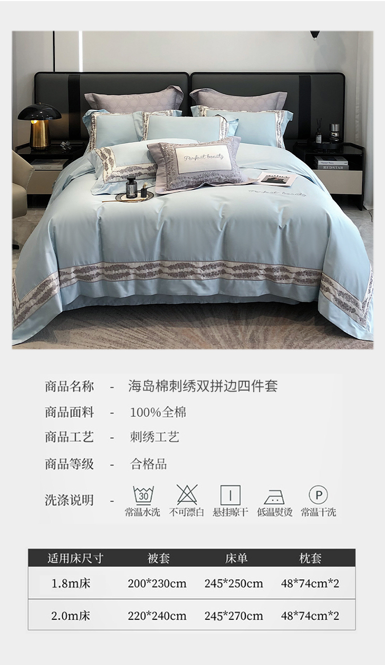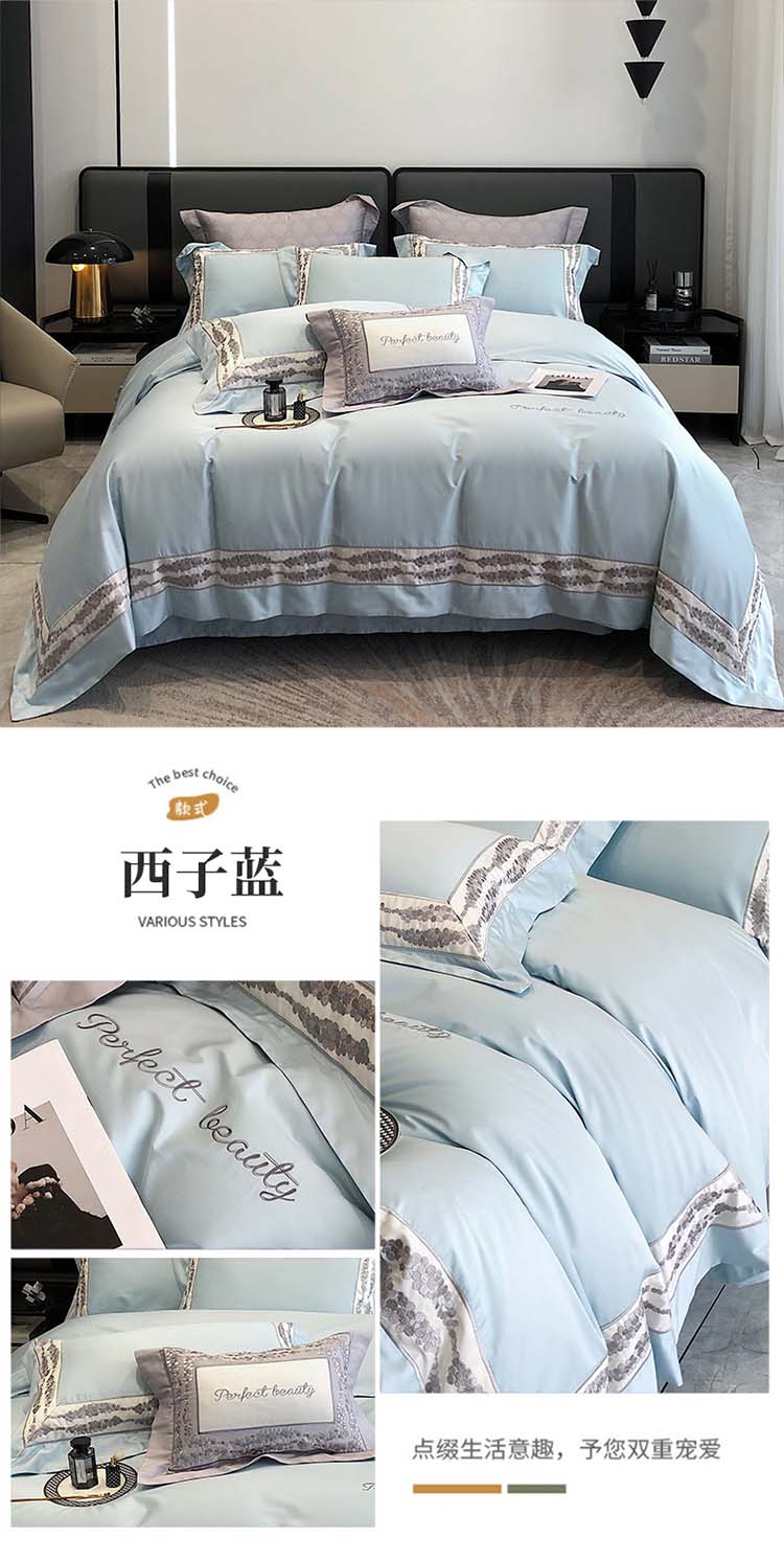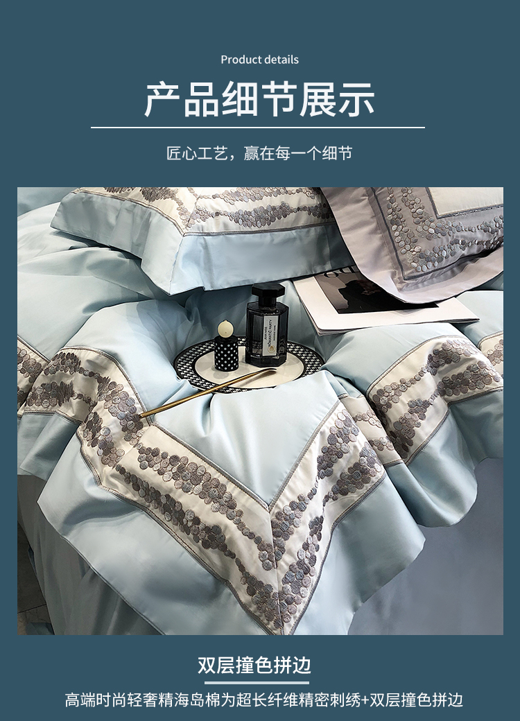 娇逸四季款新品100支海岛棉刺绣双拼边款四件套-波卡 波卡-西子蓝