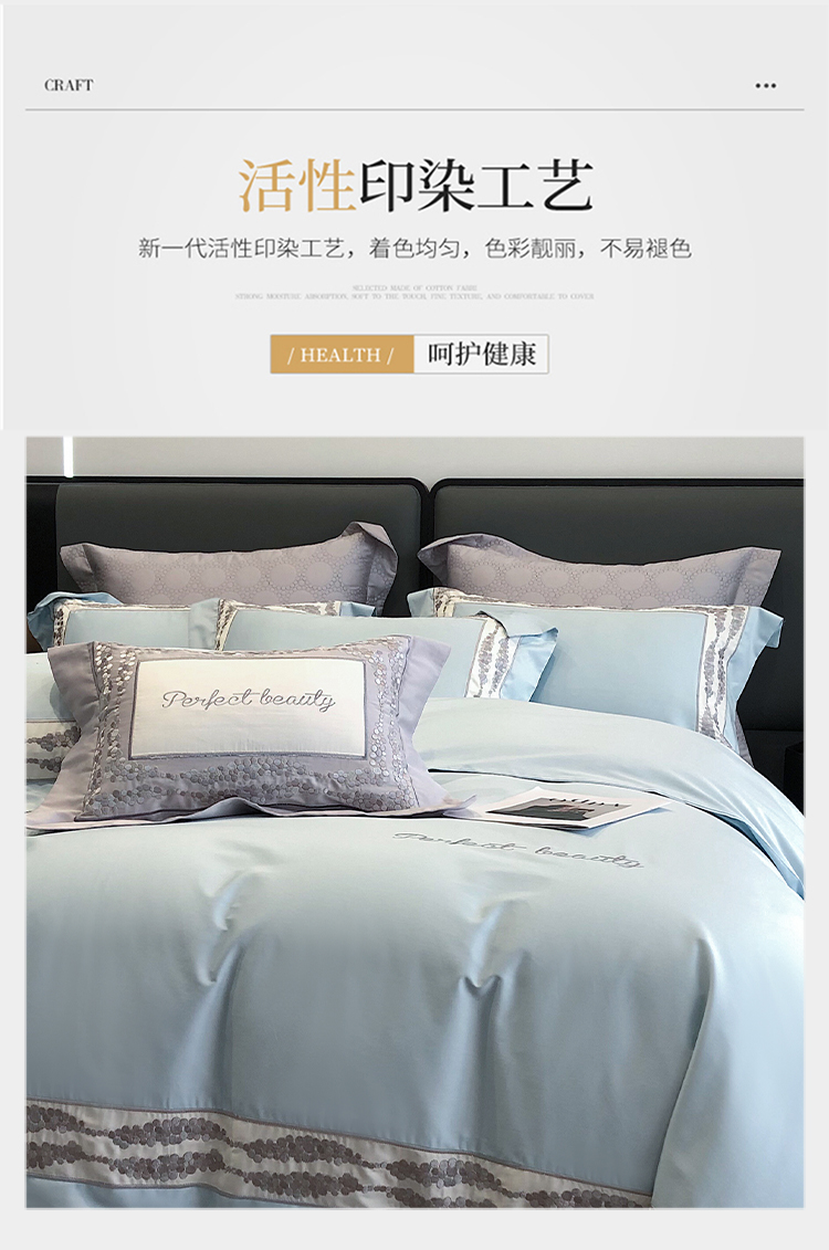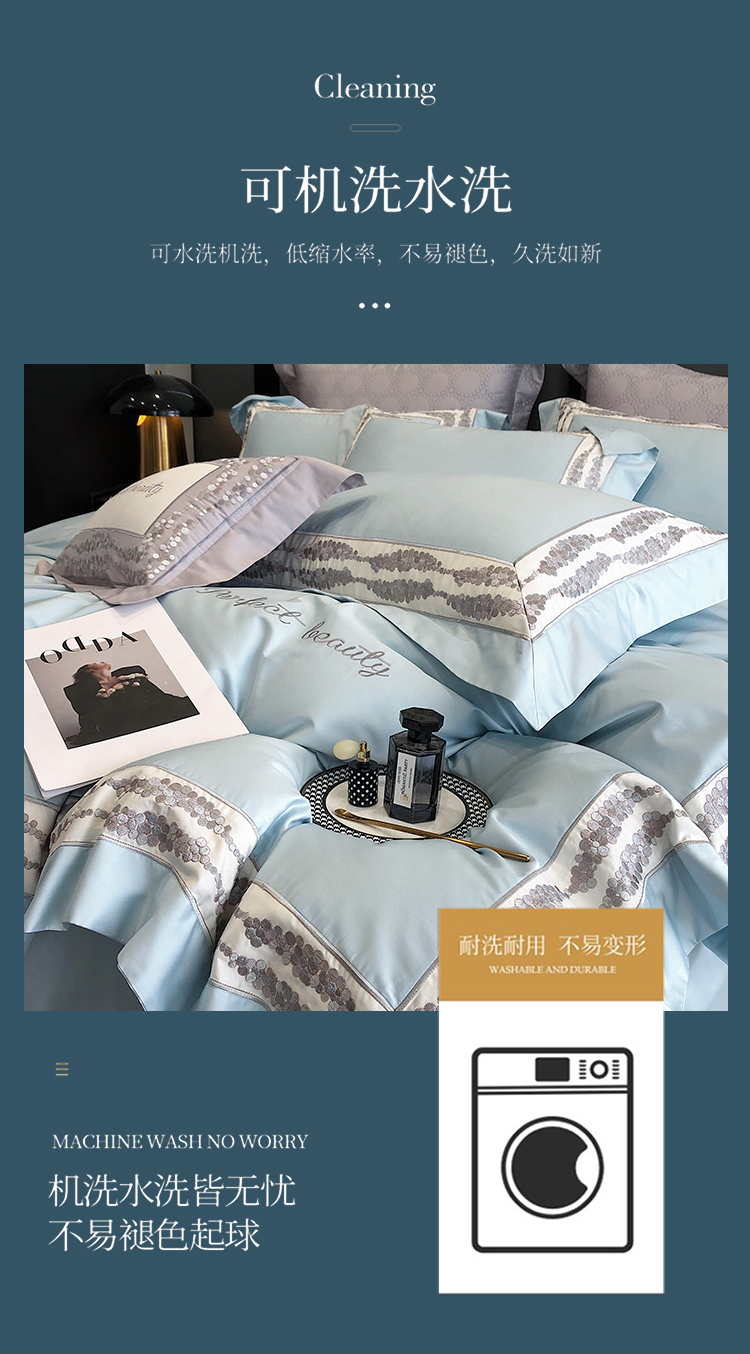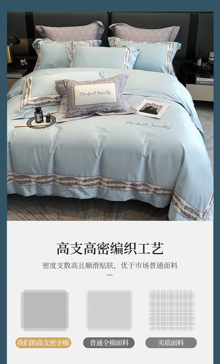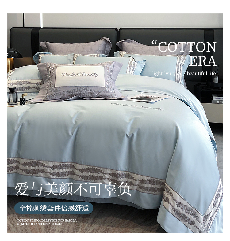 娇逸四季款新品100支海岛棉刺绣双拼边款四件套-波卡 波卡-西子蓝