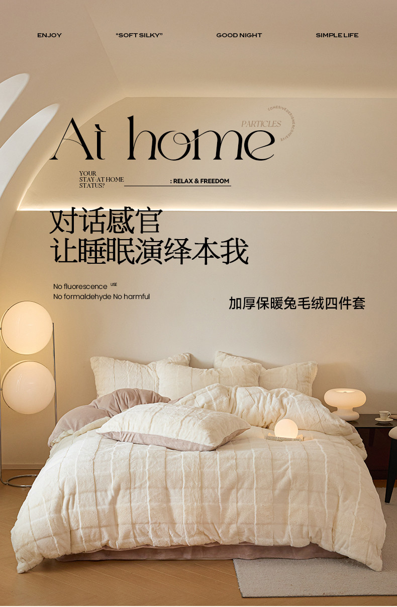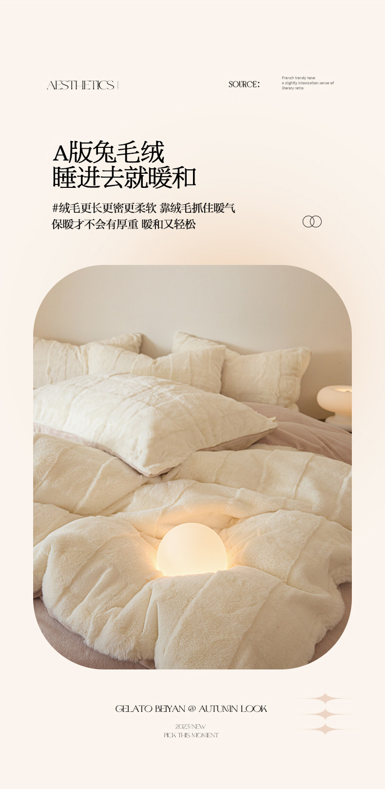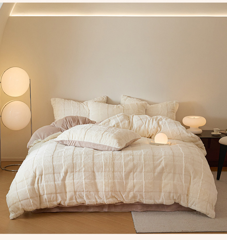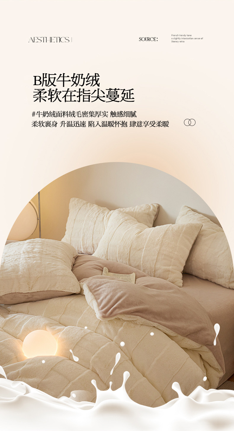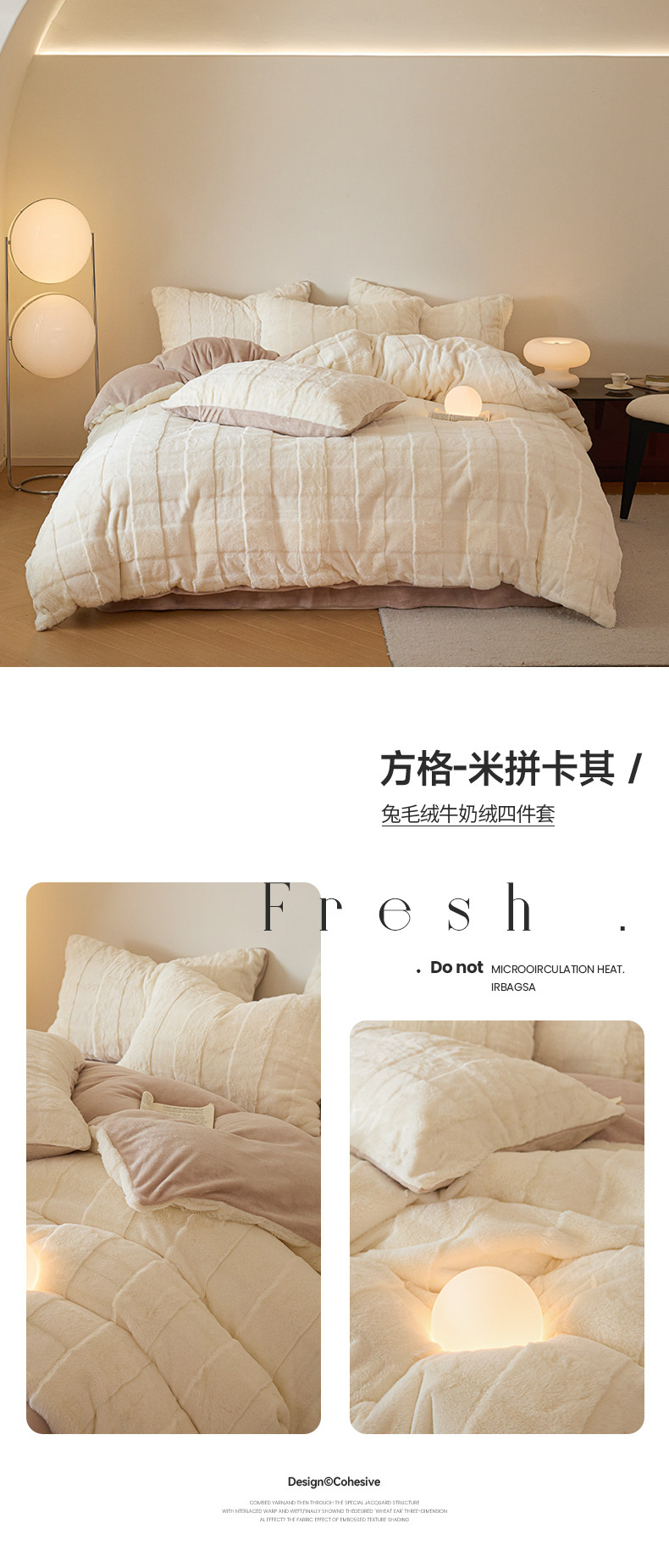 商品名称:沐棉 2023新款秋冬加厚保暖兔毛绒牛奶绒四件套 方格-米拼卡其