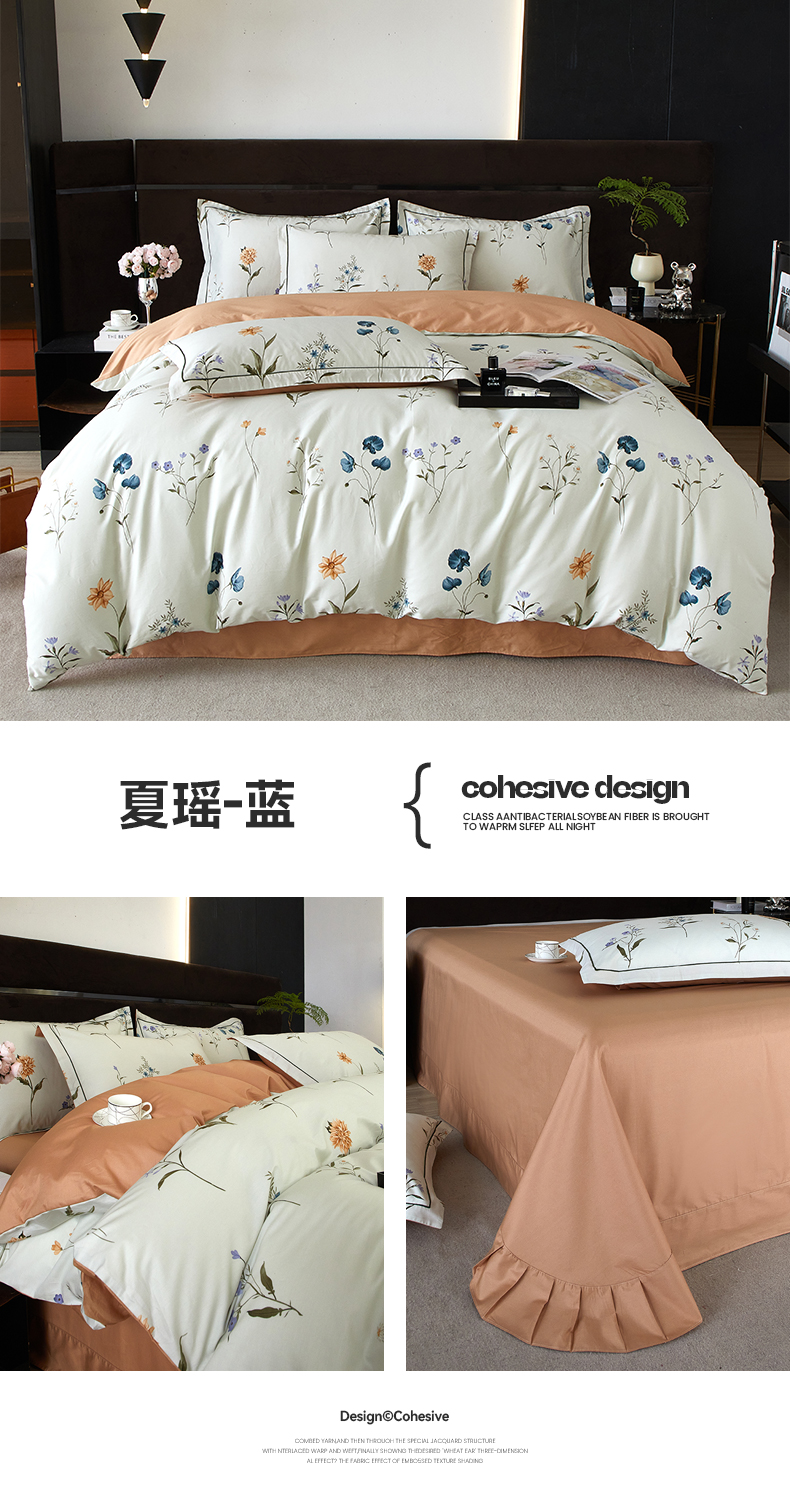 沐白 2024新款全棉全棉13376全活性印花黄金棉系列四件套 夏瑶-蓝