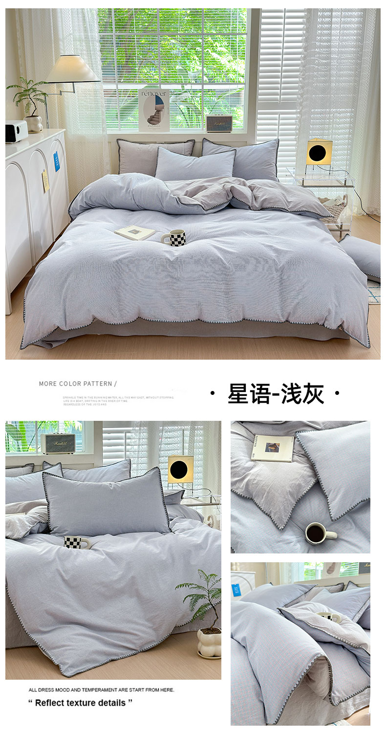 (总)晚依家纺 2024新款全棉色织水洗棉贝壳边绣三角针工艺四件套可定制,诺言-粉,诺言-蓝,诺言-绿,诺言-紫,时光-粉灰,时光-灰豆沙,时光-米灰,时光-浅蓝,星语-绿豆沙,星语-浅粉灰,星语-浅灰,遇见-草绿,遇见-蜜粉,遇见-浅蓝,遇见-中灰