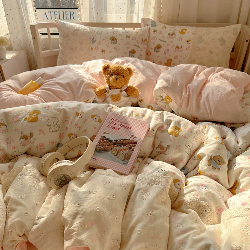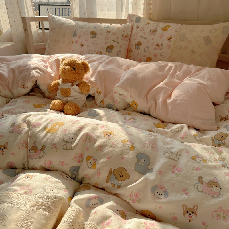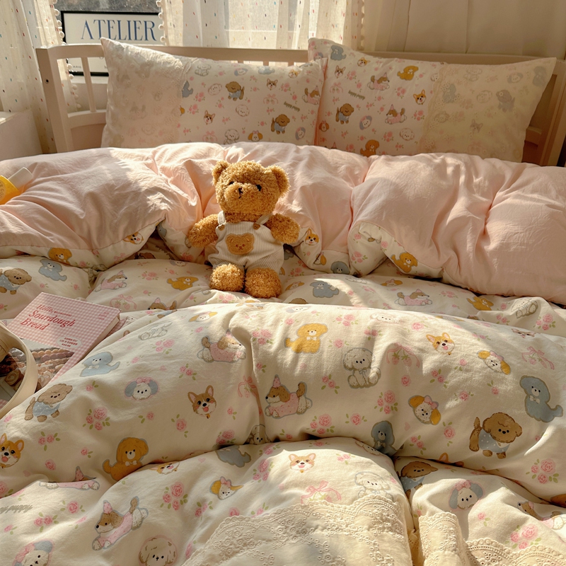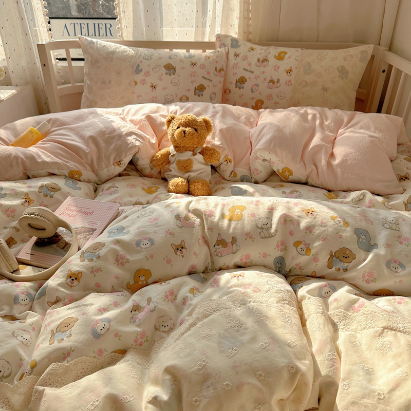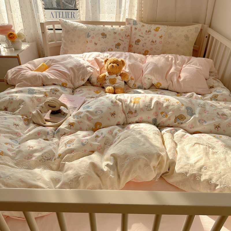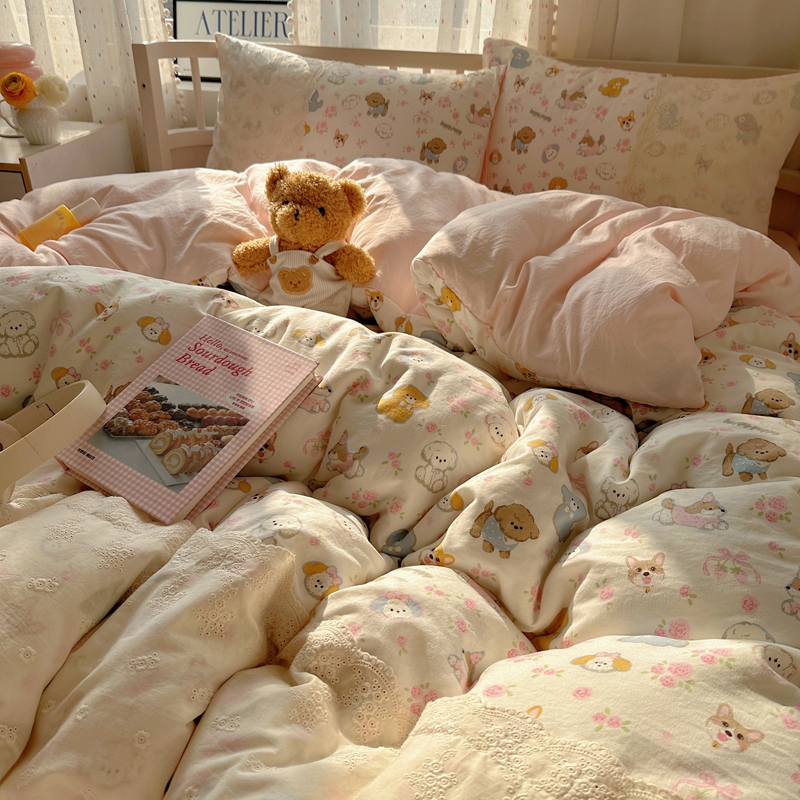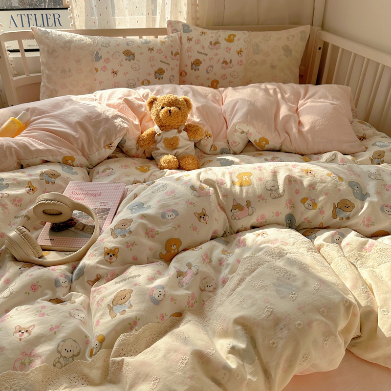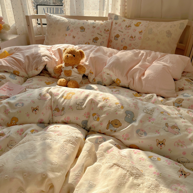 商品名称:顾里2025新款蕾丝花边云感双层纱套件四件套 碎花狗狗