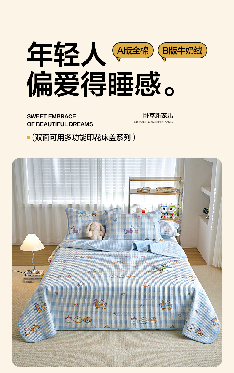 • 91家纺网 家纺一手货源 找家纺 (总)X猫先生 2026新品A全棉B牛奶绒床盖一面全棉一面牛奶绒床盖炕盖加厚床单床垫四季款系列三,焦糖南瓜格(A棉B棉),童年往事(A棉B绒),熊熊告白(A棉B绒),甜心汪星人(A棉B绒),星星柯基(A棉B绒),逗号日记(A棉B绒),莫奈花园(A棉B绒),幸运独角龙(A棉B绒),冒险家(A棉B绒),蘑菇小镇(A棉B绒),蓝格童话(A棉B绒),趴趴熊(A棉B绒),丹麦女孩(A棉B绒),春游兔兔(A棉B绒),贝利花都(A棉B绒),萌萌鸭(A棉B绒),花田囡囡(A棉B绒),哈哈狗(A棉B绒),丛草集(A棉B绒),奶呼小兔(A棉B绒),拉布兔兔(A棉B绒),繁花小熊(A棉B绒),甜心苹果派(A棉B绒),组合图
