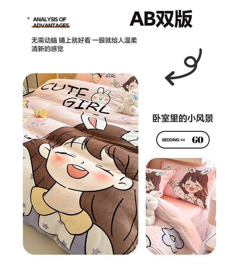 潮邦创意家居 2025新款大版卡通牛奶绒四件套 活泼女孩