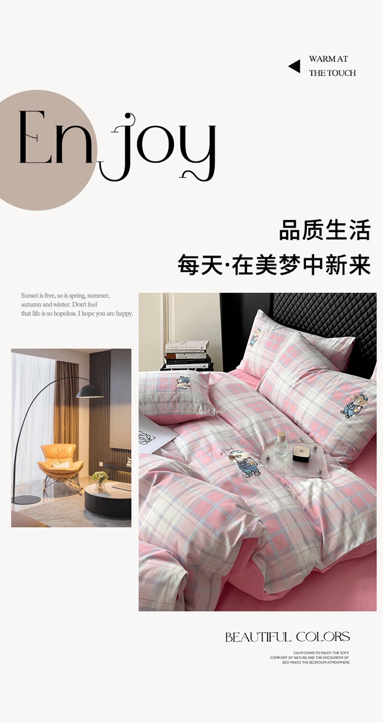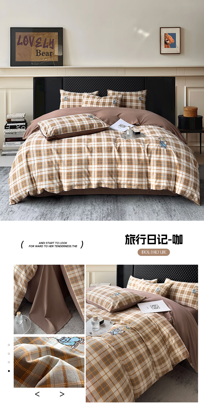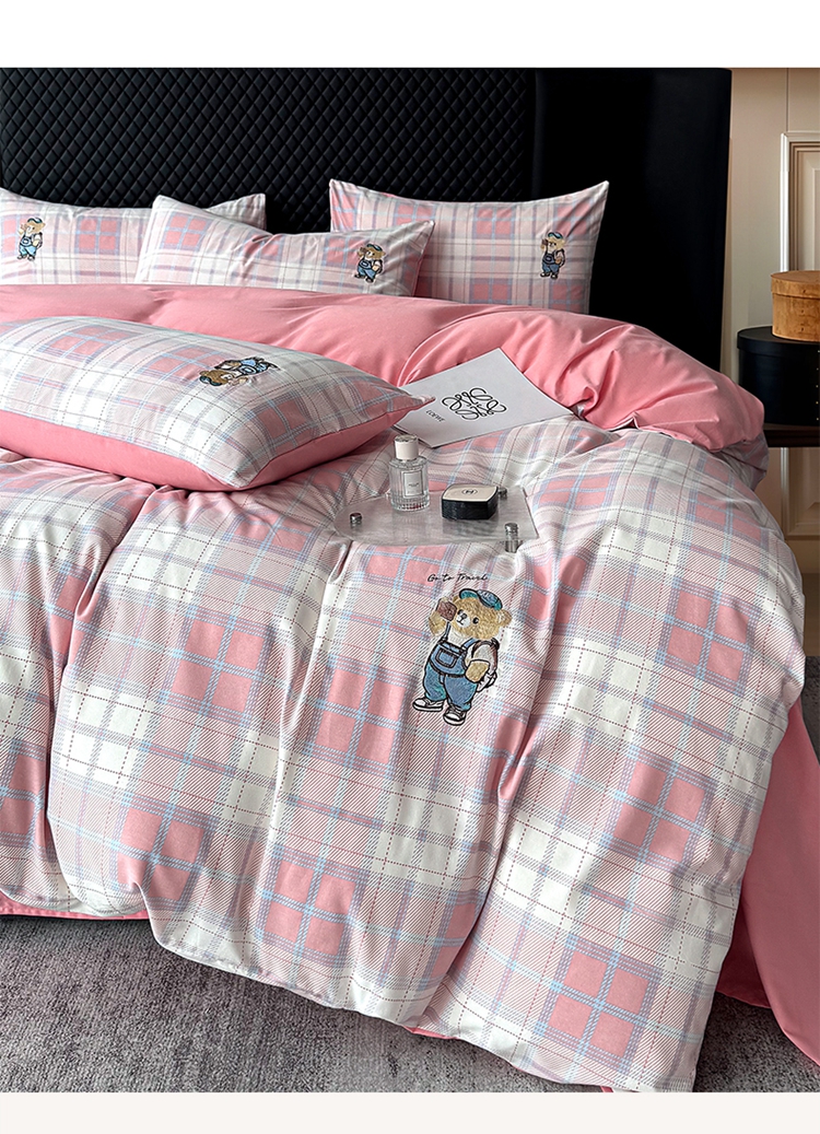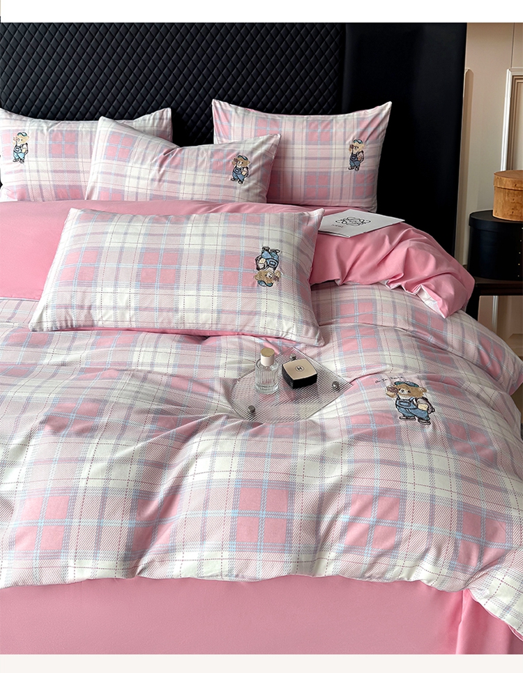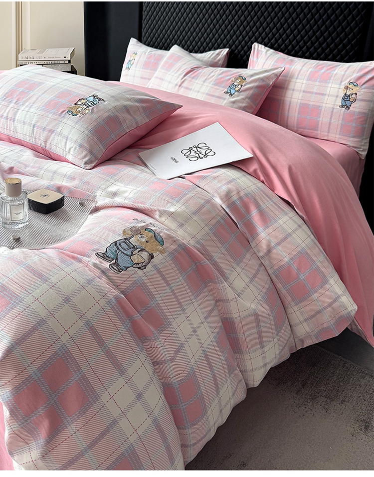 商品名称:朵希曼 2026新款全棉纯棉磨毛英伦风小熊绣花系列四件套 旅行日记粉