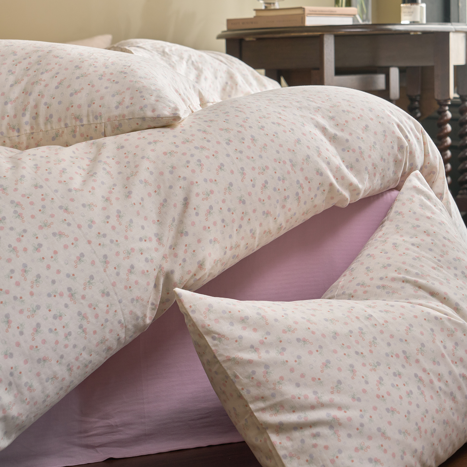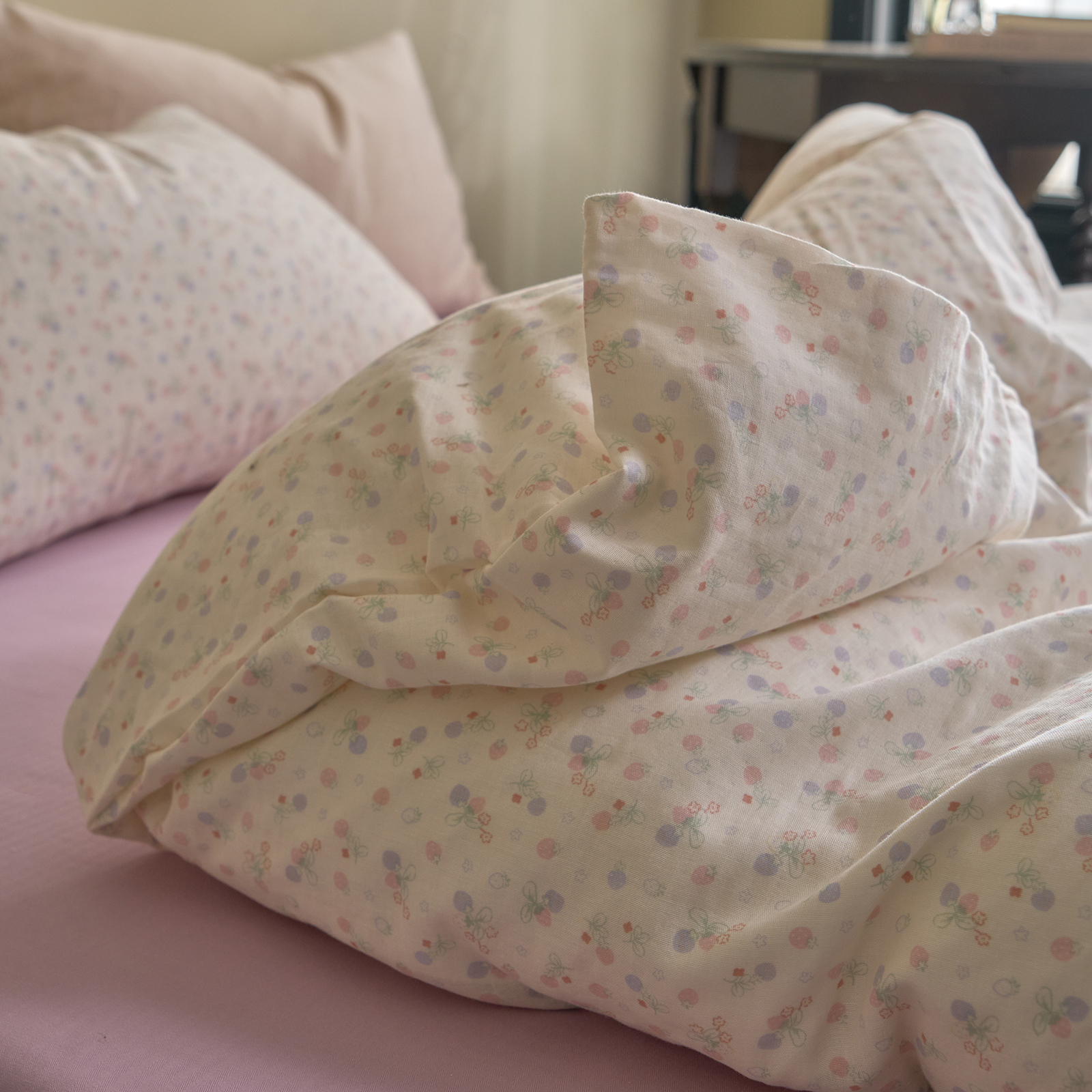 商品名称:洋铭区(原狠狠爱) 2026春季新款简约全棉 无边双层纱 四件套系列 多多小草莓