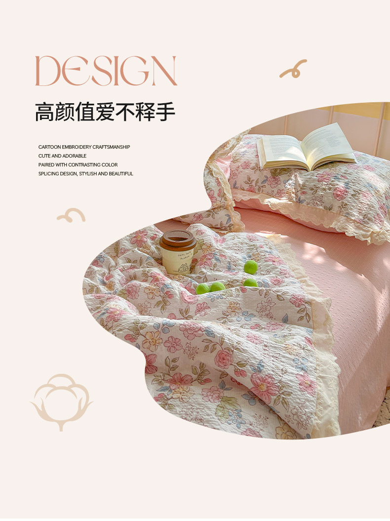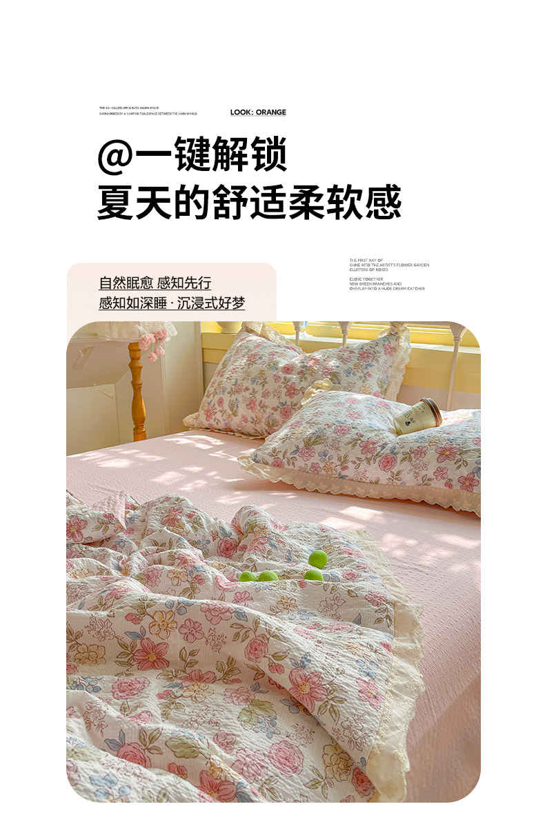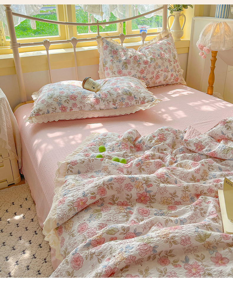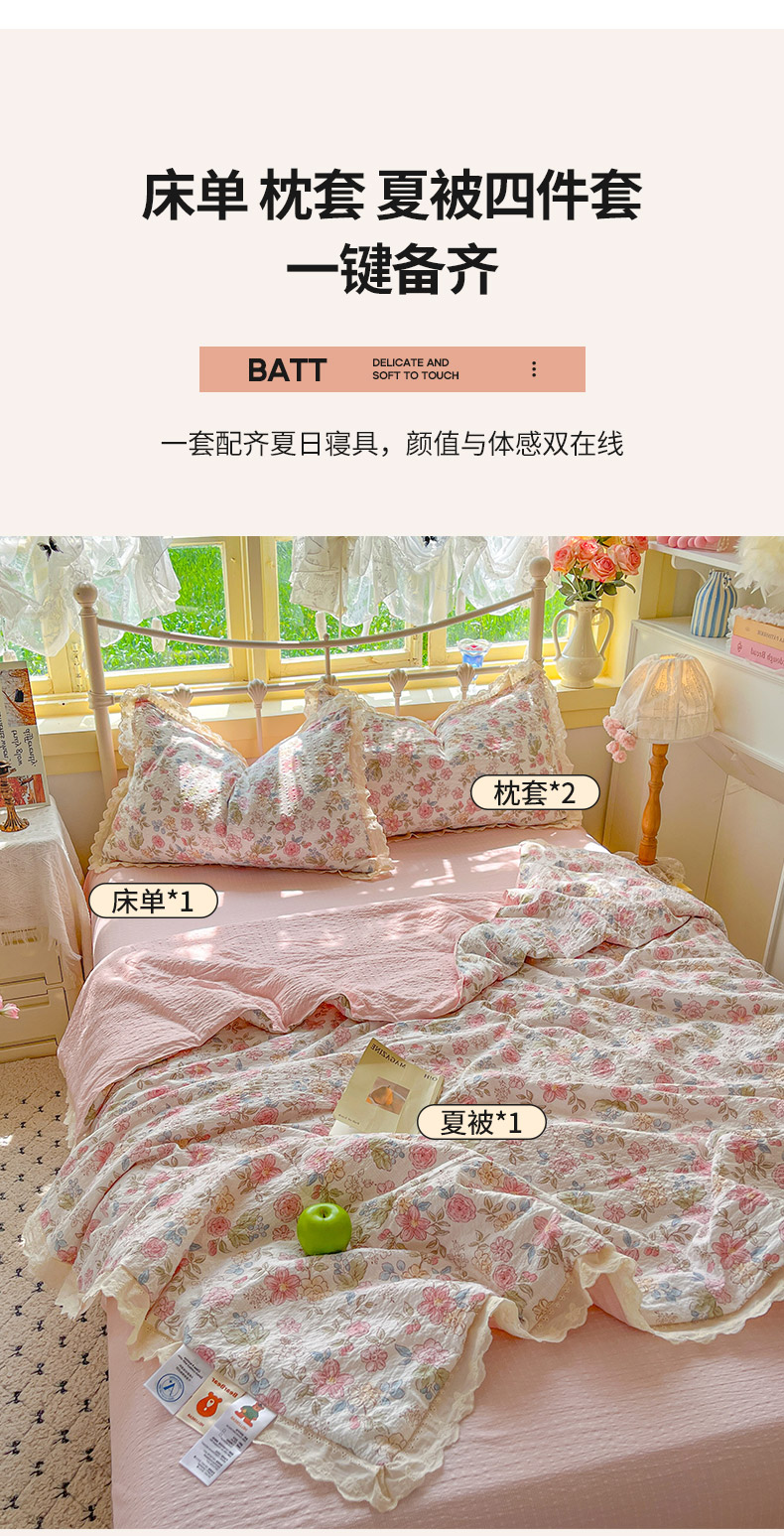 商品名称:金梦拉家纺 2026新款全棉花边系列泡芙纱泡泡纱夏被夏凉被空调被四件套 柔韵粉樱