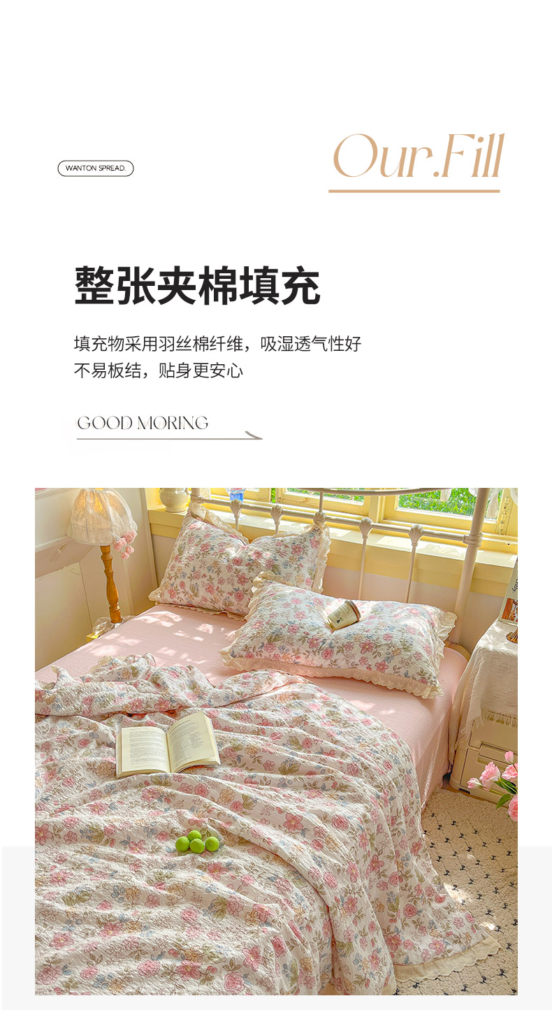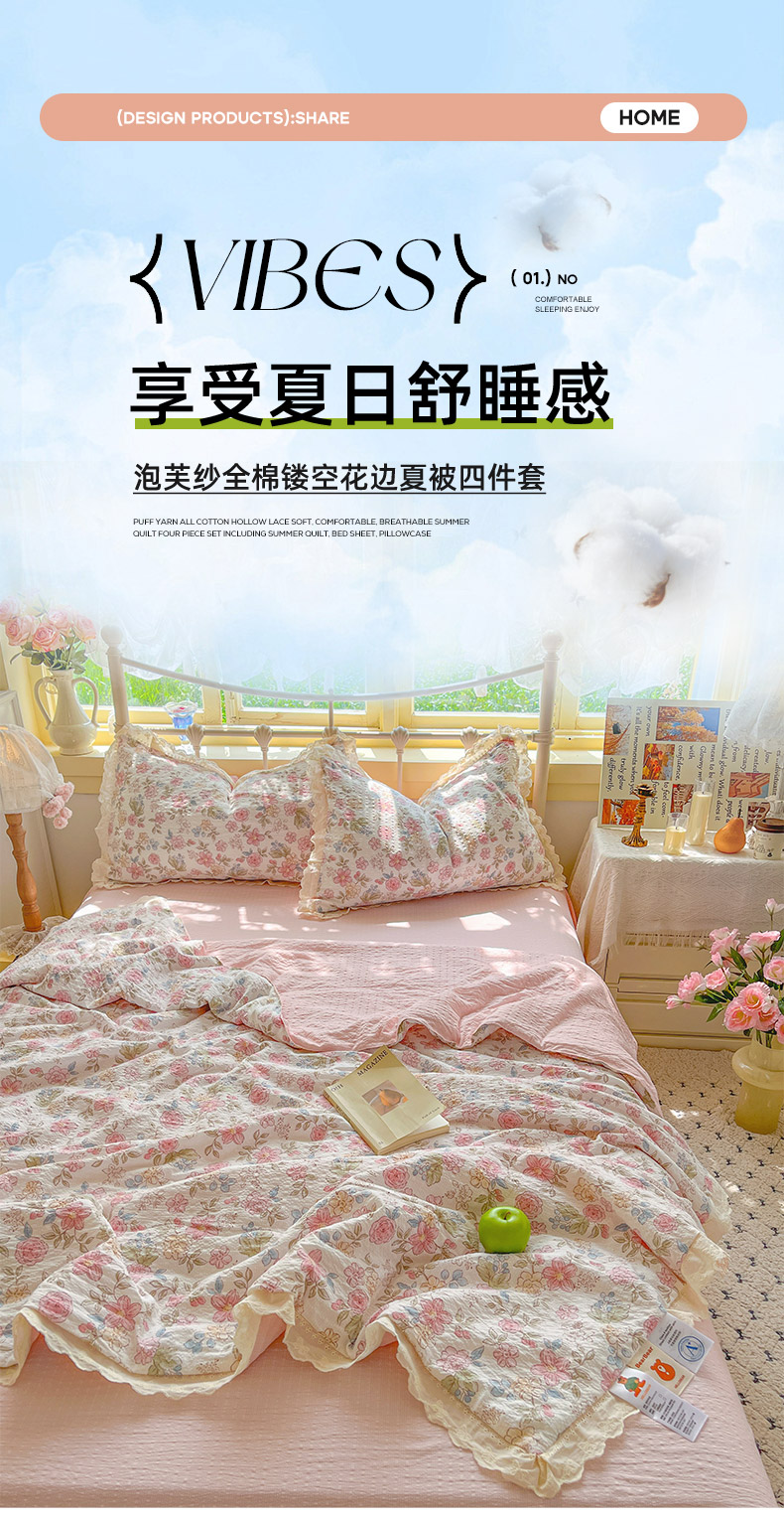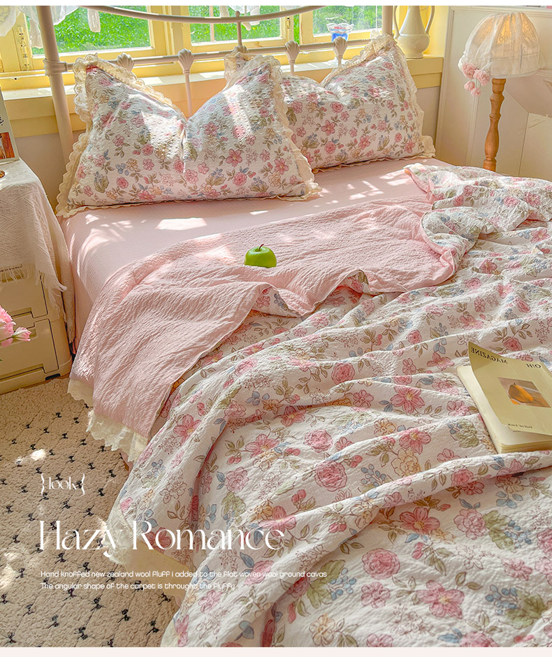 商品名称:金梦拉家纺 2026新款全棉花边系列泡芙纱泡泡纱夏被夏凉被空调被四件套 柔韵粉樱