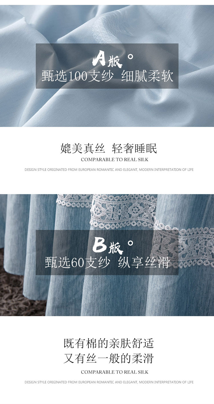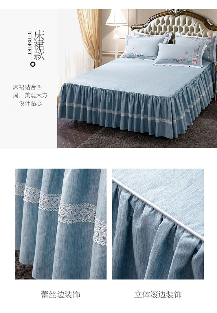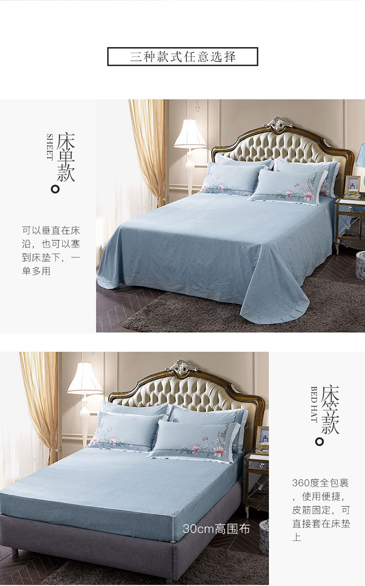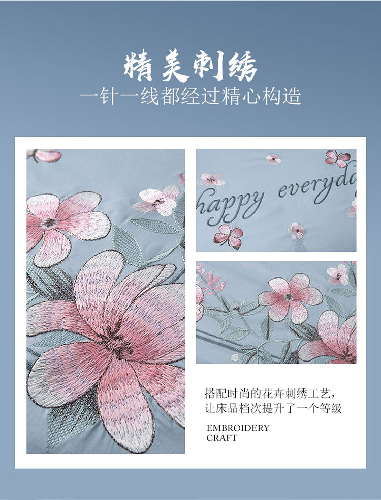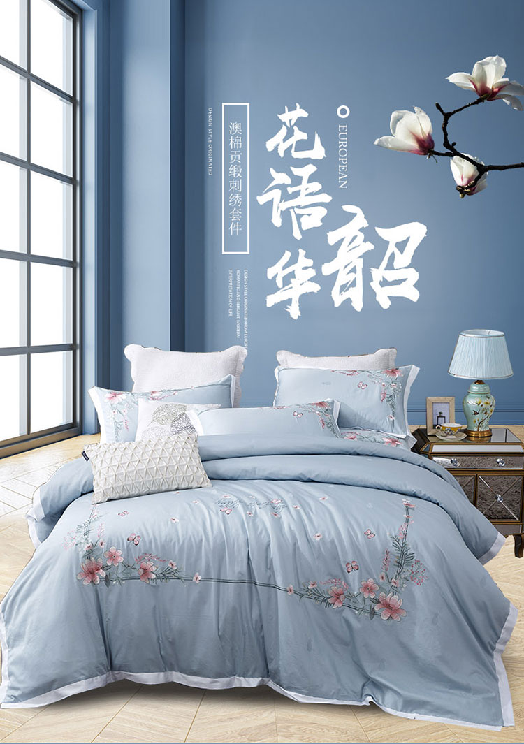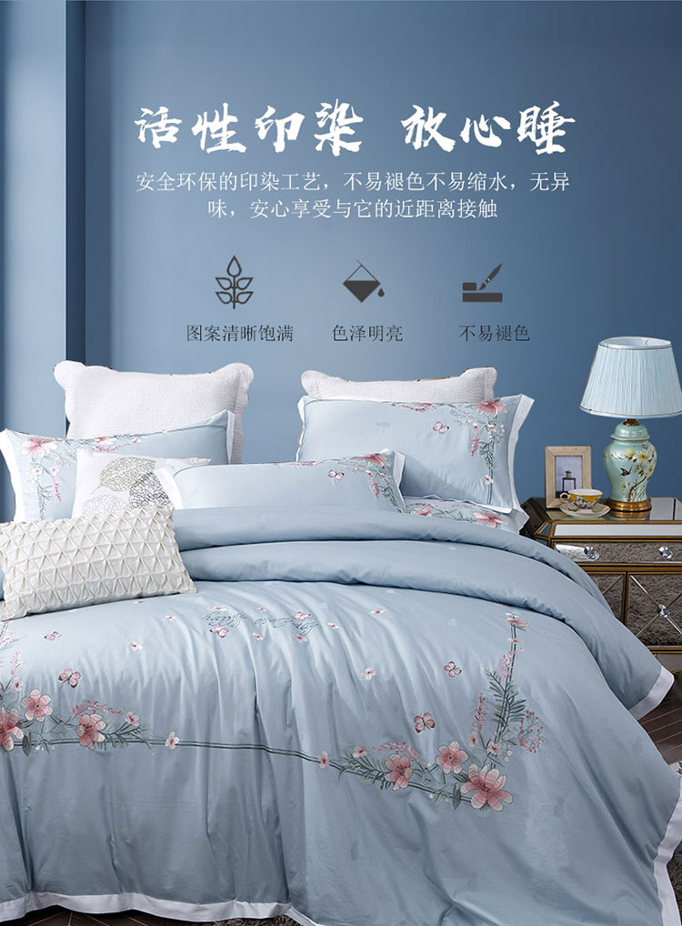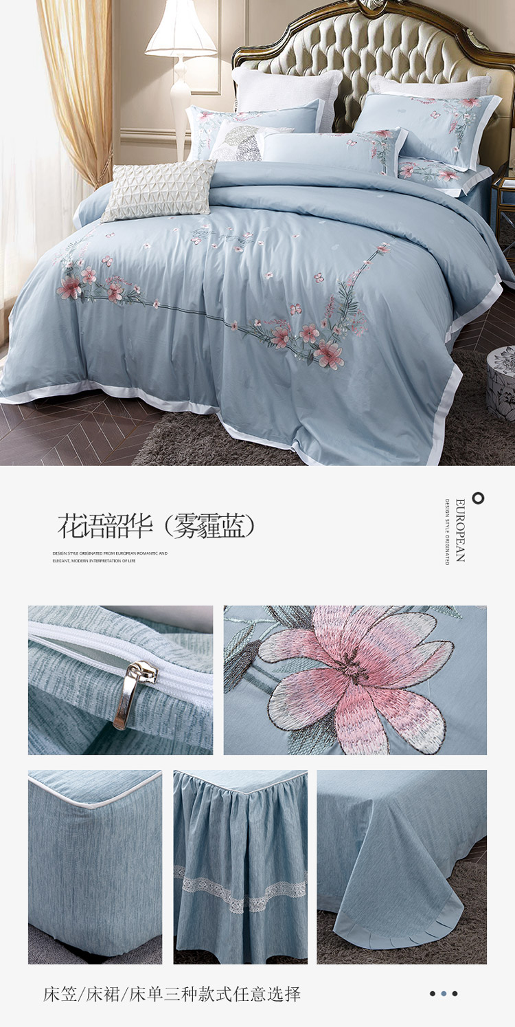 兴美佳100S澳棉高端绣花床单床裙床笠款四件套花语韶华雾霾蓝