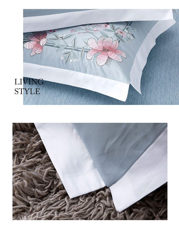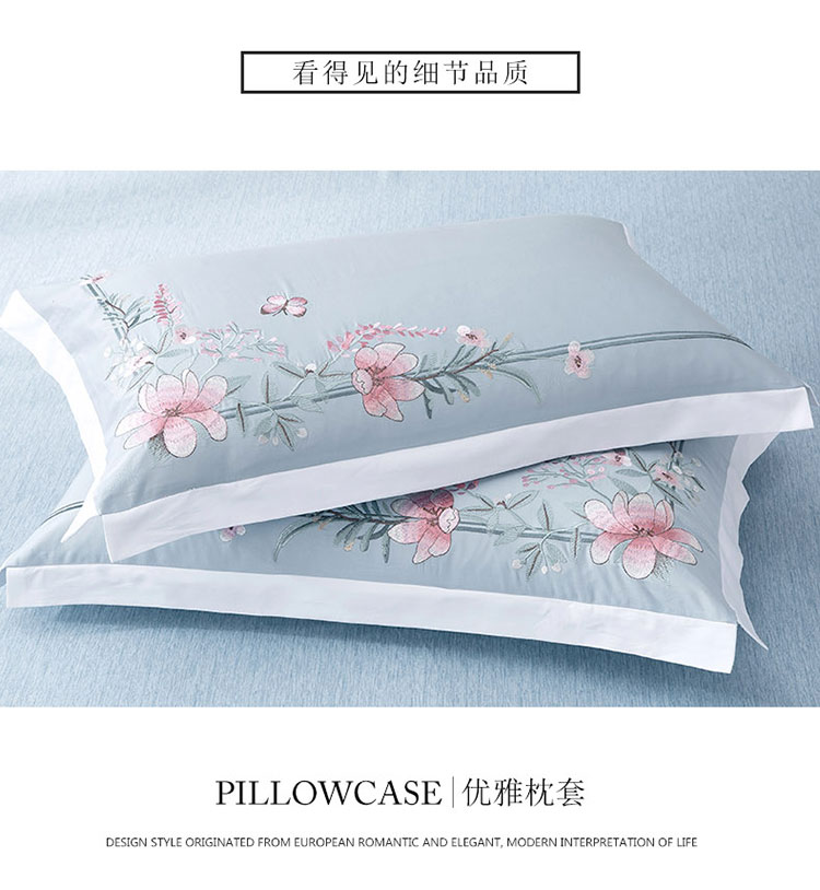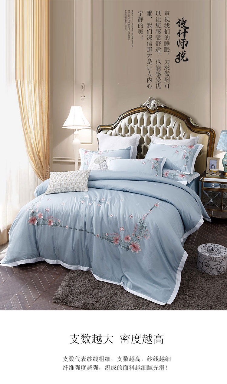 商品名称:兴美佳100S澳棉高端绣花床单床裙床笠款四件套花语韶华雾霾蓝