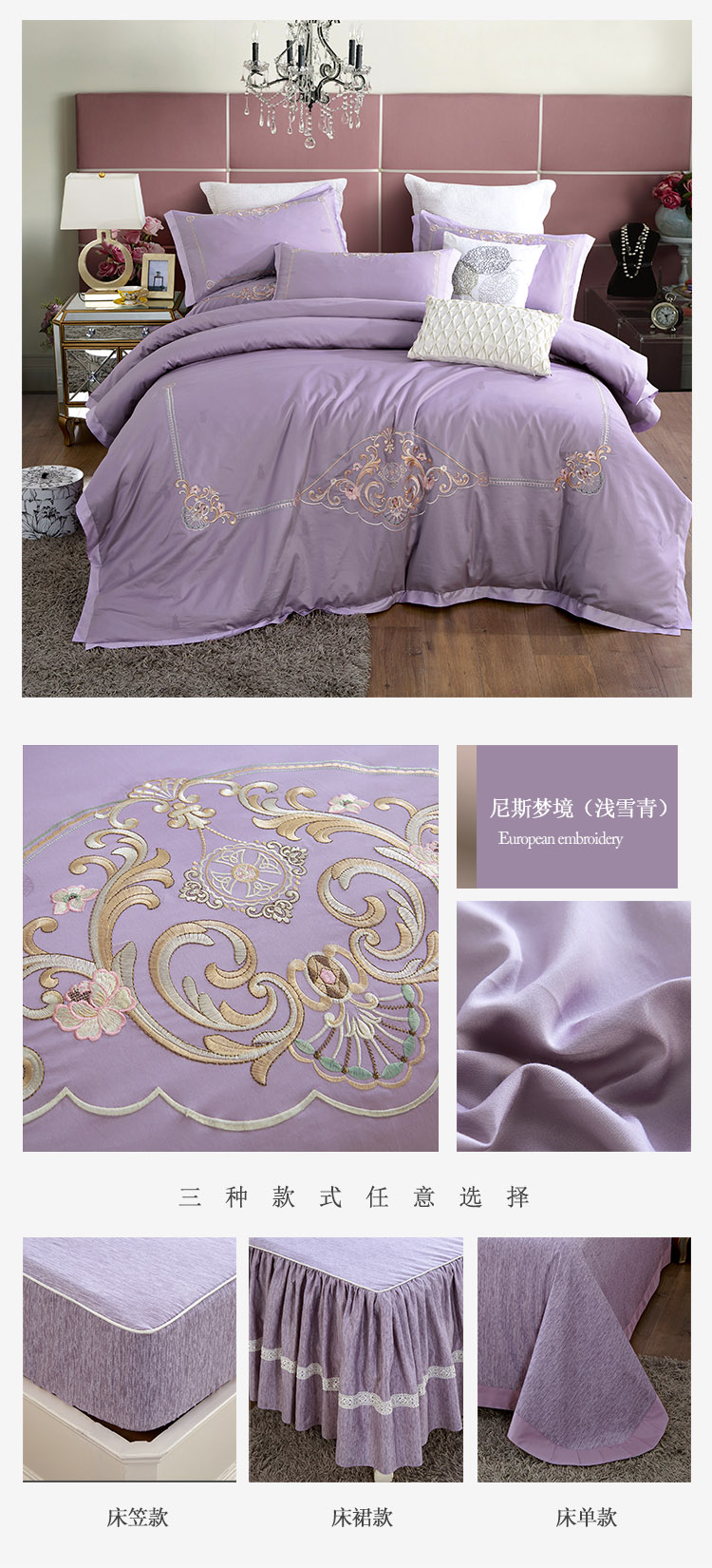(总)兴美佳家纺 欧式60s贡缎长绒棉刺绣四件套,幽兰古调-蓝,幽兰古调-紫