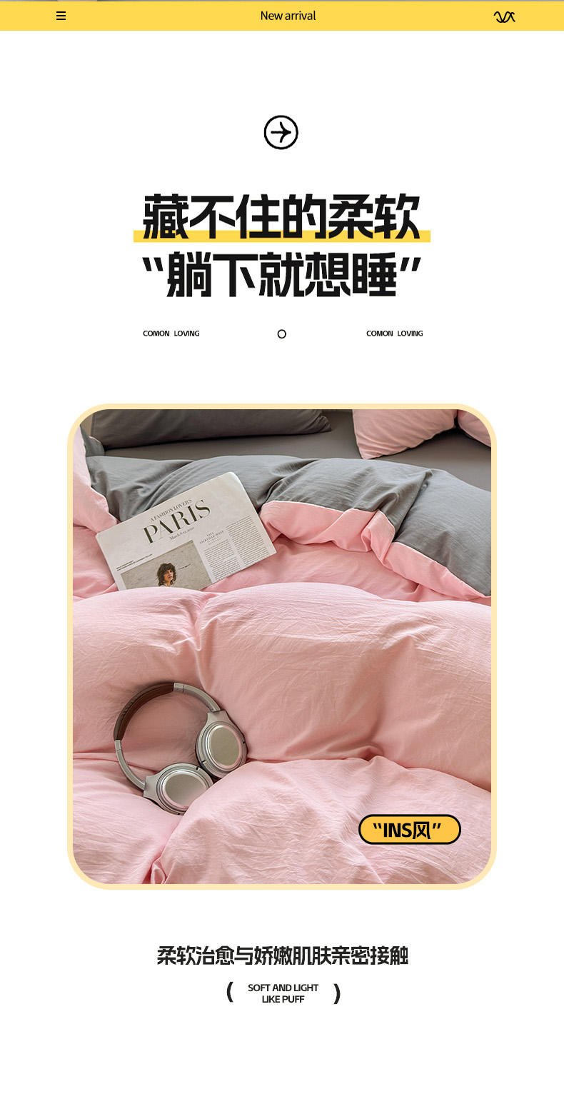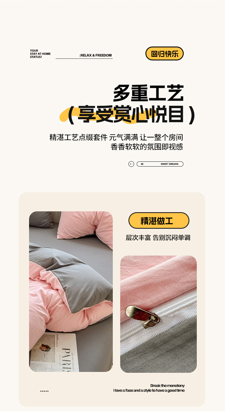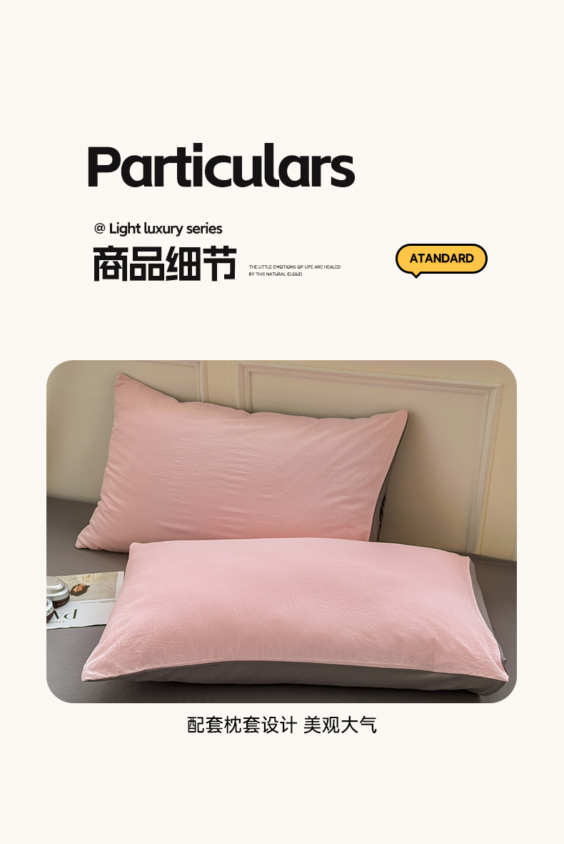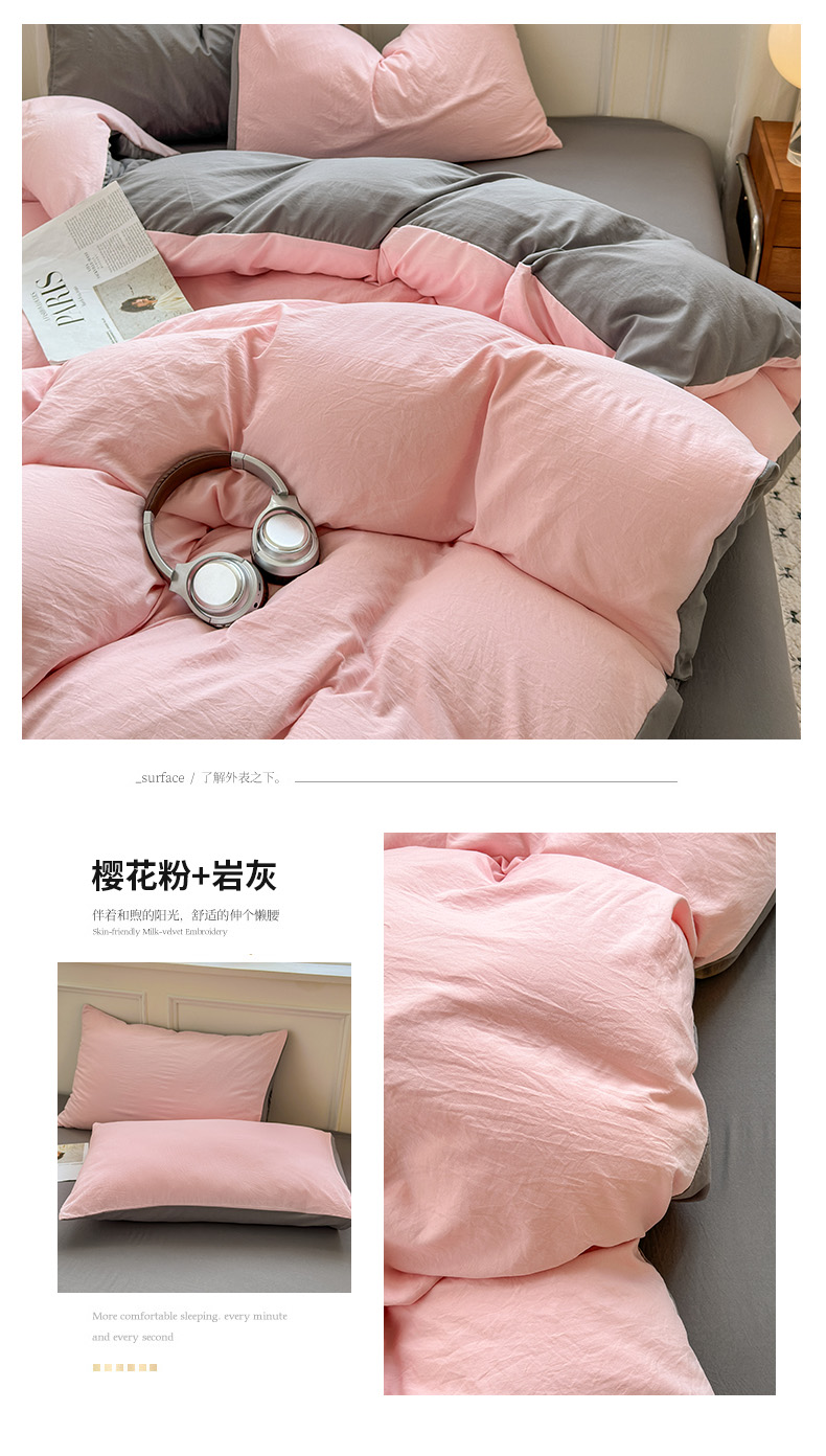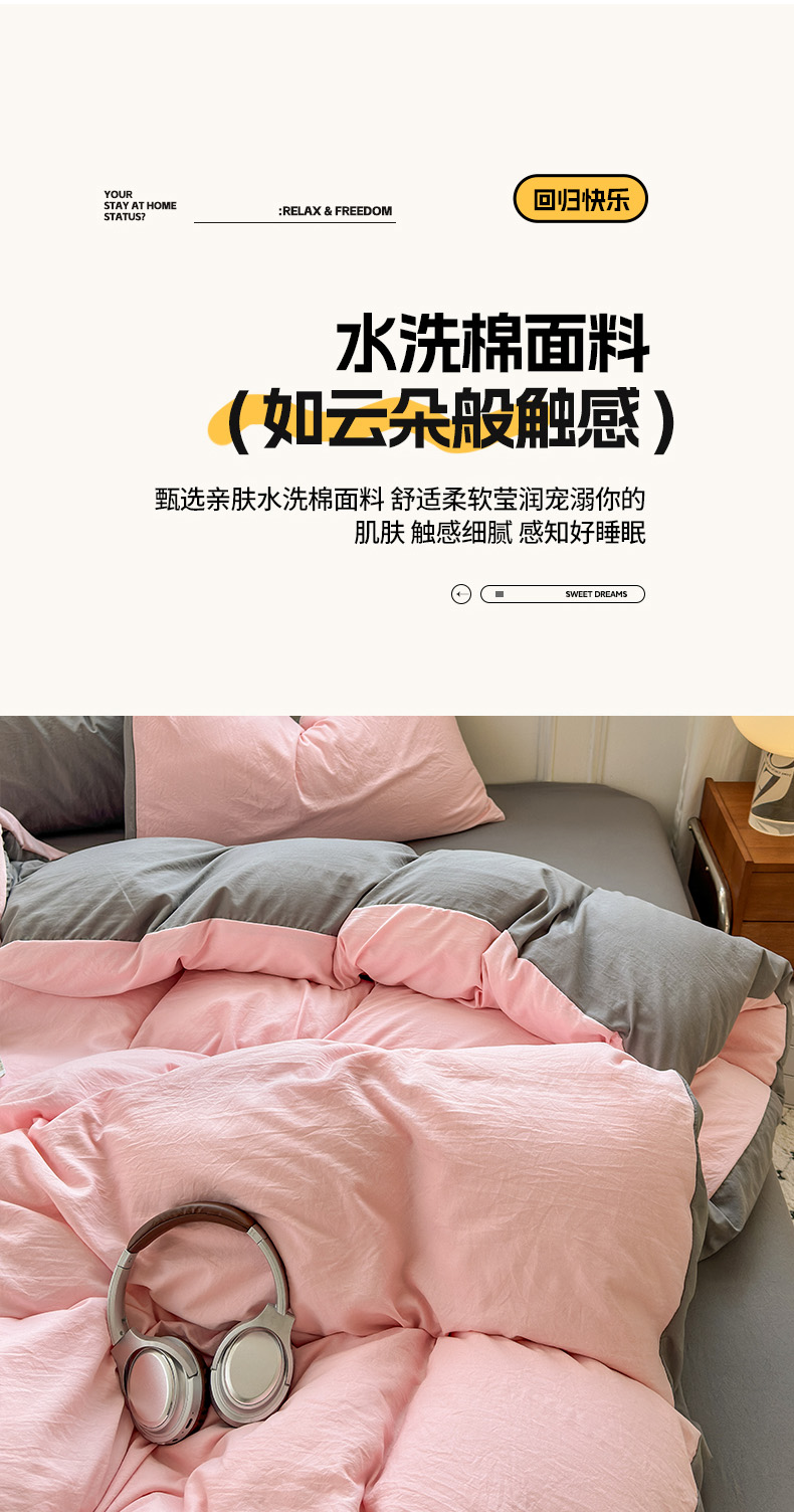 商品名称:冕悠家纺 2025新款A类105克超柔褶皱水洗棉拼色四件套-单被套 樱花粉+岩灰