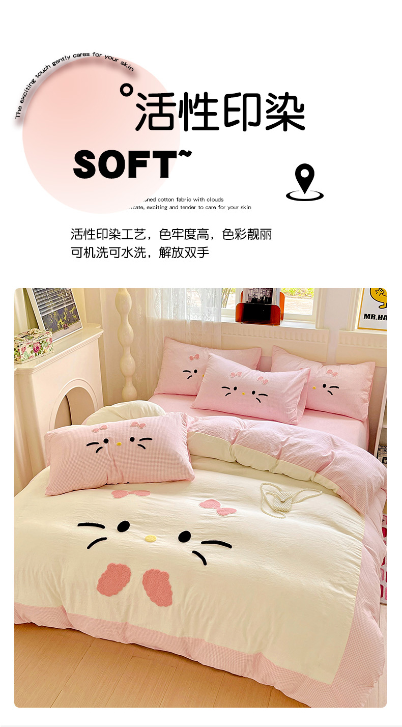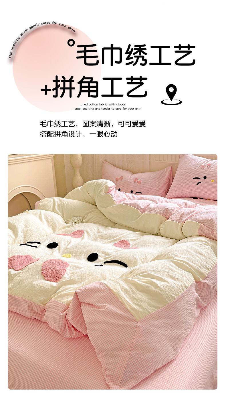 (总)富米莱(原臻工厂) 2026新款水洗棉波点毛巾绣黑格球球款床盖床裙四件套,幸福猫咪-蓝,幸福猫咪-粉,幸福猫咪-紫,幸福猫咪-米