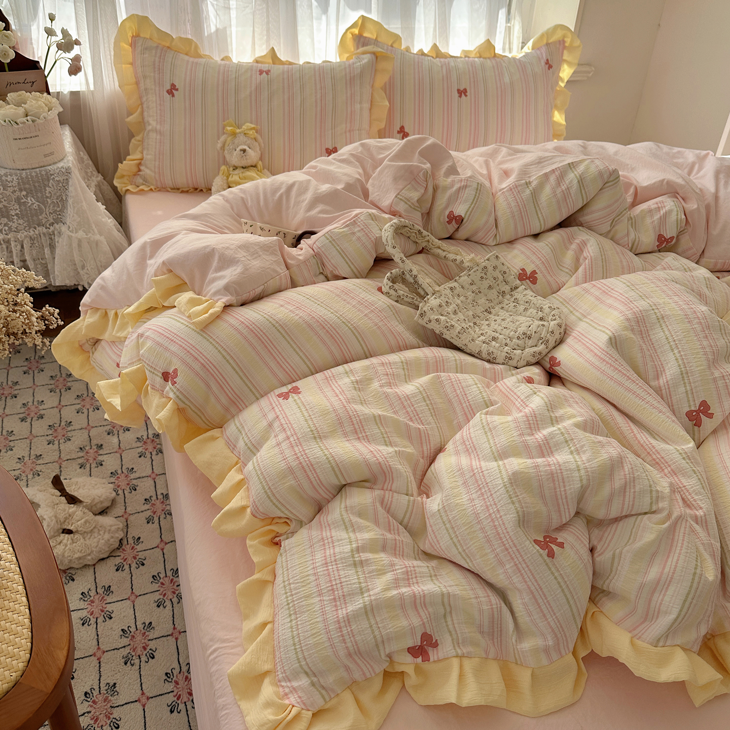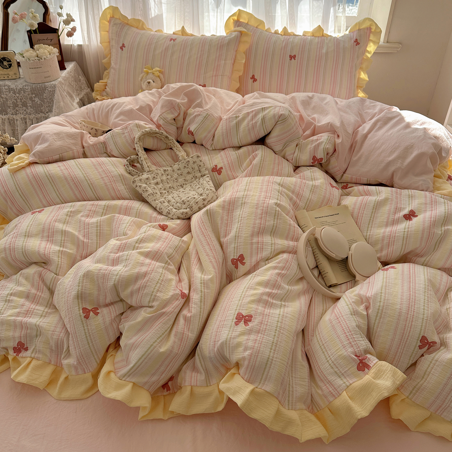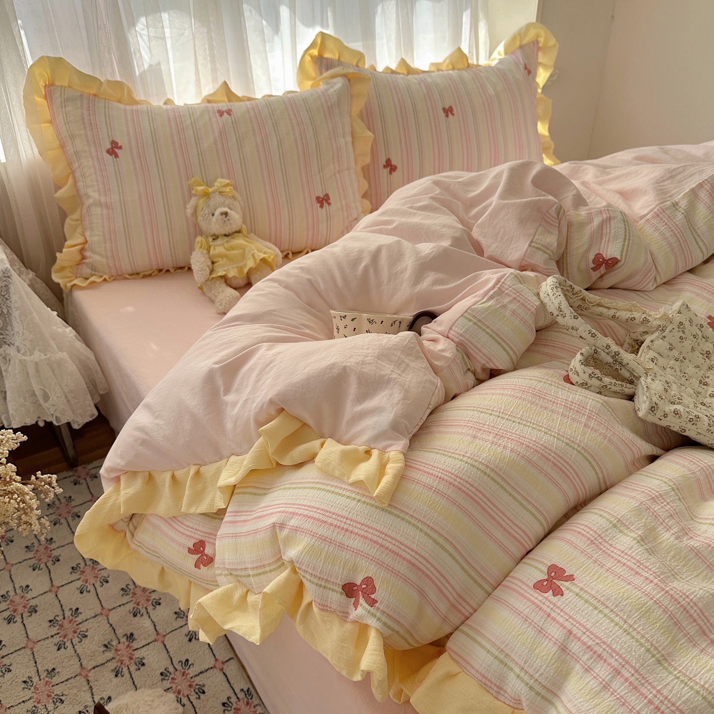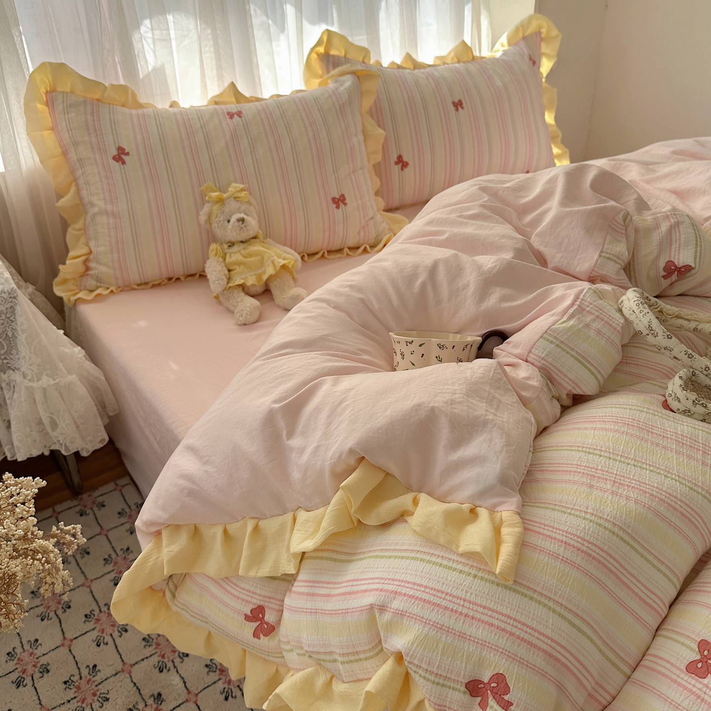 当前位置: 91家纺网 > 商品网购 > 床品套件 > 四件套 > 双层纱四件套 > 顾里家纺 2025新款韩系花边皱皱纱四件套 彩虹蝴蝶结