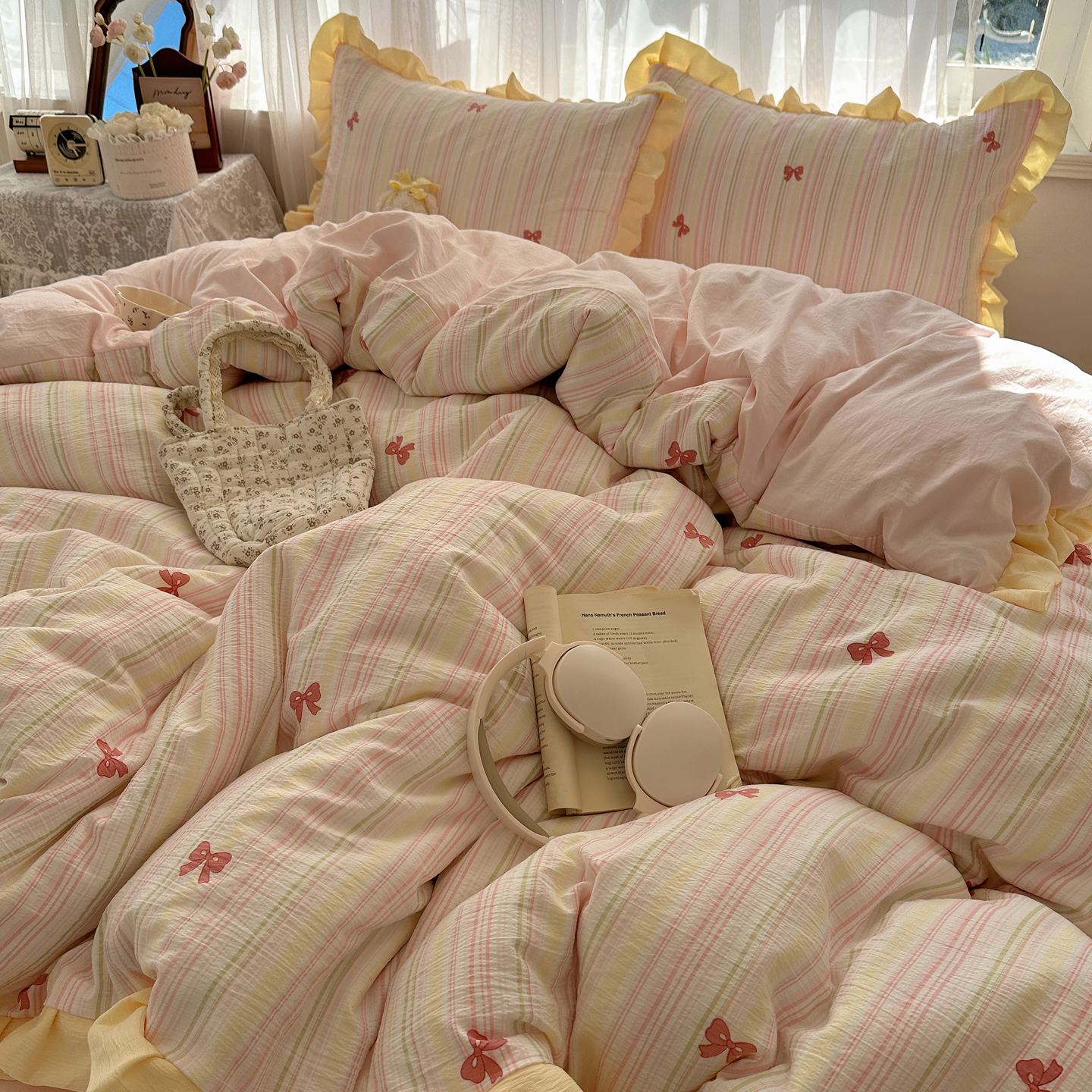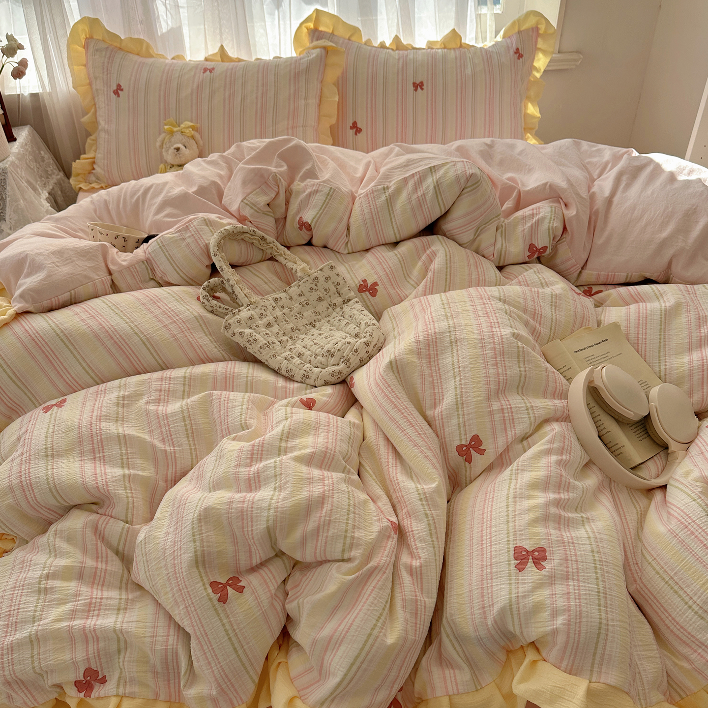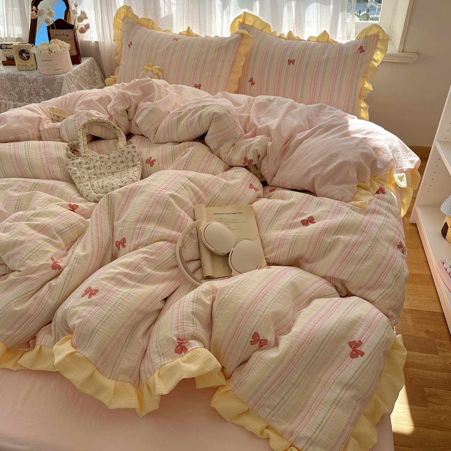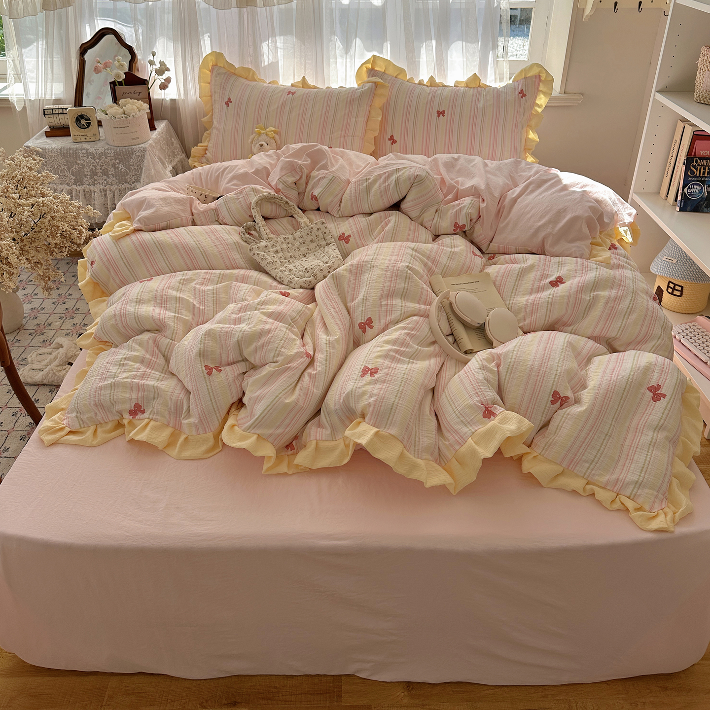 当前位置: 91家纺网 > 商品网购 > 床品套件 > 四件套 > 双层纱四件套 > 顾里家纺 2025新款韩系花边皱皱纱四件套 彩虹蝴蝶结