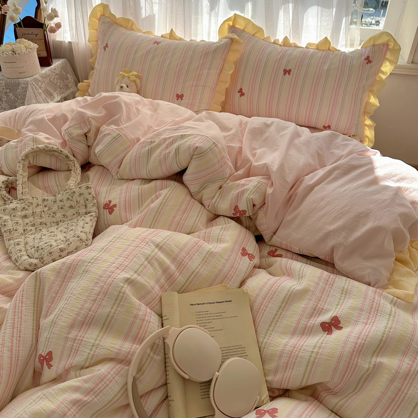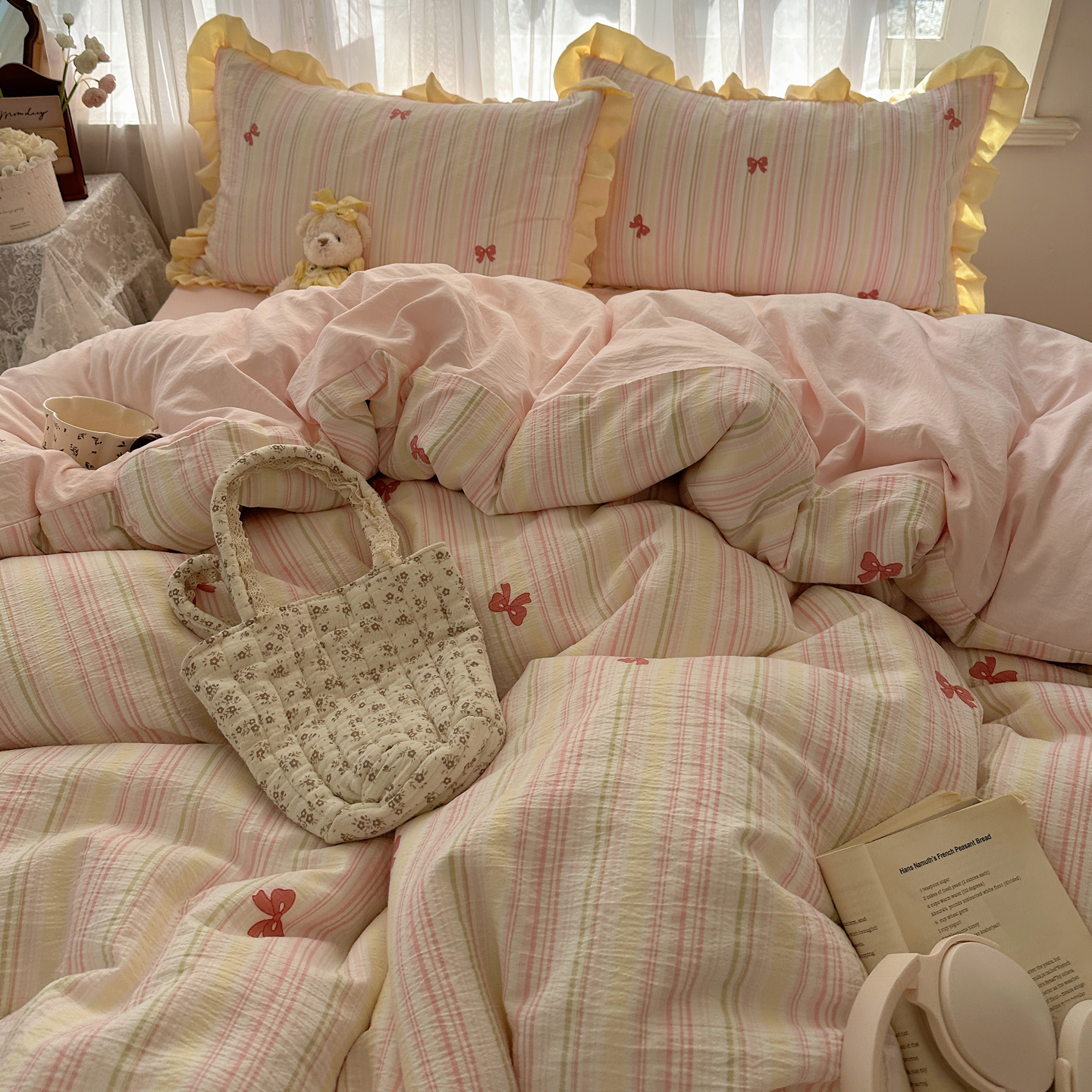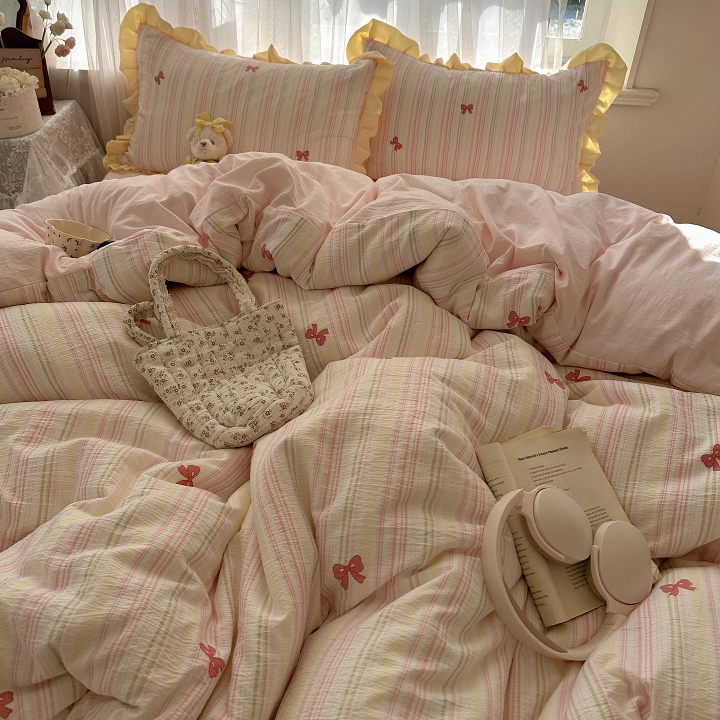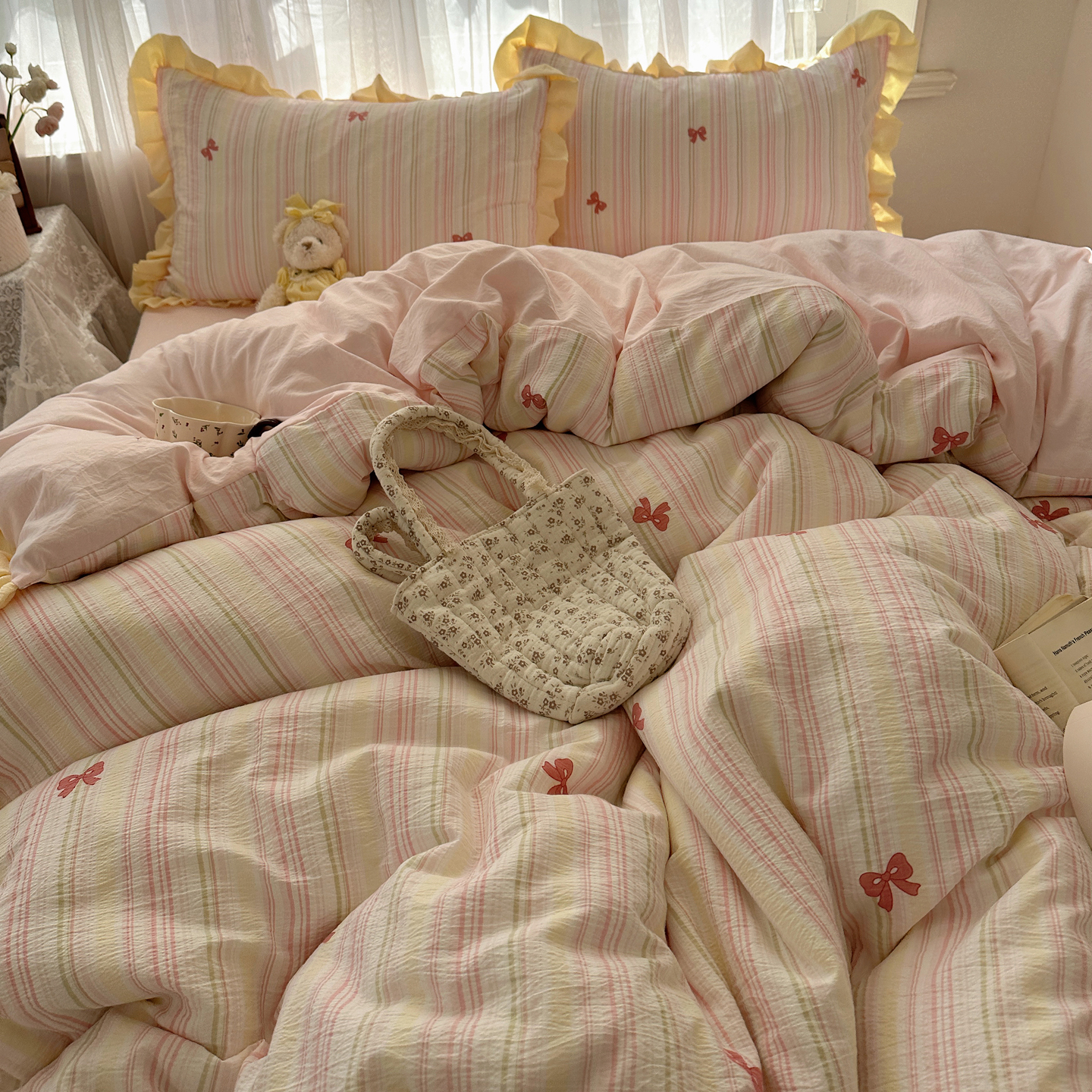 当前位置: 91家纺网 > 商品网购 > 床品套件 > 四件套 > 双层纱四件套 > 顾里家纺 2025新款韩系花边皱皱纱四件套 彩虹蝴蝶结