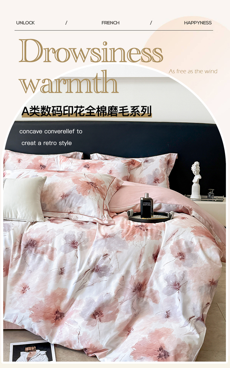 当前位置: 91家纺网 > 商品网购 > 床品套件 > 四件套 > 普通磨毛四件套 > 清雅福2025新款A类全棉磨毛数码印花四件套 梦萦·红