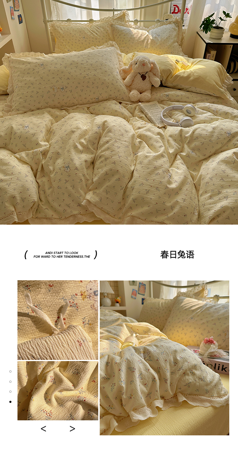 (总)乐沐家纺 2025新款云感皱皱双层纱全棉镂空花边四件套,草莓小兔,春日兔语,泡芙小象,倾心,素瑾,甜梦狗狗,夏日,织梦