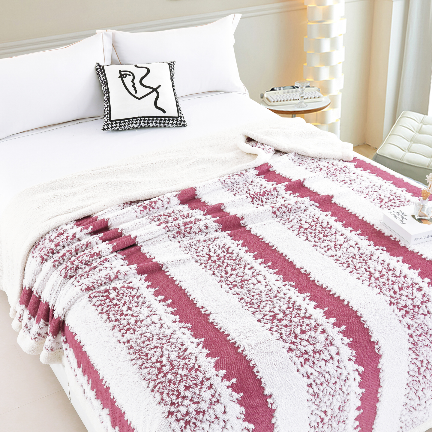 (总)巴木赫 2024新款子母抽条兔毛绒绒毯毯子,宾利蓝,粉色,卡其,墨绿,奶白,葡萄紫,浅驼,深灰,中灰