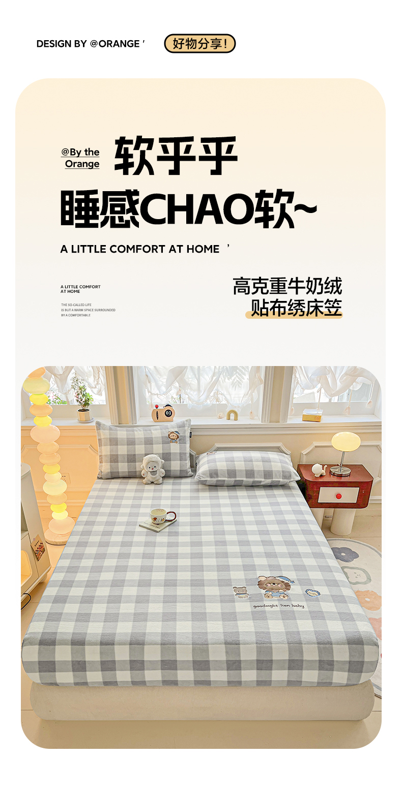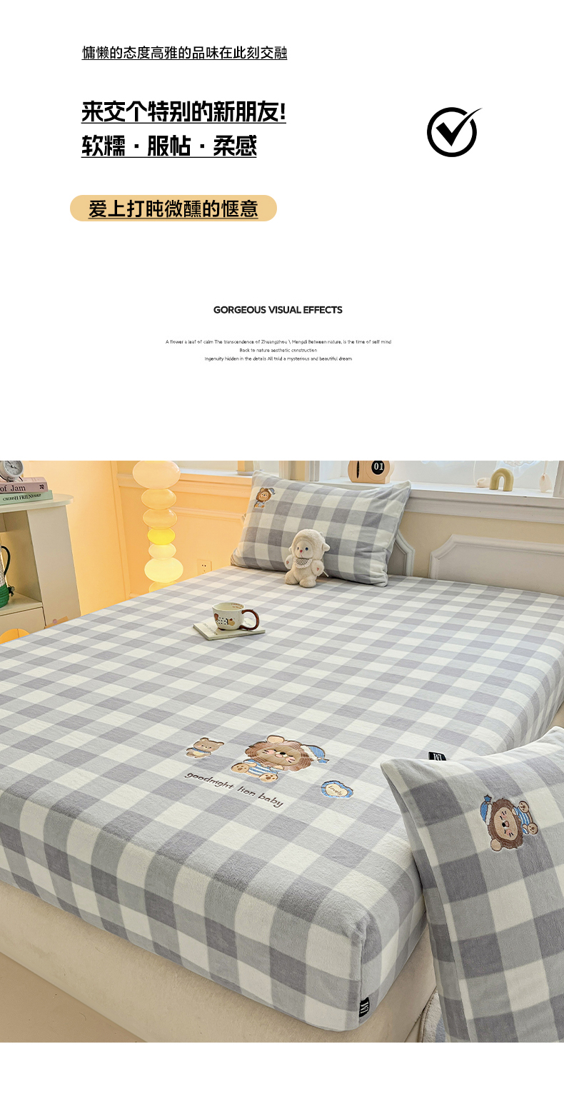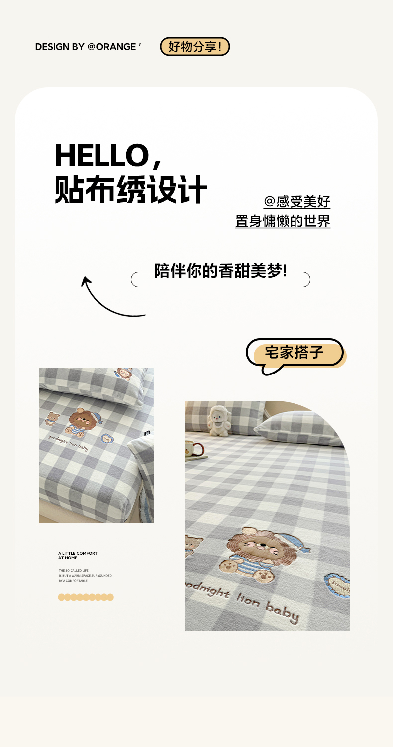 乐美家纺 2025新款A类高克重贴布绣牛奶绒床笠三件套 早安小狮子
