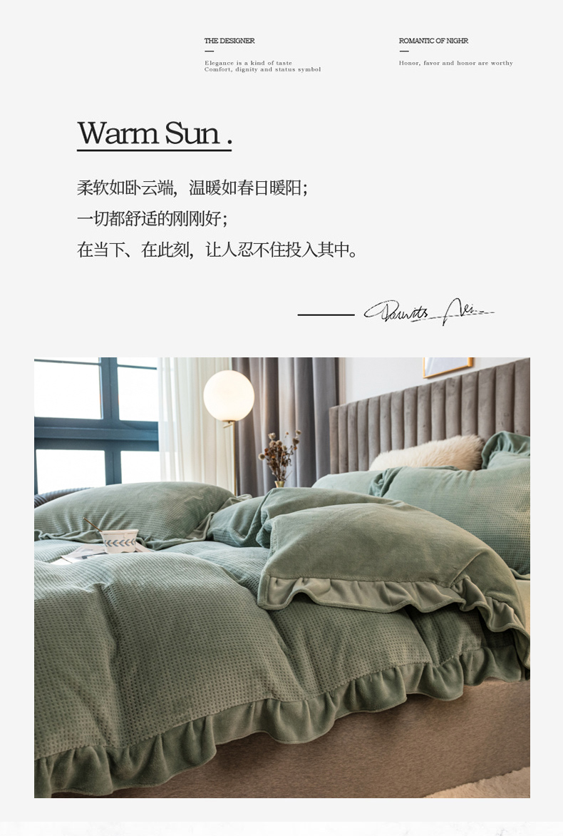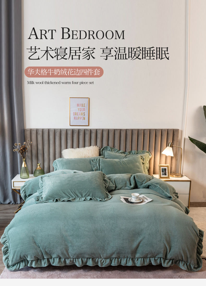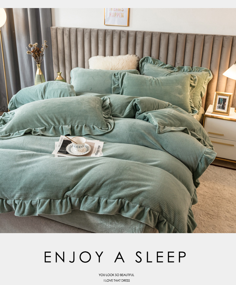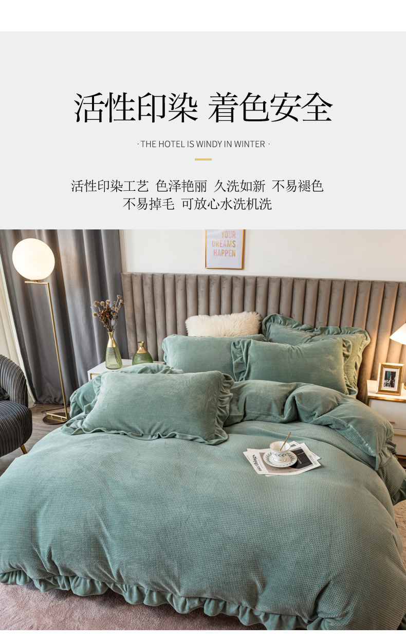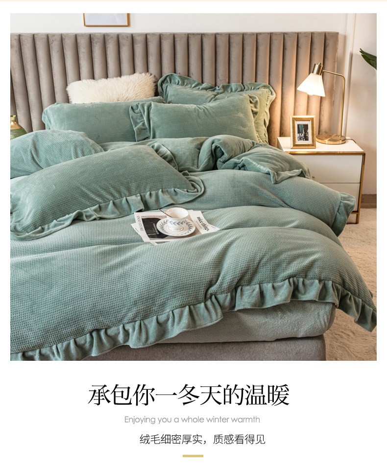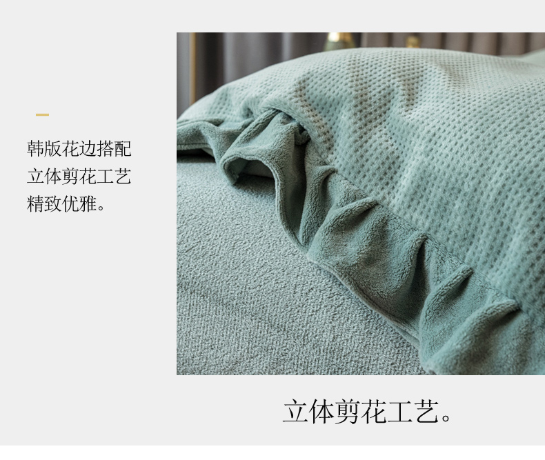 当前位置: 91家纺网 > 商品网购 > 床品套件 > 四件套 > 牛奶绒四件套 > 印季家纺 2025新款华夫格牛奶绒花边四件套 湖绿