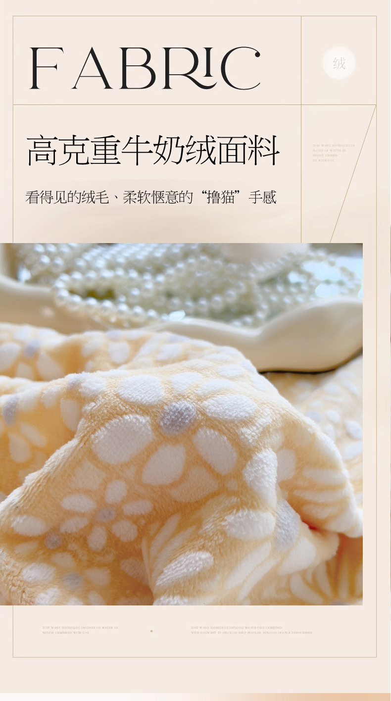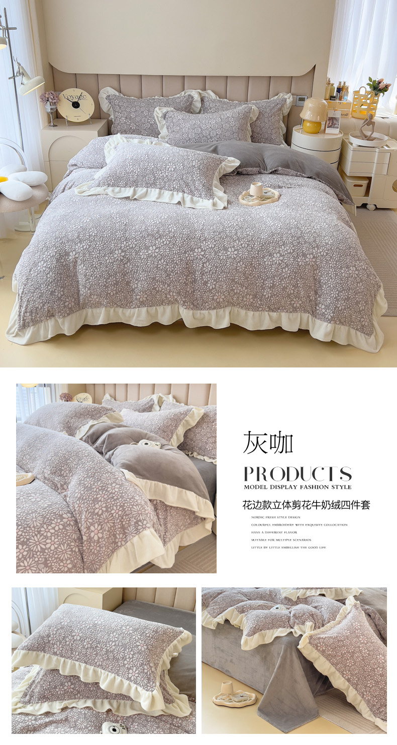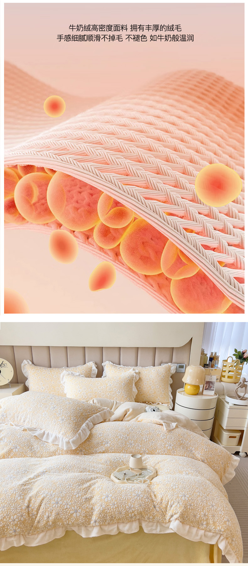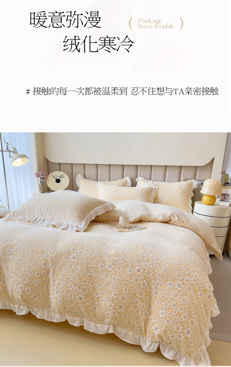 当前位置: 91家纺网 > 商品网购 > 床品套件 > 四件套 > 牛奶绒四件套 > 印季家纺 2025新款花边款立体剪花牛奶绒四件套 鹅黄
