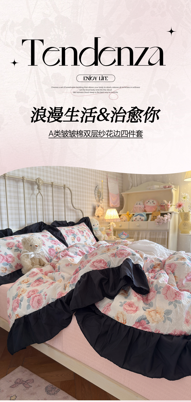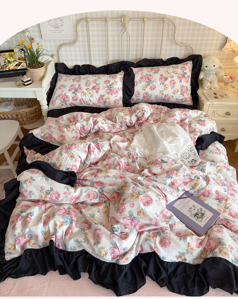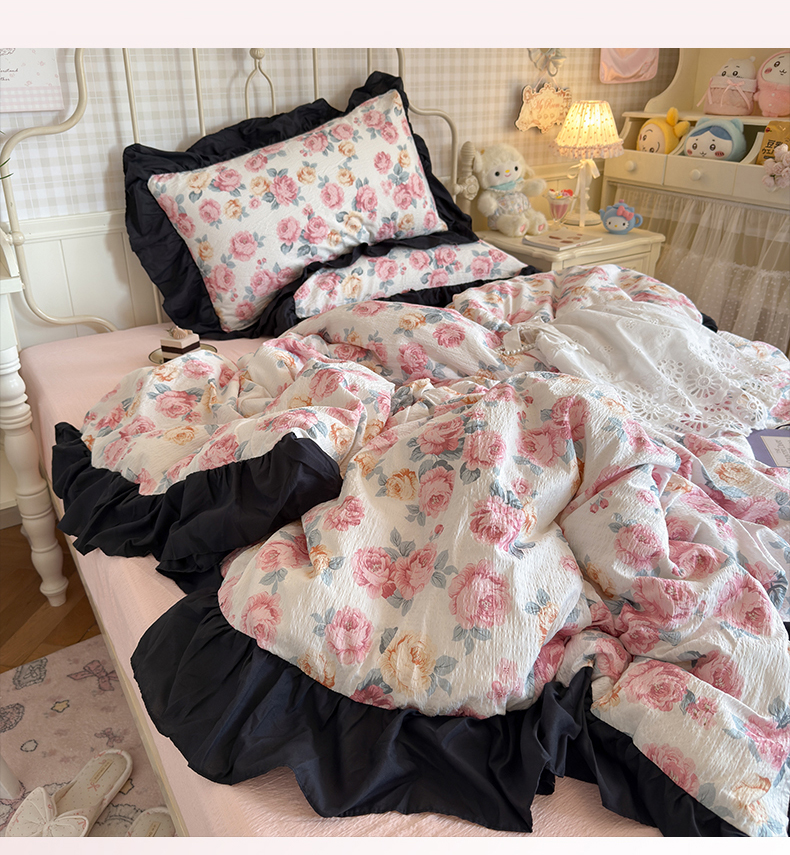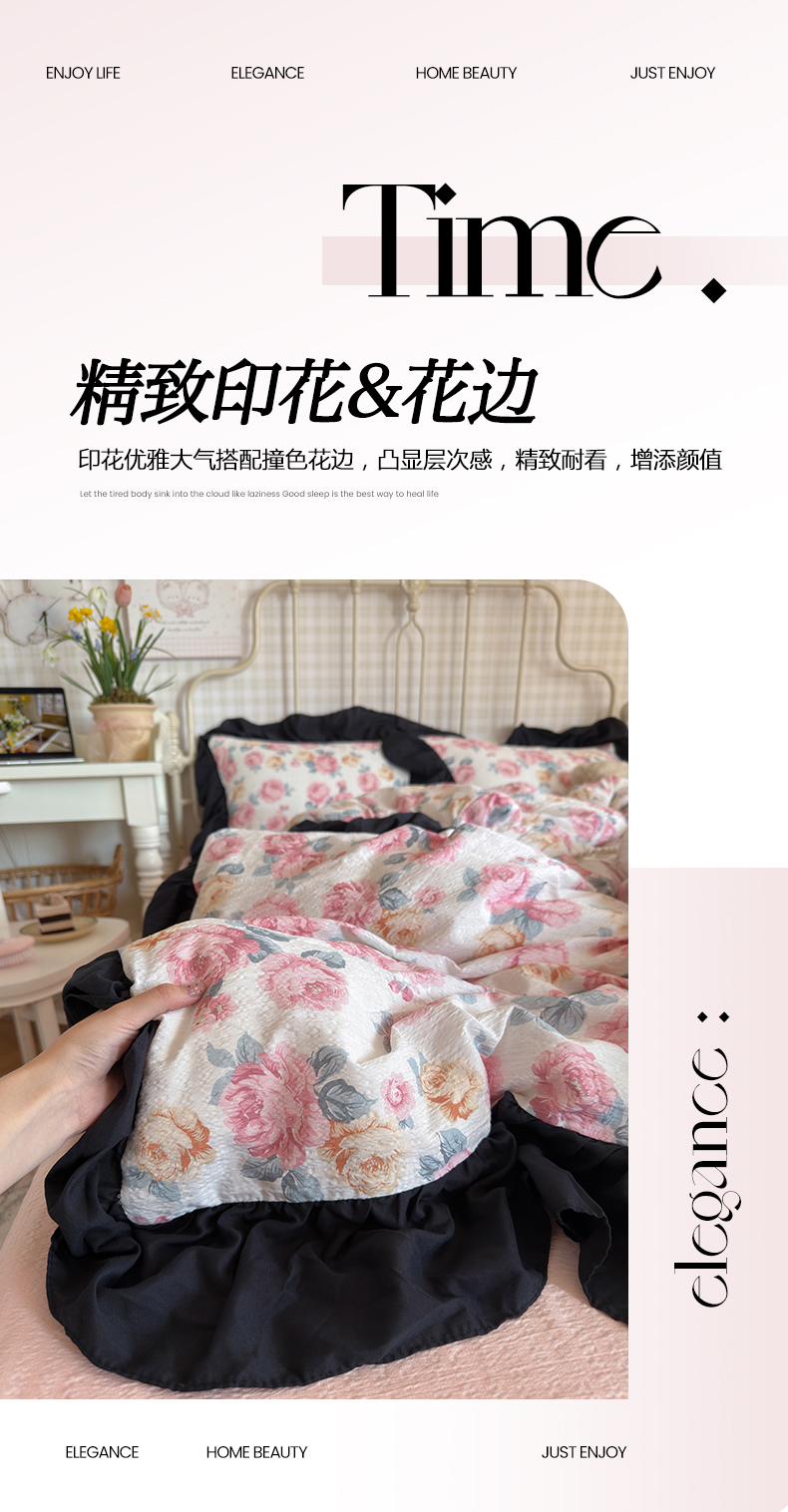当前位置: 91家纺网 > 商品网购 > 床品套件 > 四件套 > 双层纱四件套 > 优卡迪家纺馆 2026新款皱皱棉双层纱黑花边四件套下载文件包含买家秀 满庭芳