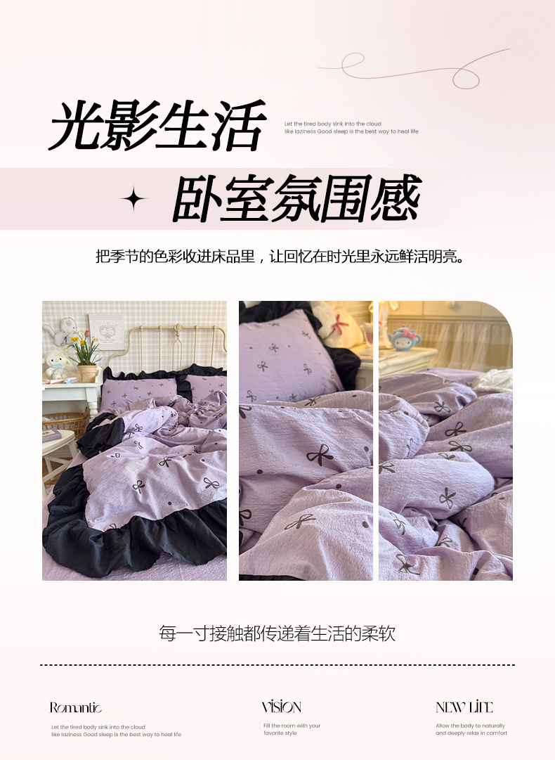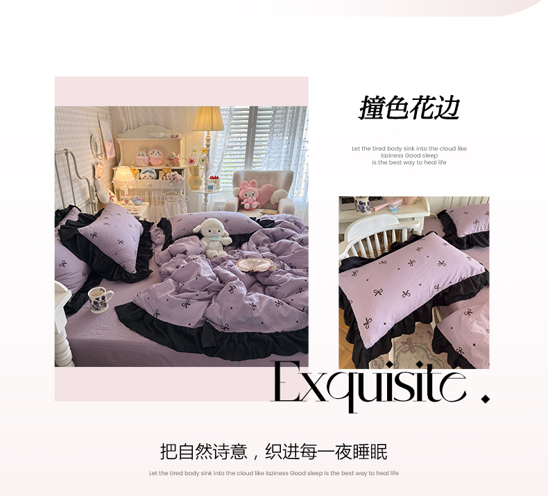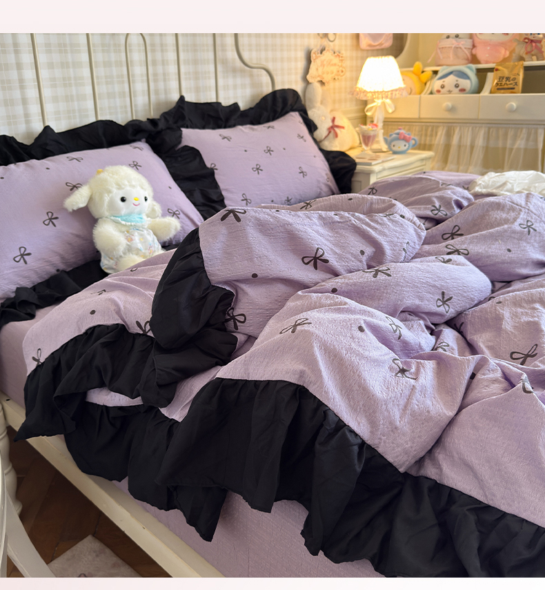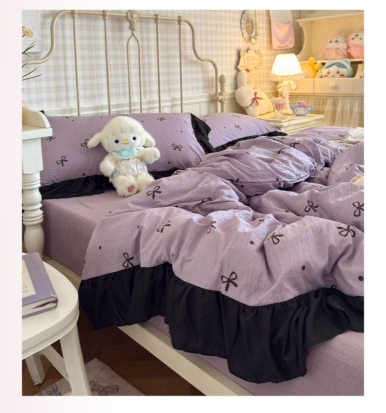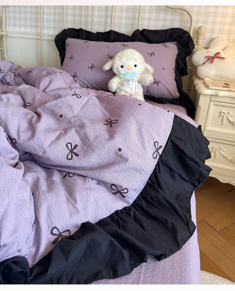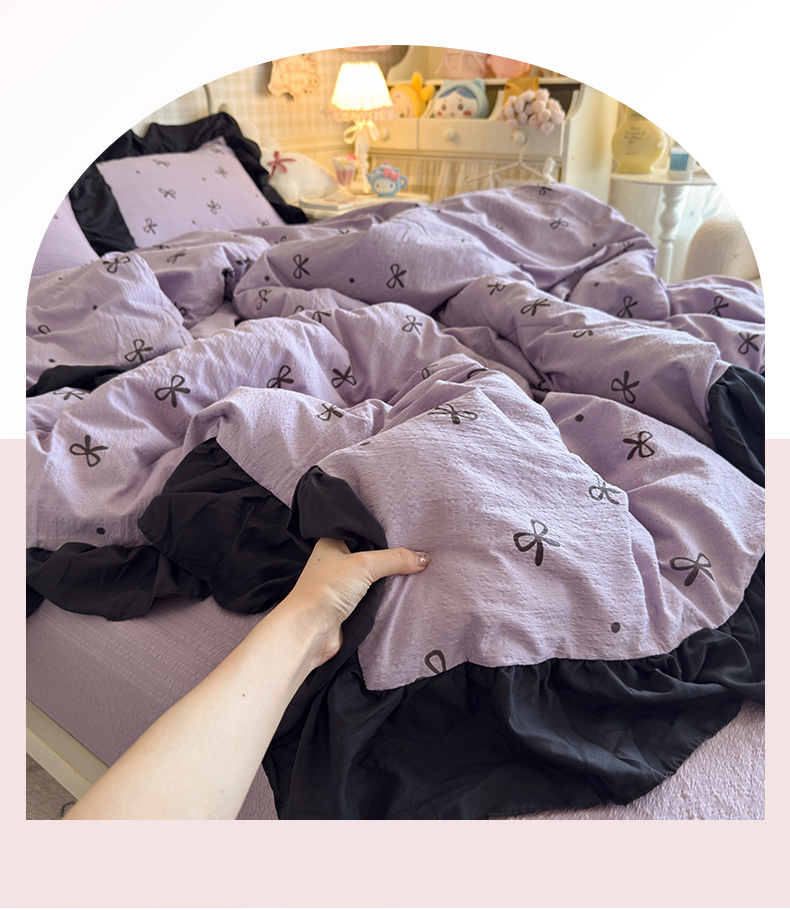 当前位置: 91家纺网 > 商品网购 > 床品套件 > 四件套 > 双层纱四件套 > 优卡迪家纺馆 2026新款皱皱棉双层纱黑花边四件套下载文件包含买家秀 紫苏