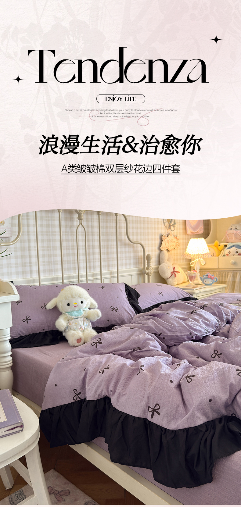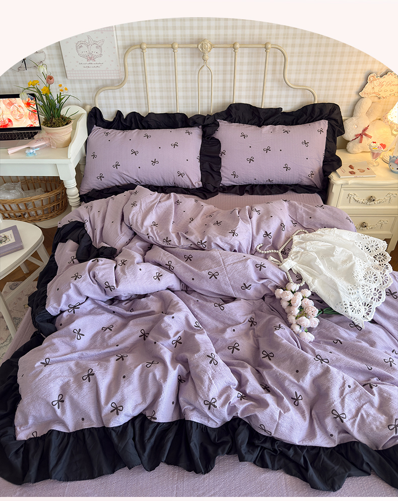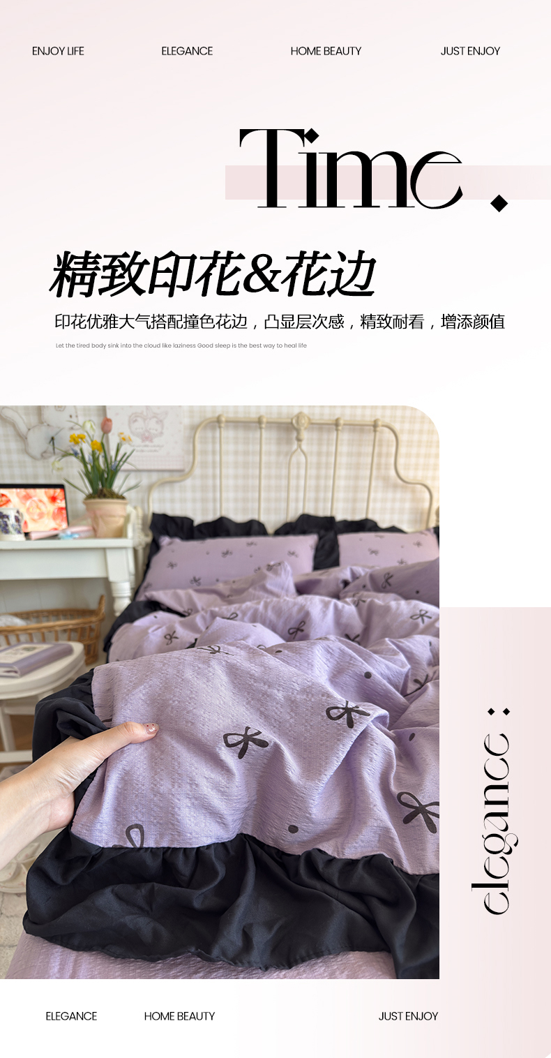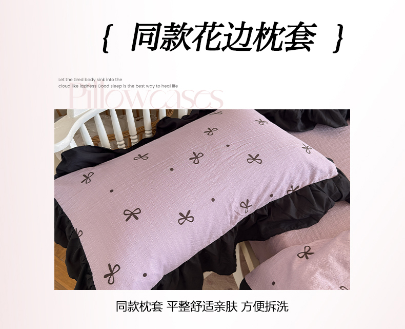 当前位置: 91家纺网 > 商品网购 > 床品套件 > 四件套 > 双层纱四件套 > 优卡迪家纺馆 2026新款皱皱棉双层纱黑花边四件套下载文件包含买家秀 紫苏