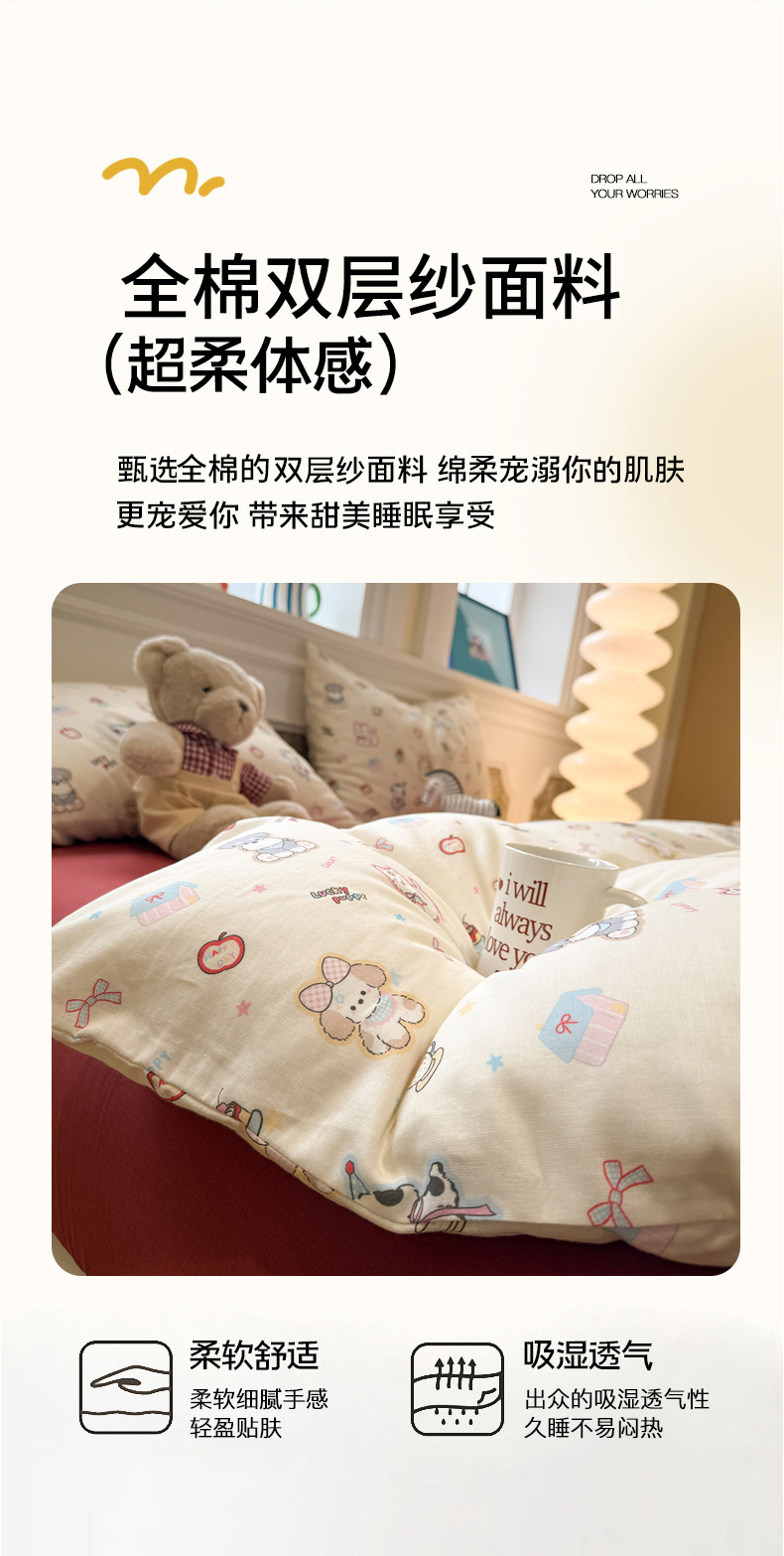 当前位置: 91家纺网 > 商品网购 > 床品套件 > 四件套 > 双层纱四件套 > 塞纳 2026新款.全棉有氧双层纱四件套-场景一 甜梦小窝