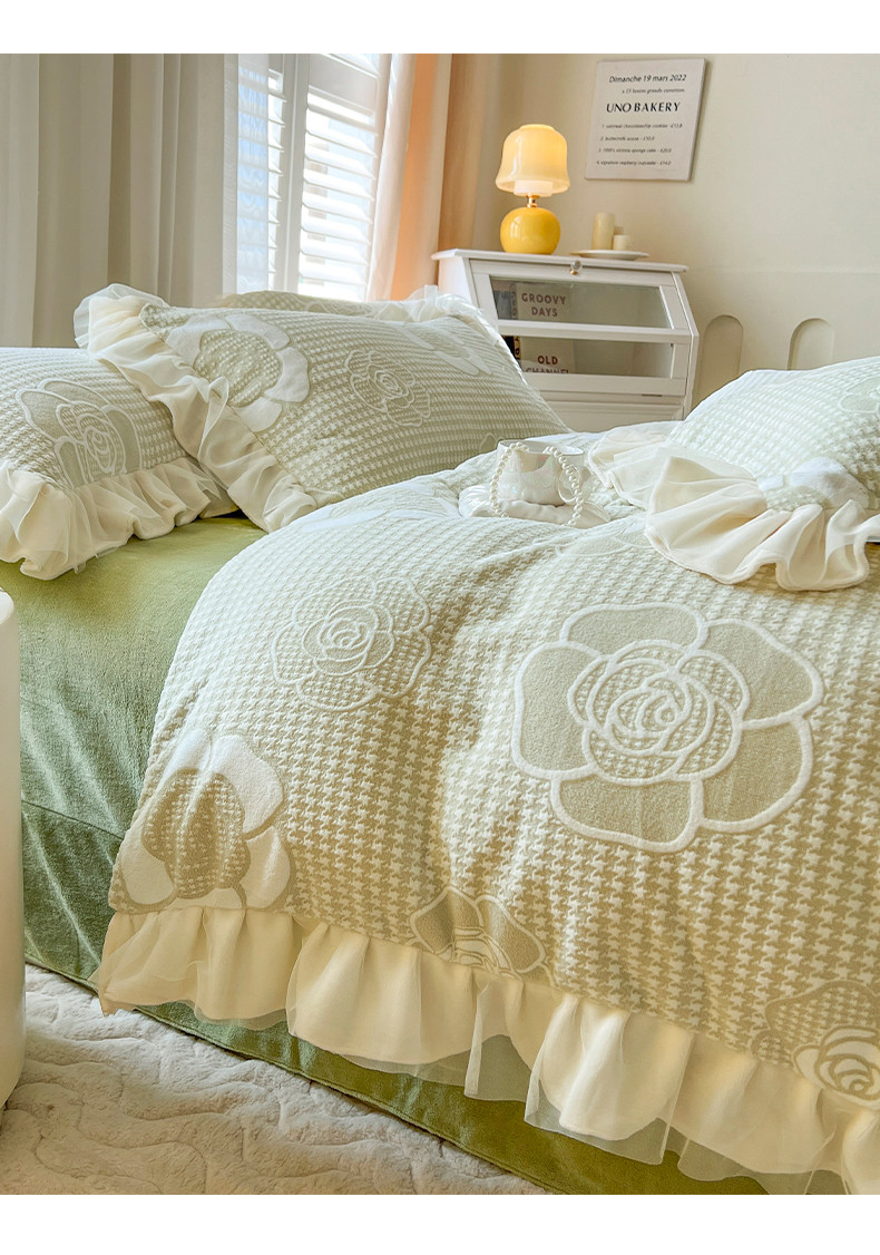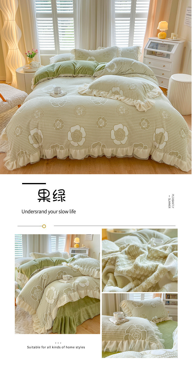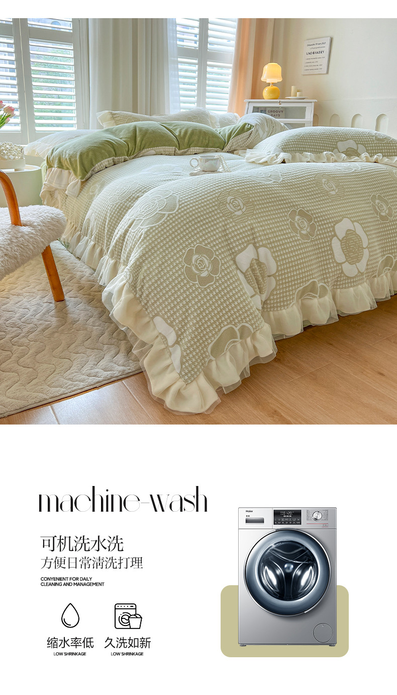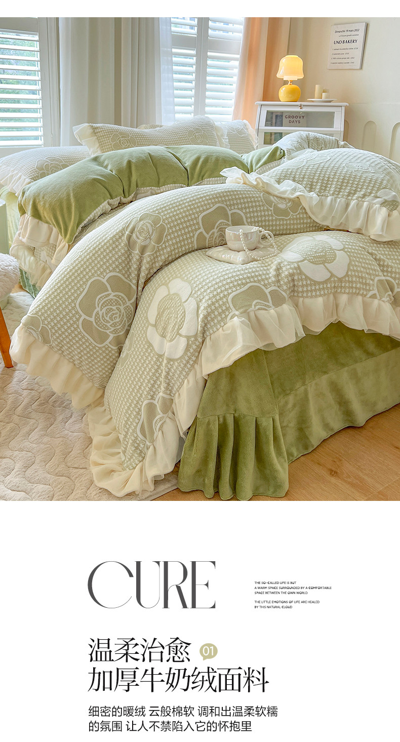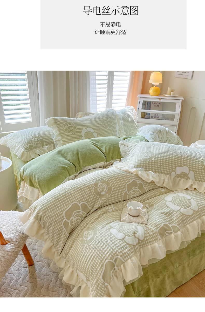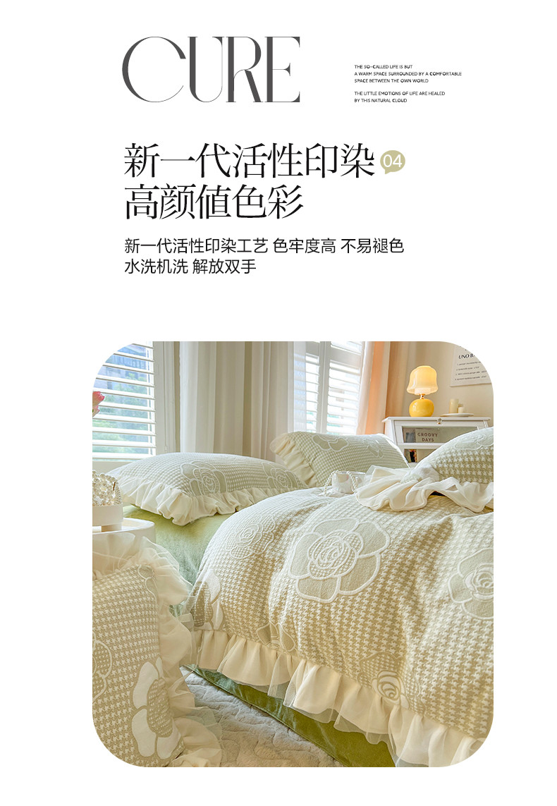 商品名称:麒豆豆 2023新款立体花边雕花牛奶绒四件套直播爆款 倾心花语-果绿