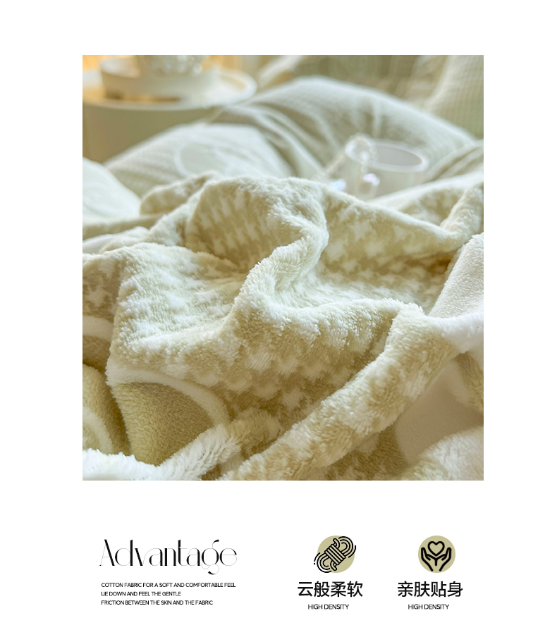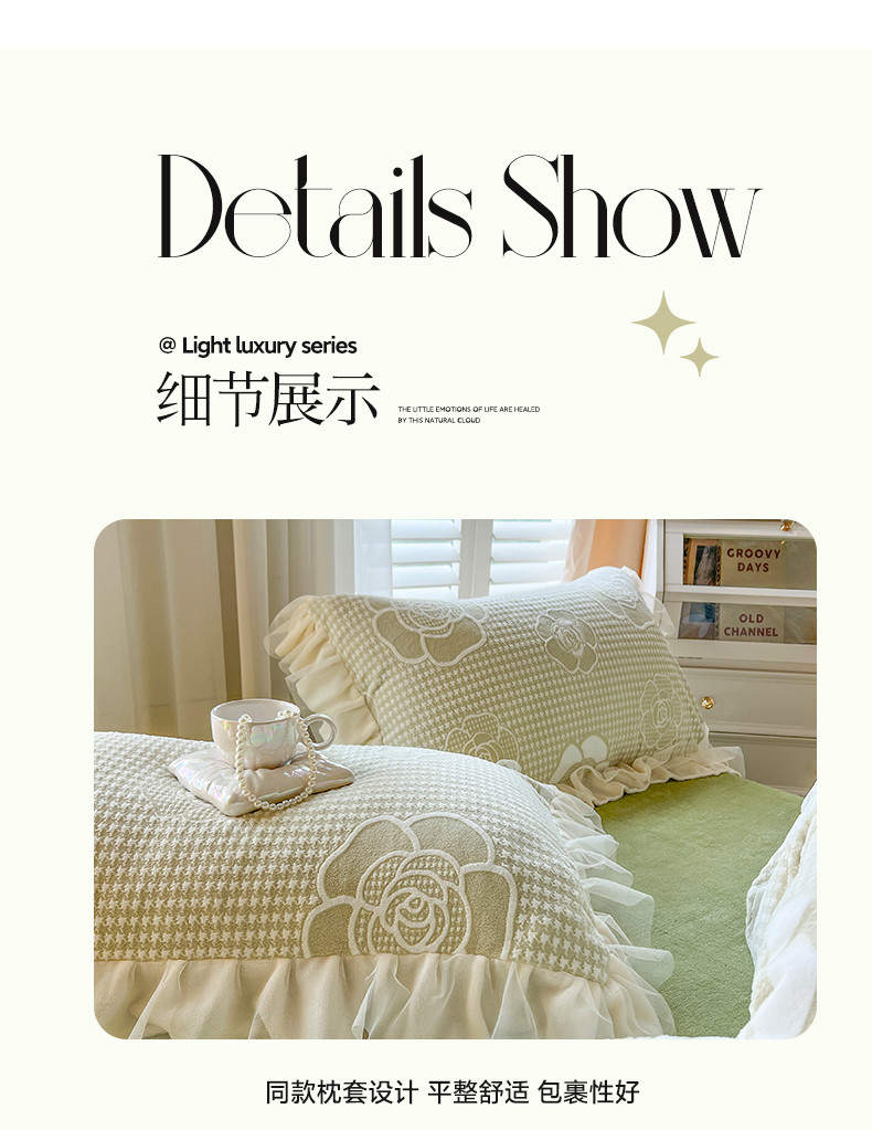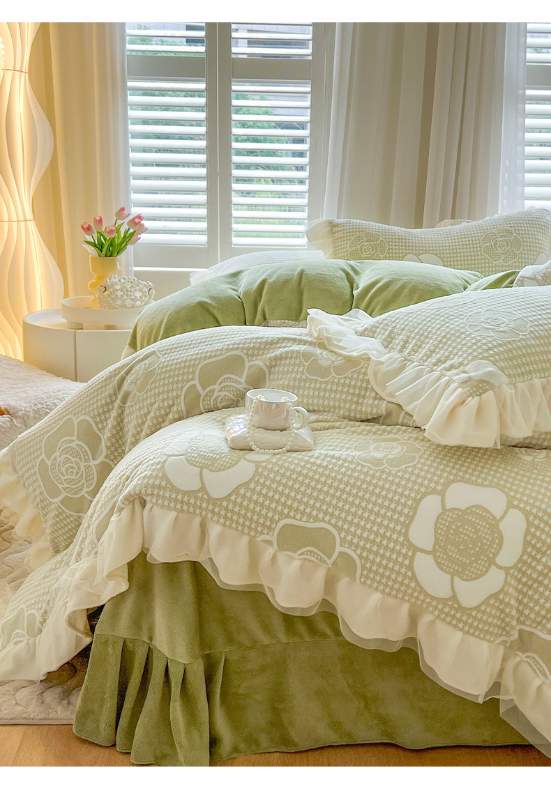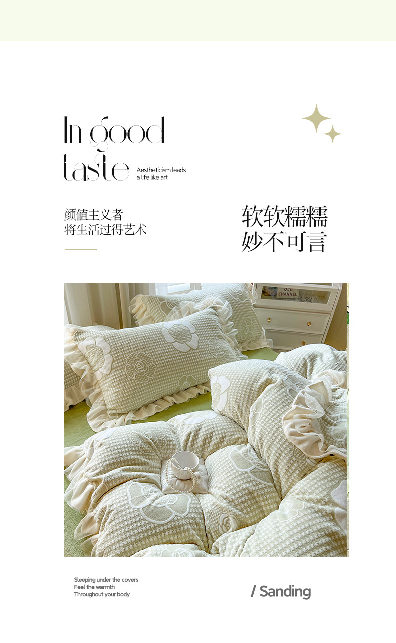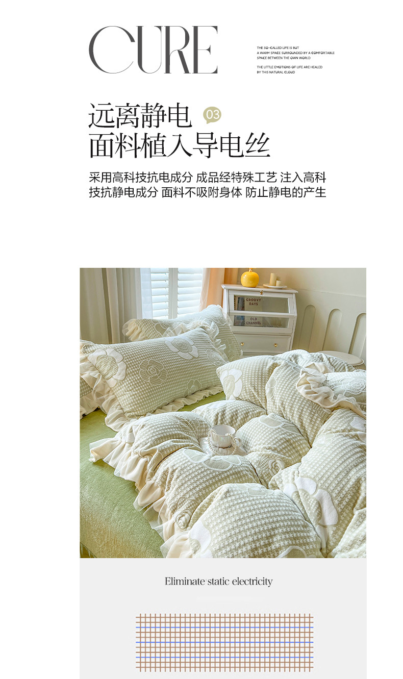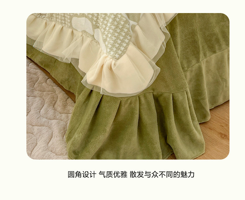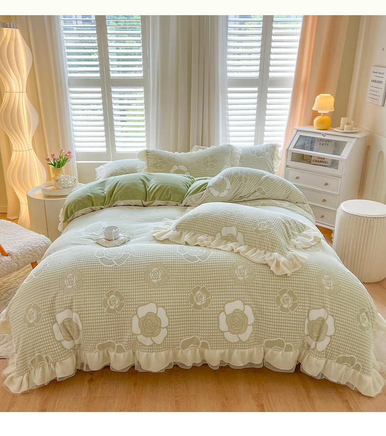 商品名称:麒豆豆 2023新款立体花边雕花牛奶绒四件套直播爆款 倾心花语-果绿