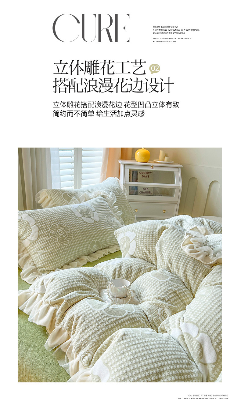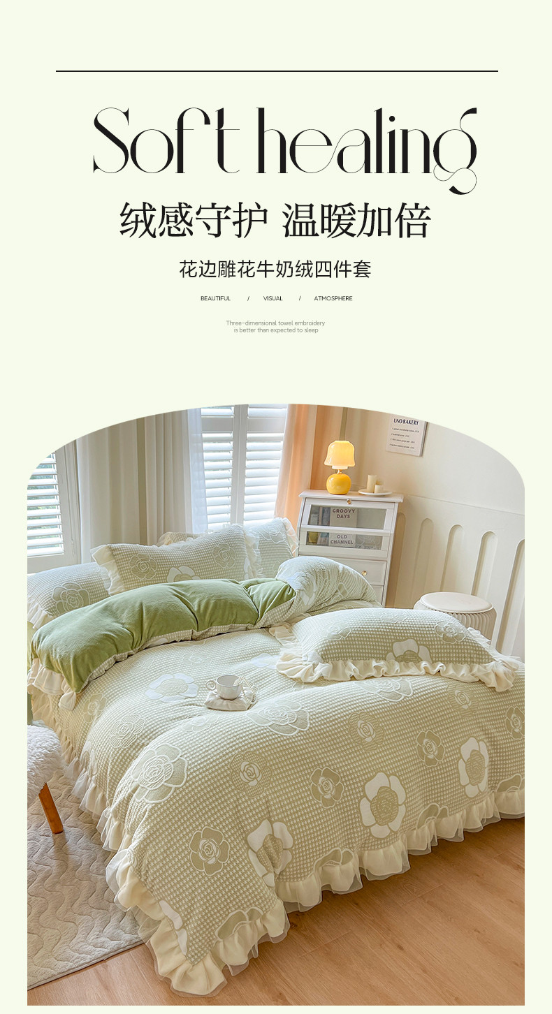 麒豆豆 2023新款立体花边雕花牛奶绒四件套直播爆款 倾心花语-果绿