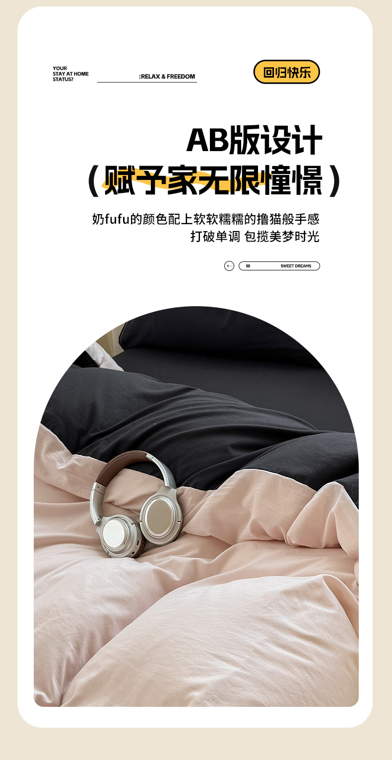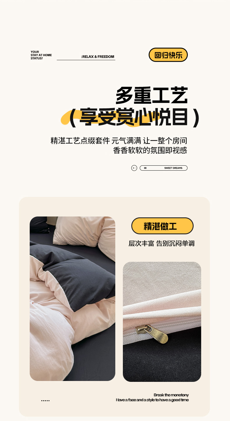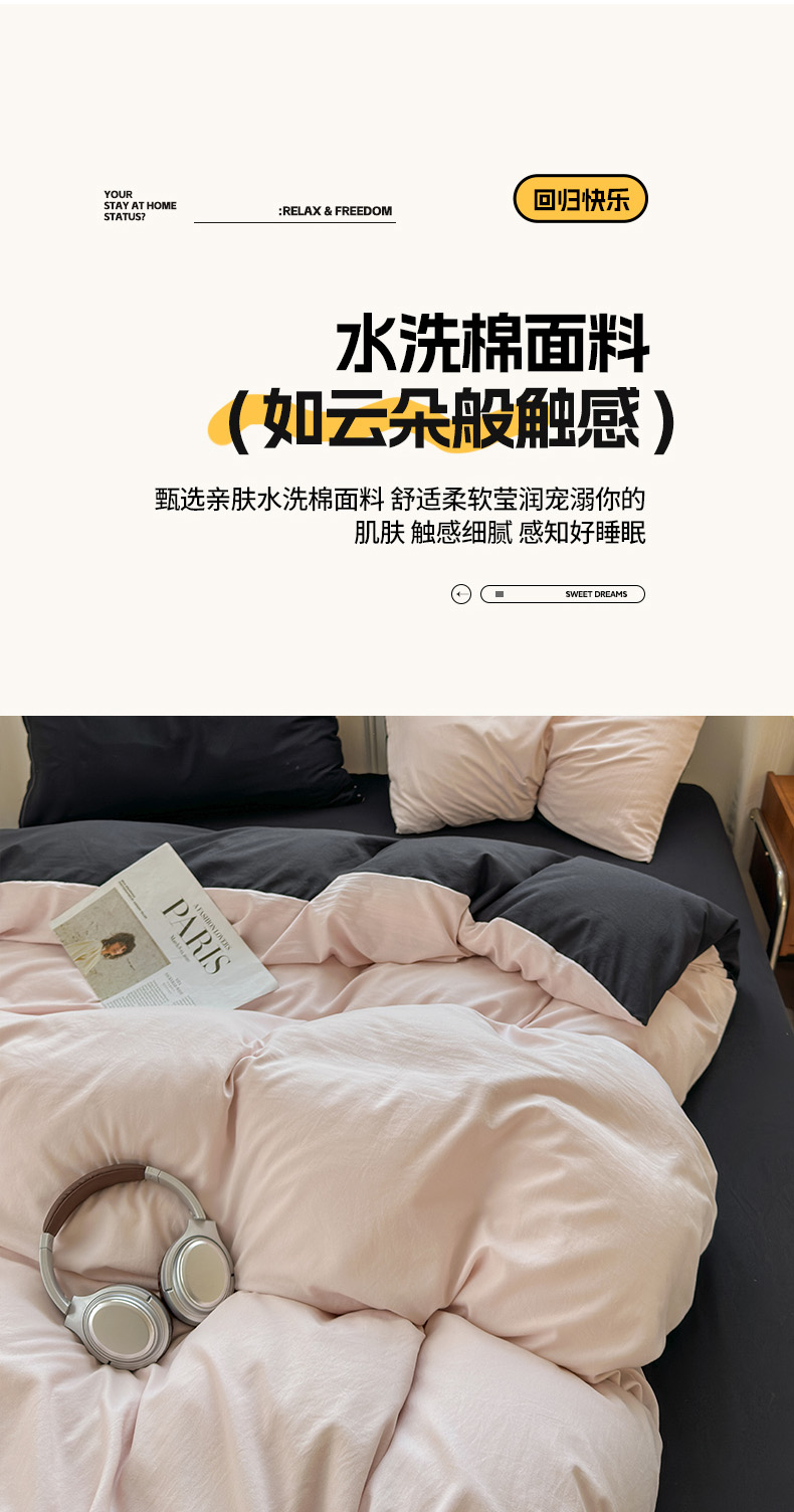 商品名称:冕悠家纺 2025新款A类105克超柔褶皱水洗棉拼色四件套-单被套 藕粉+高级黑