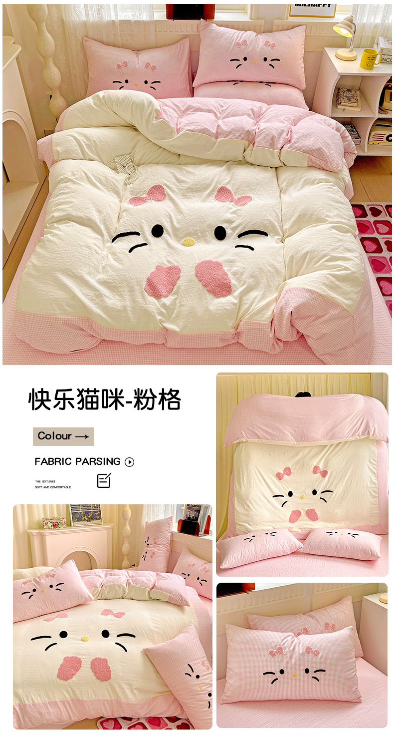 商品名称:富米莱(原臻工厂) 2025新款云朵棉水洗棉毛巾绣拼角工艺四件套 快乐猫咪-粉格