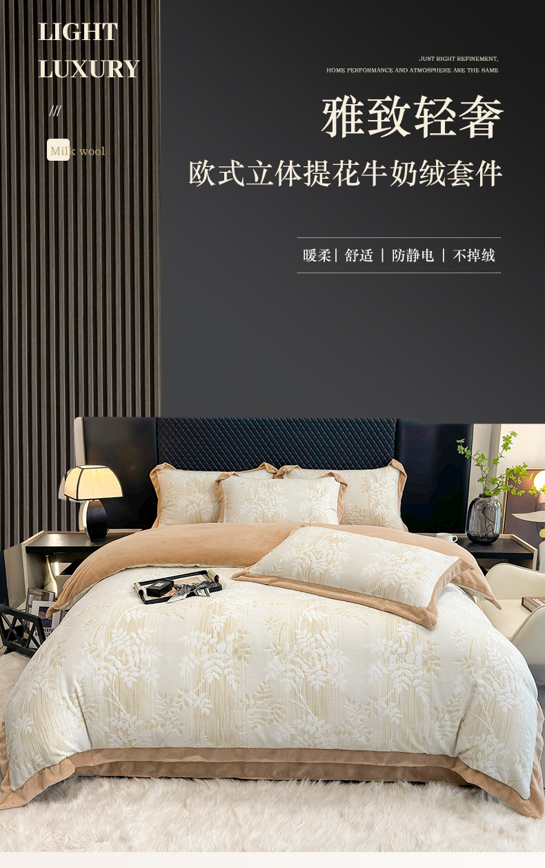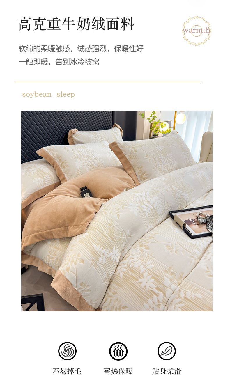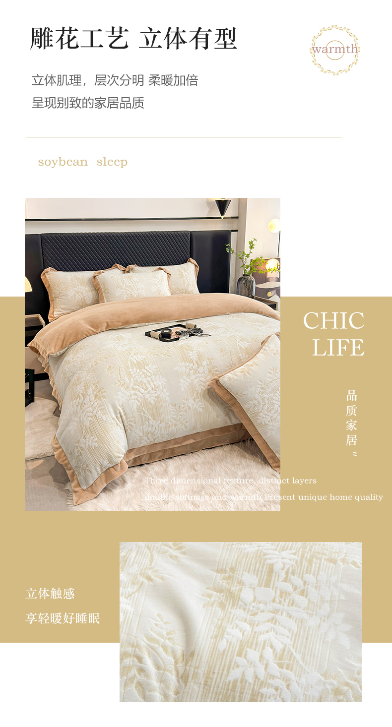 商品名称:梦精灵家纺 2025新款高克重加厚雕花牛奶绒四件套 瑞竹