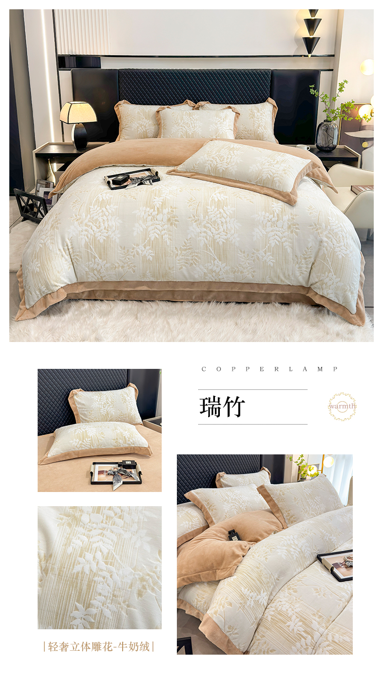 梦精灵家纺 2025新款高克重加厚雕花牛奶绒四件套 瑞竹