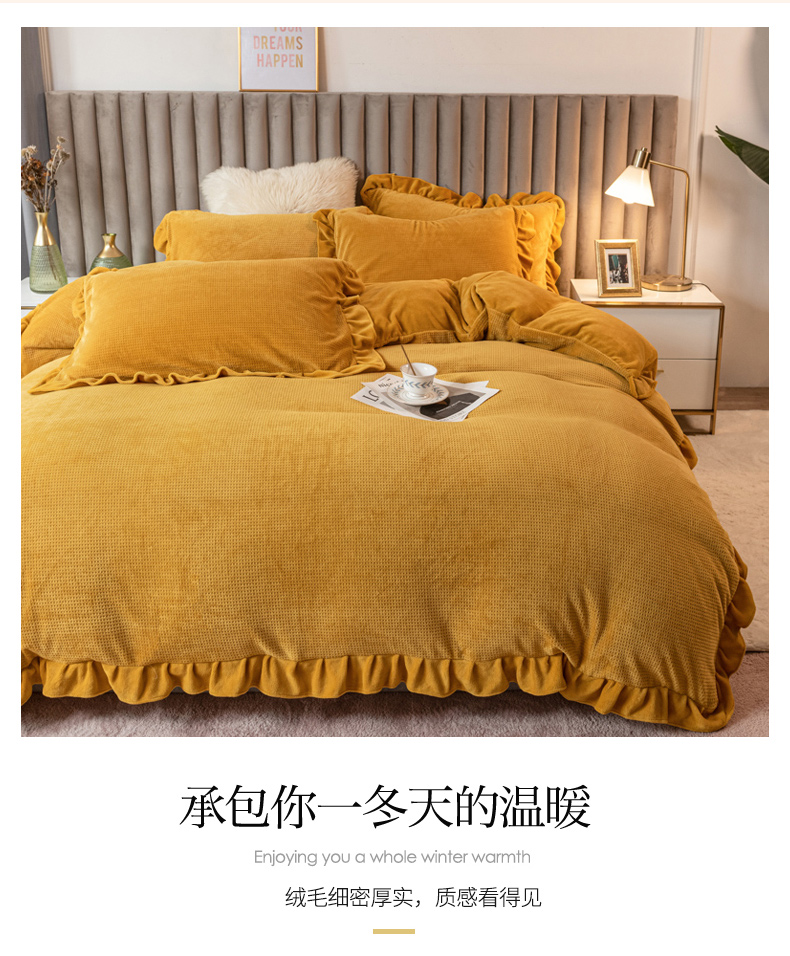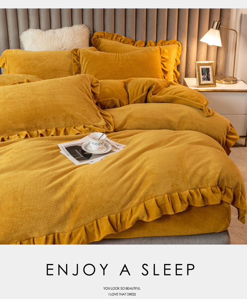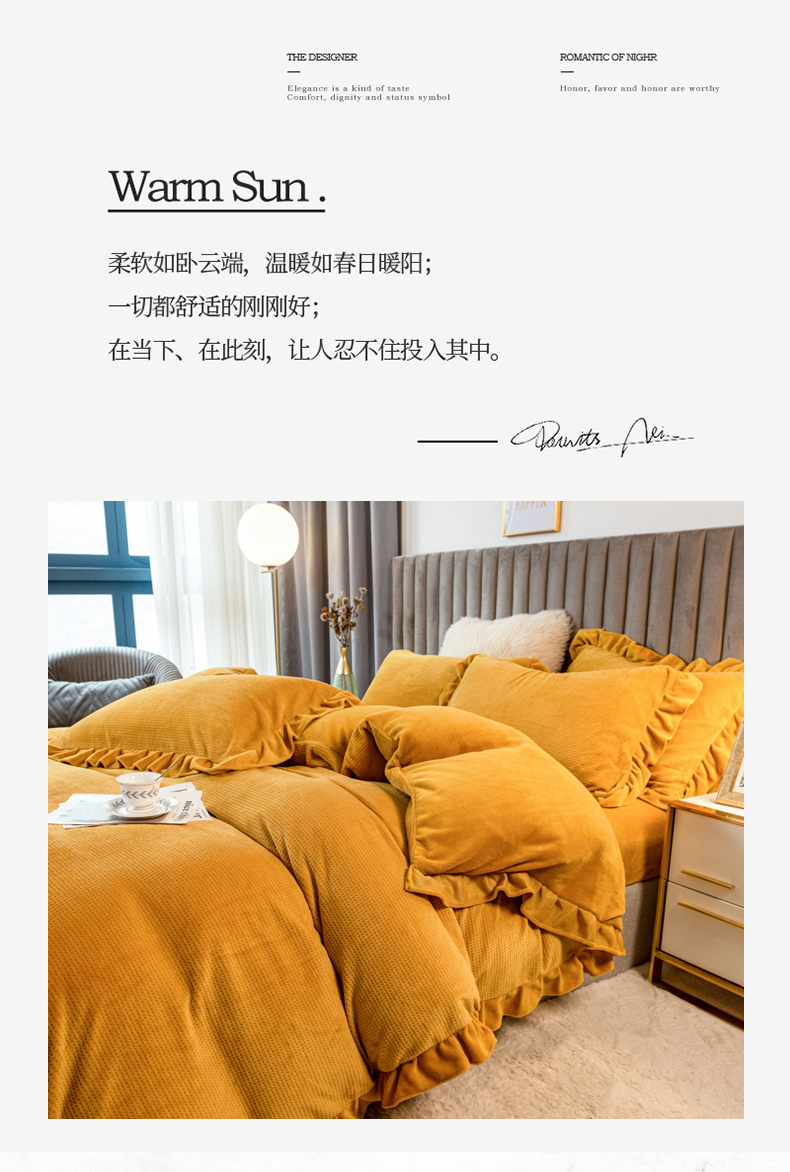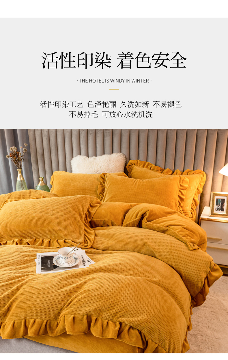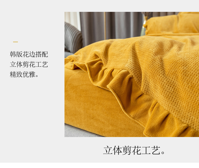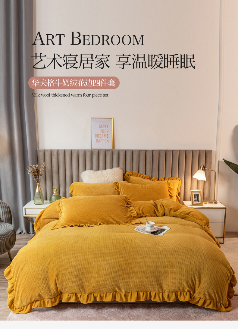 当前位置: 91家纺网 > 商品网购 > 床品套件 > 四件套 > 牛奶绒四件套 > 印季家纺 2025新款华夫格牛奶绒花边四件套 姜黄