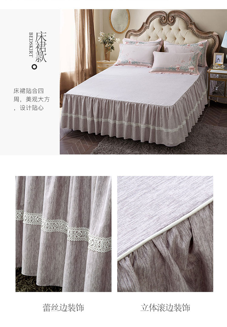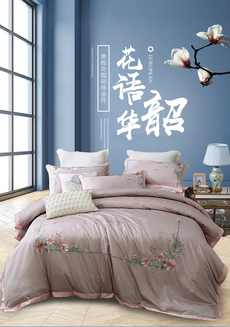 兴美佳100S澳棉高端绣花床单床裙床笠款四件套花语韶华烟灰粉