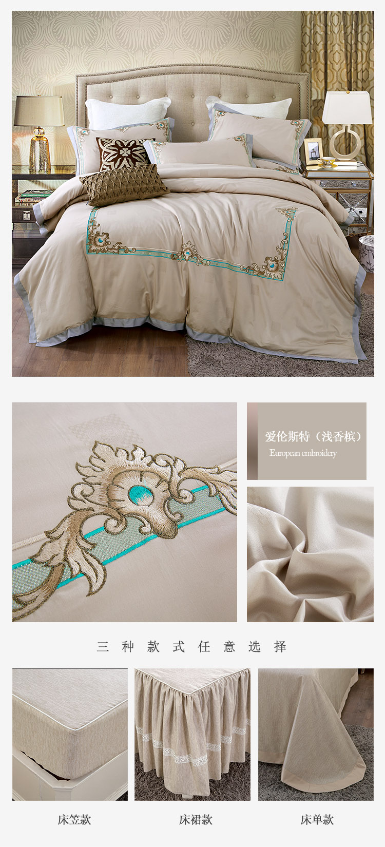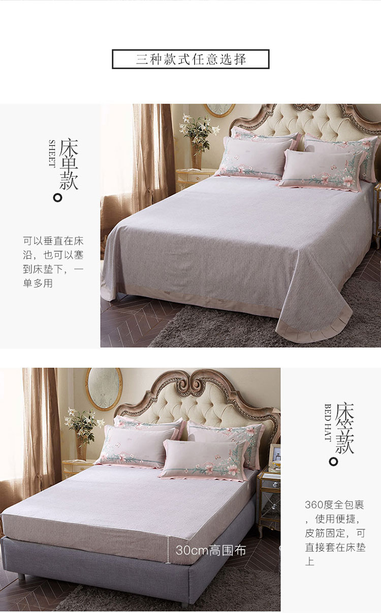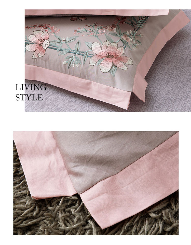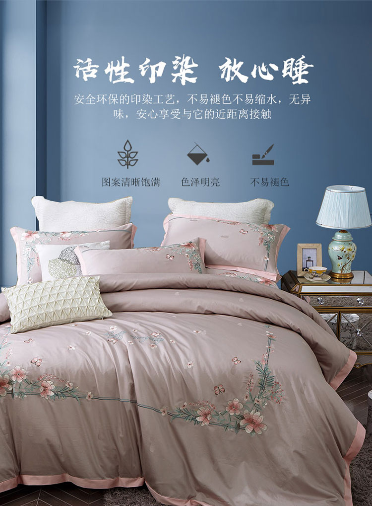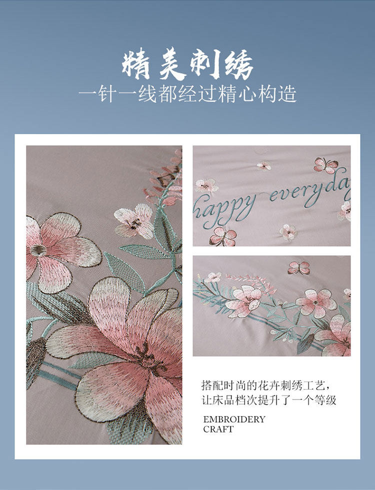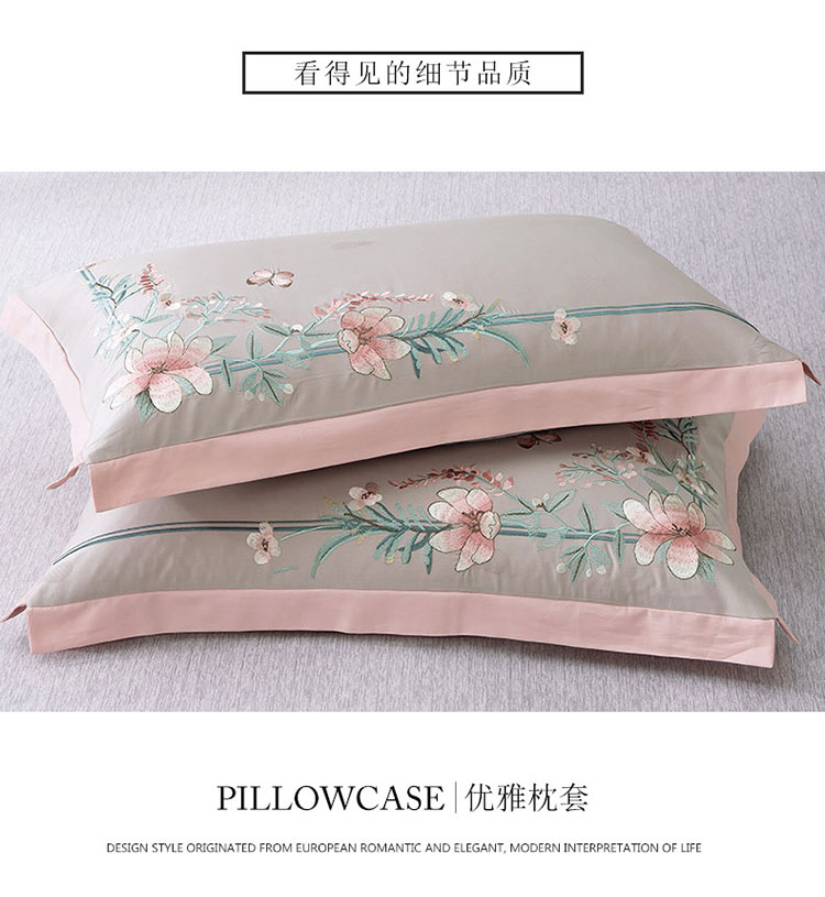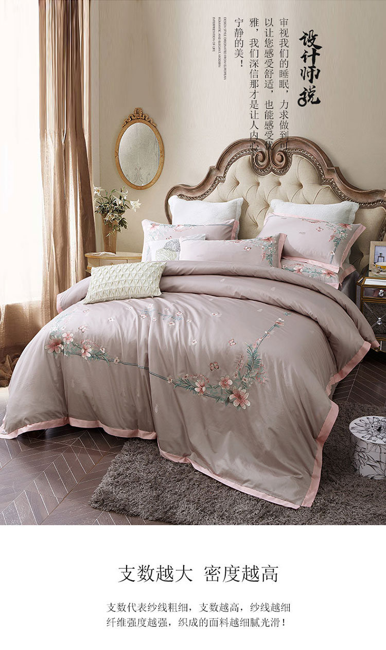 商品名称:兴美佳100S澳棉高端绣花床单床裙床笠款四件套花语韶华烟灰粉