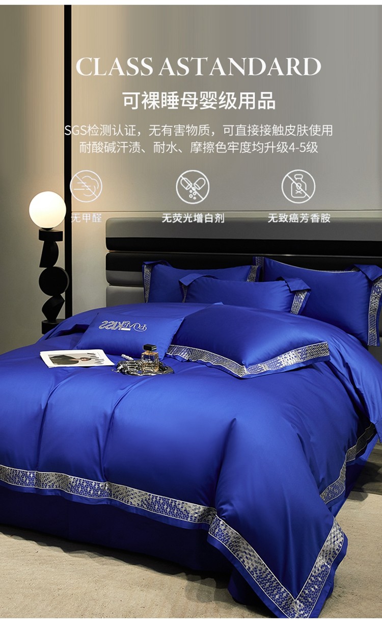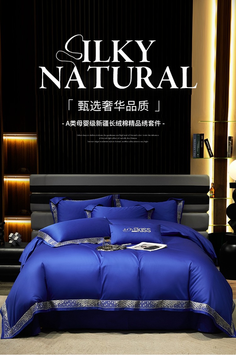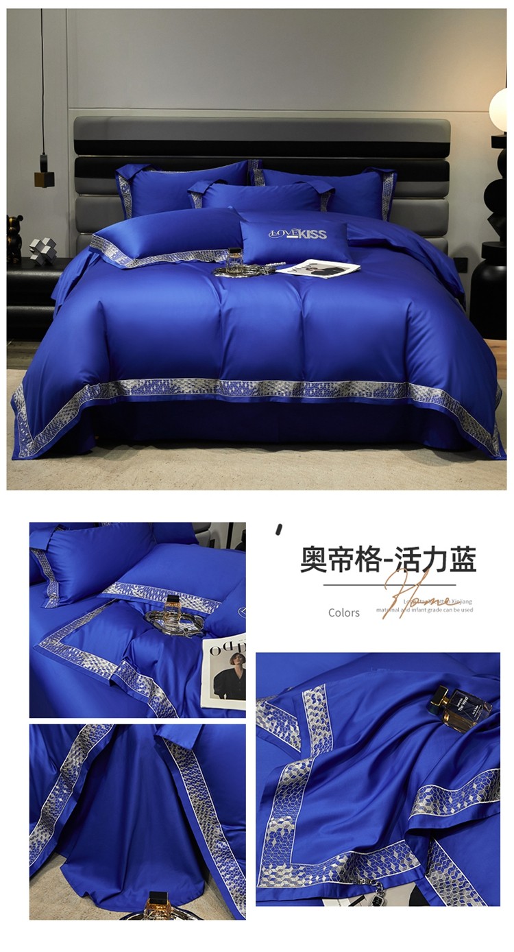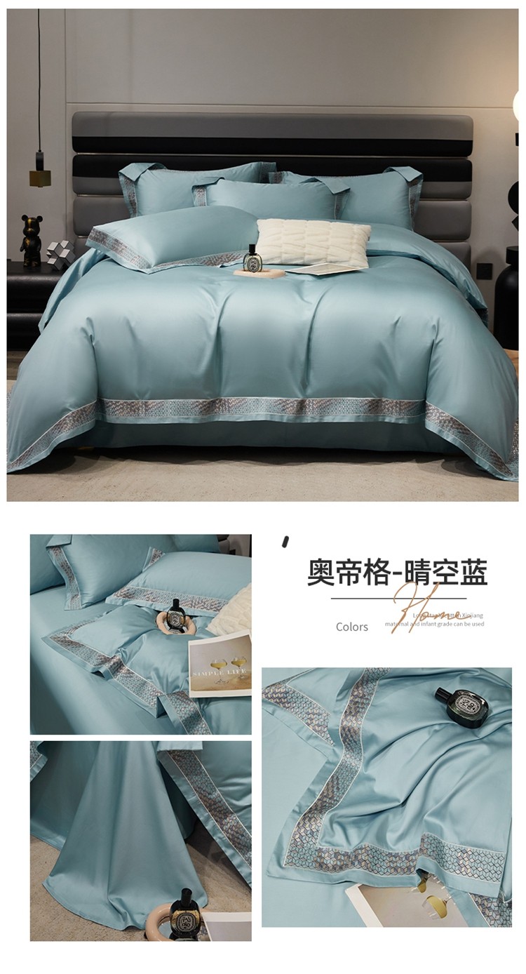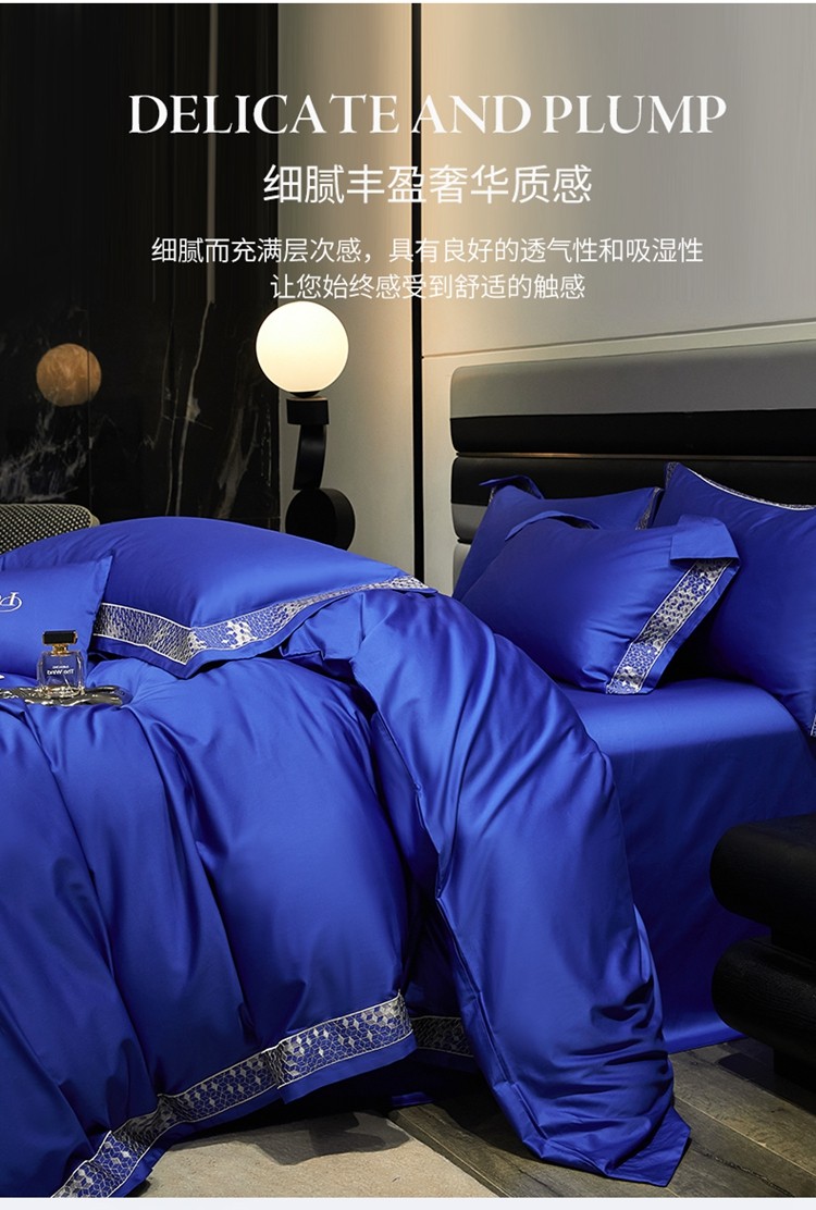 柔觉家纺 天丝刺绣贡缎提花全棉四件套,柔梦-海蓝